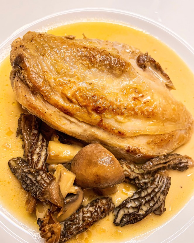 - Melt 25g of butter in a frying pan. Lightly brown the chicken breasts, season and sprinkle over the flour, cook for a minute and then add the vermouth, reduce by two-thirds.
