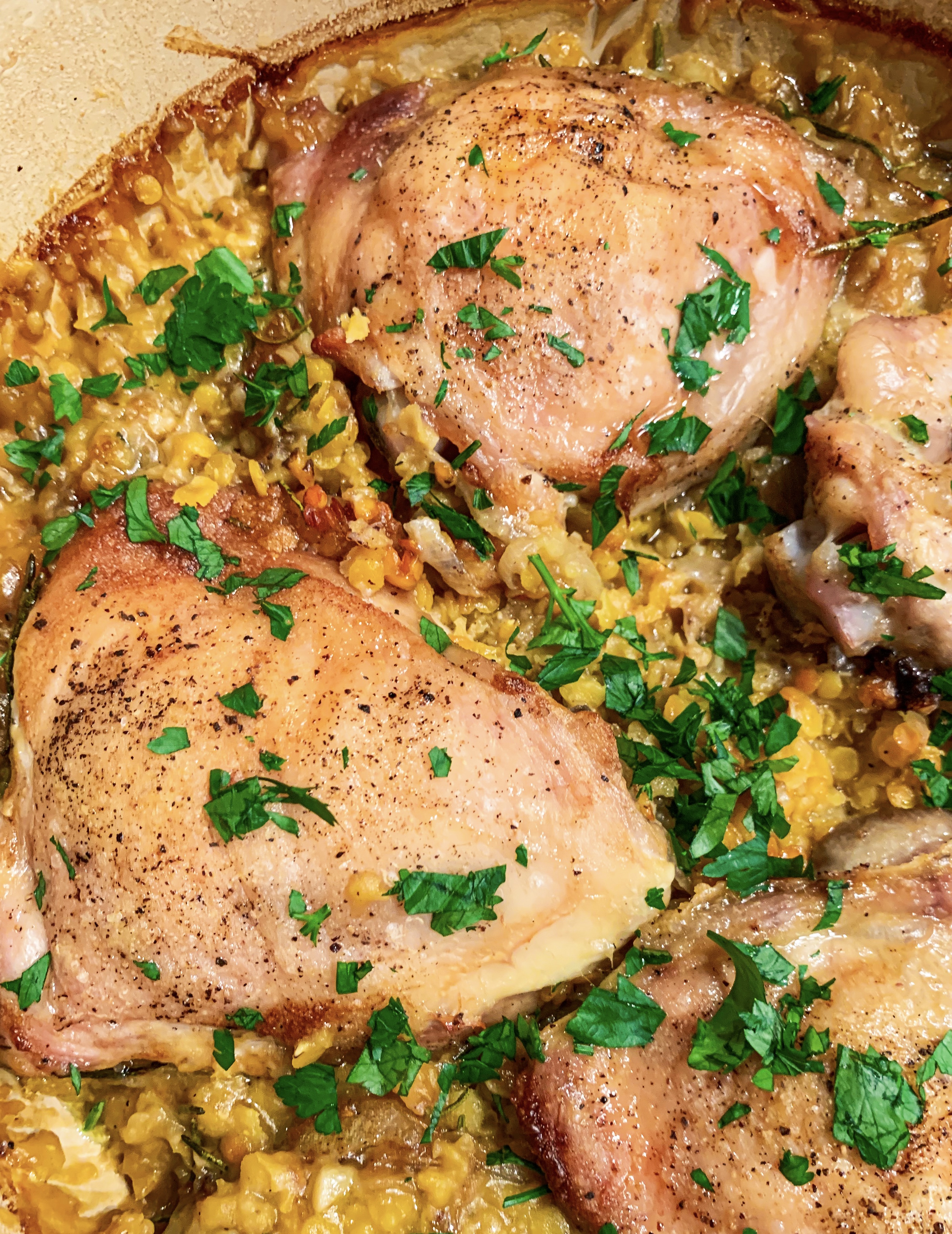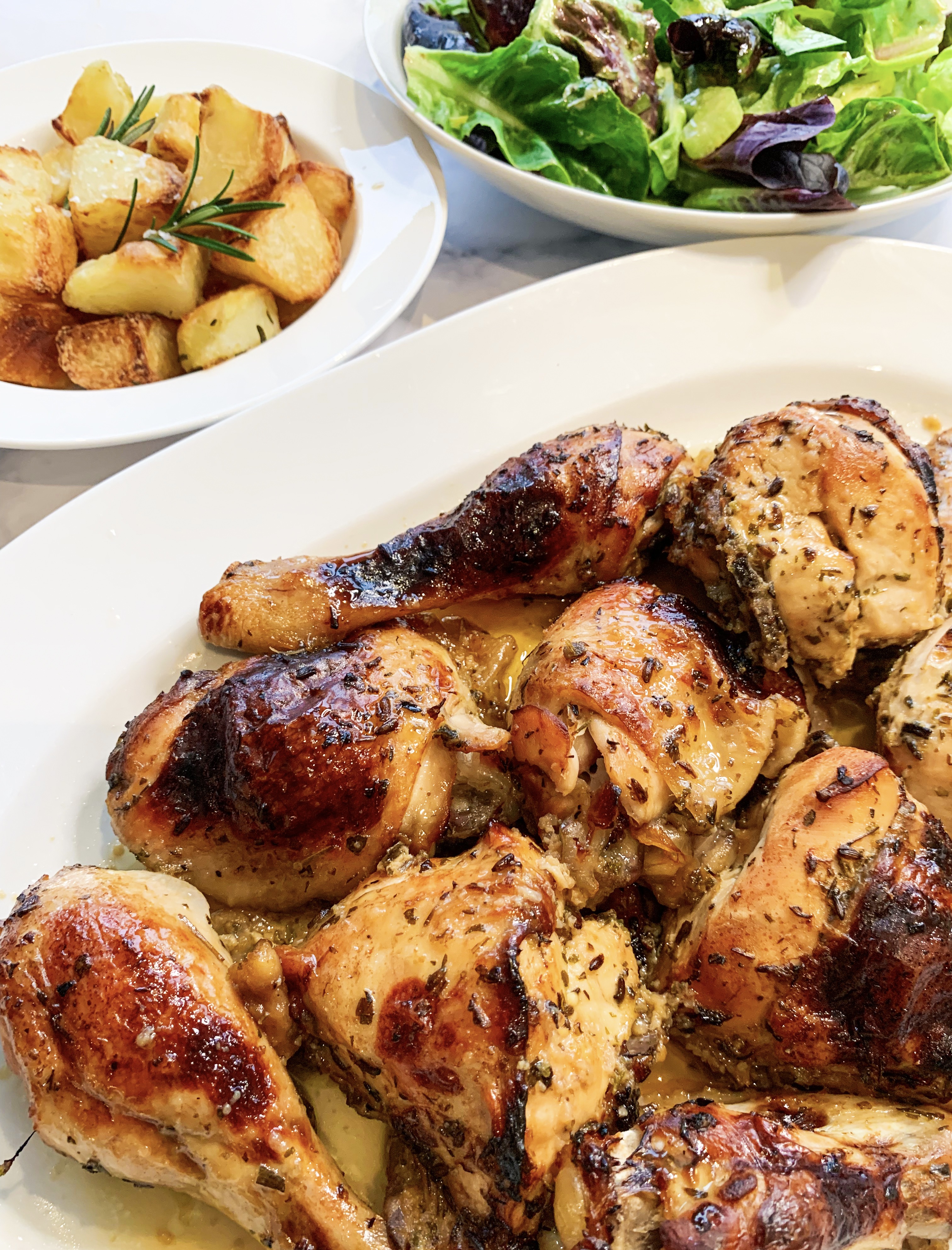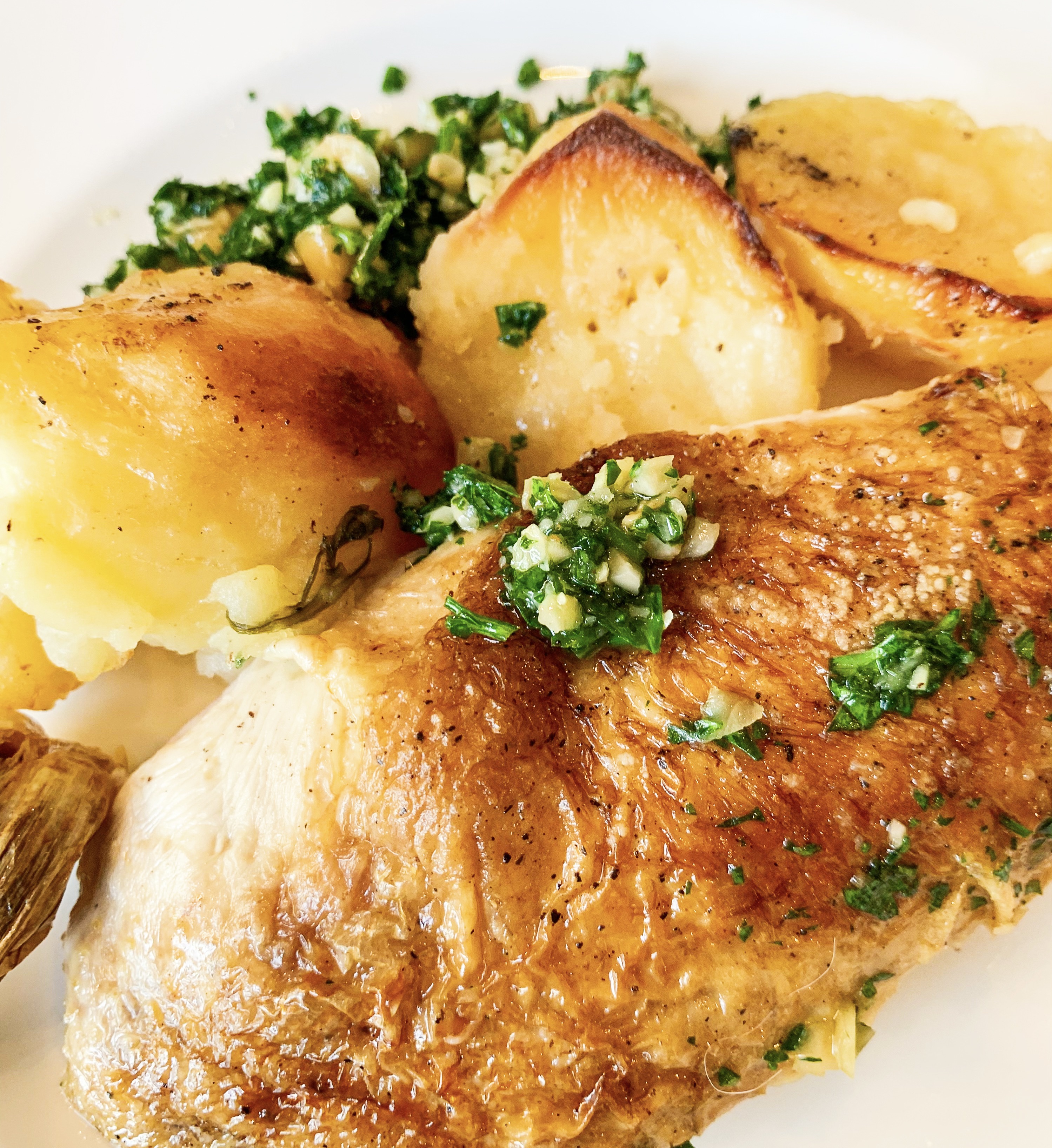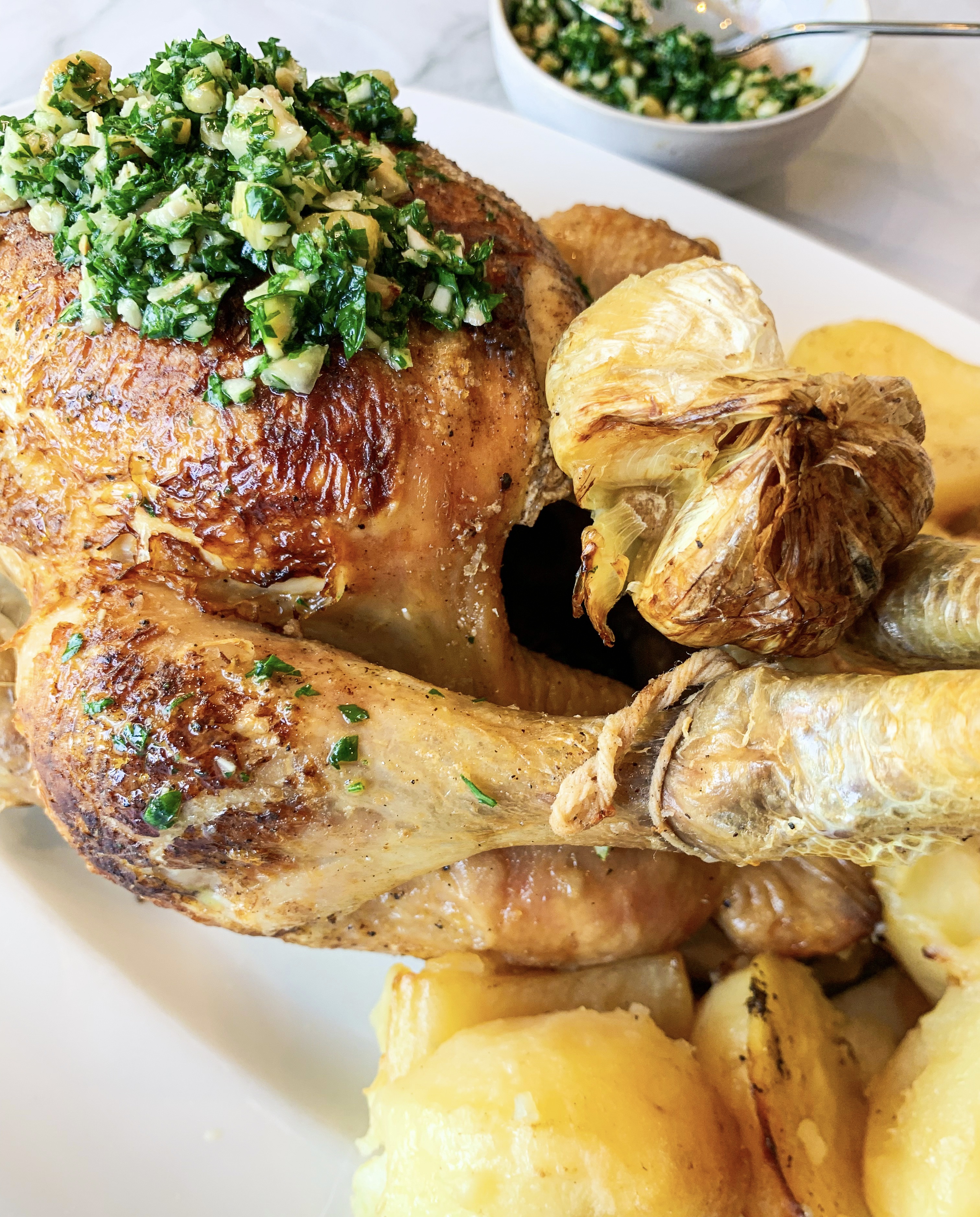 One Pot Chicken with Potatoes, Herby Salsa & Roasted Garlic (Serves 4)