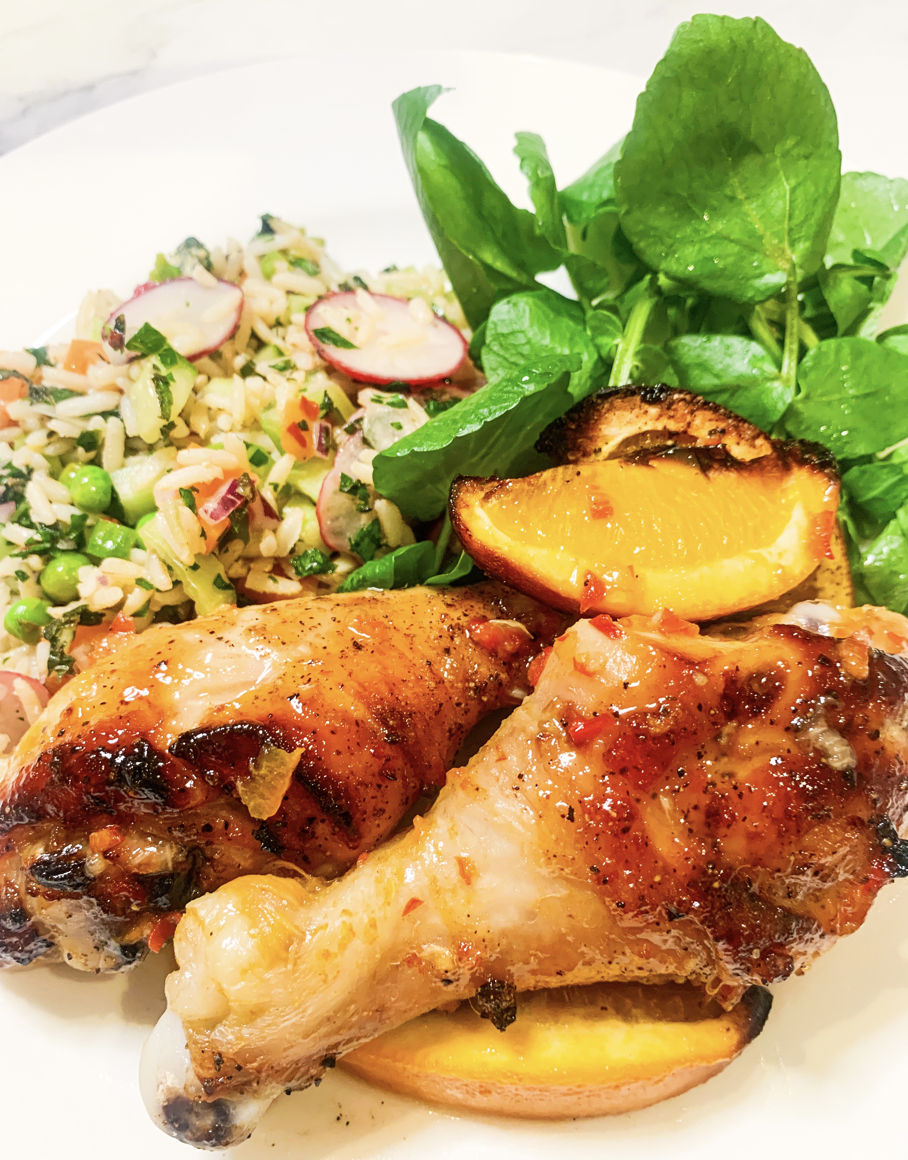 This is a recipe that I came across years ago in a magazine. Despite having chilli in it, it is not a spicy dish, as there is also honey in the marinade; I use orange blossom honey as it has a delicate floral flavour, great for a summer dish, but you could use any runny honey. The key to this dish is remembering to marinate it 24hours beforehand as it really makes a difference, other than that this dish sorts itself out – just pop it in the oven and serve with a large salad (and if you are really hungry some potatoes or rice).