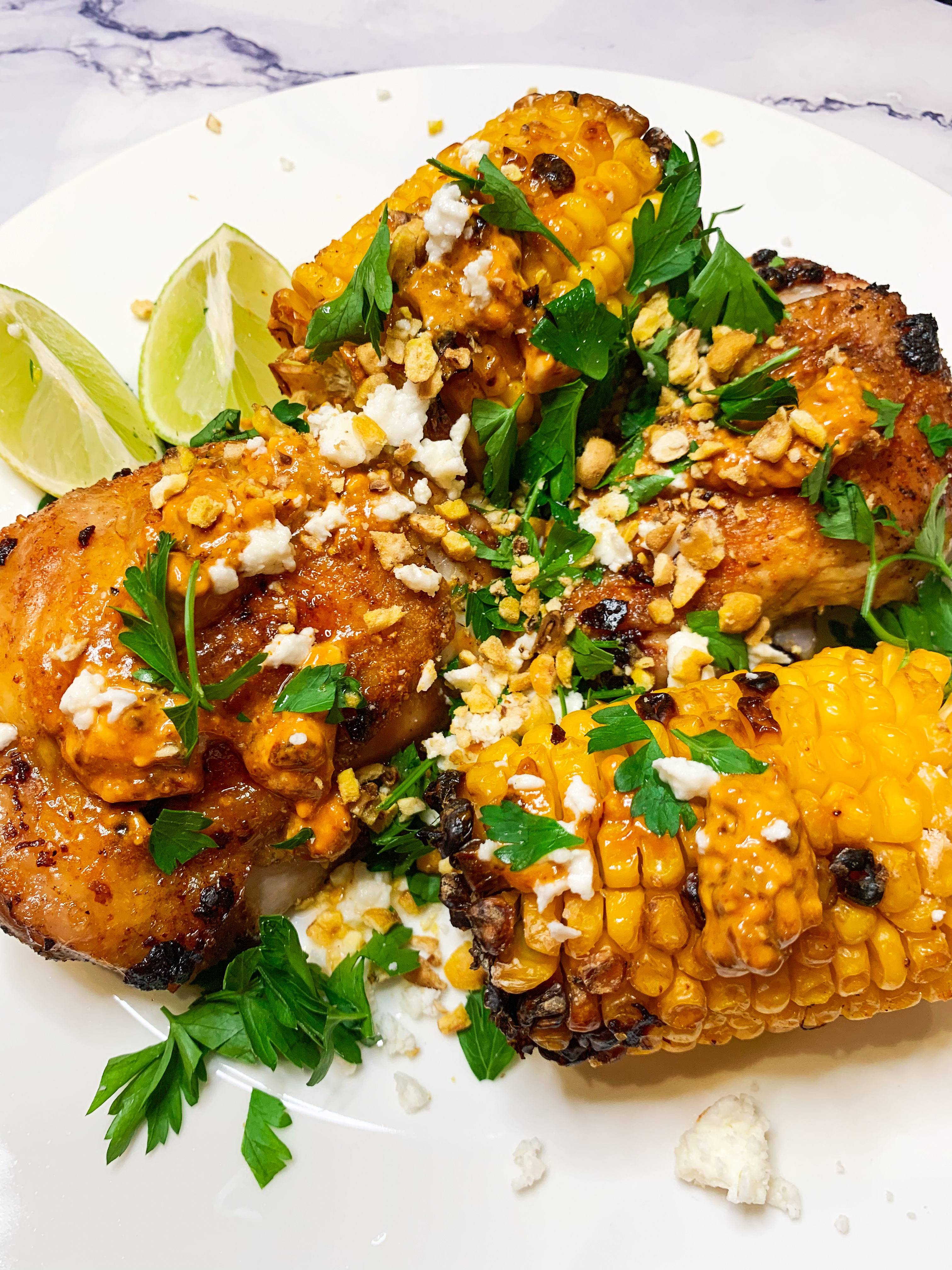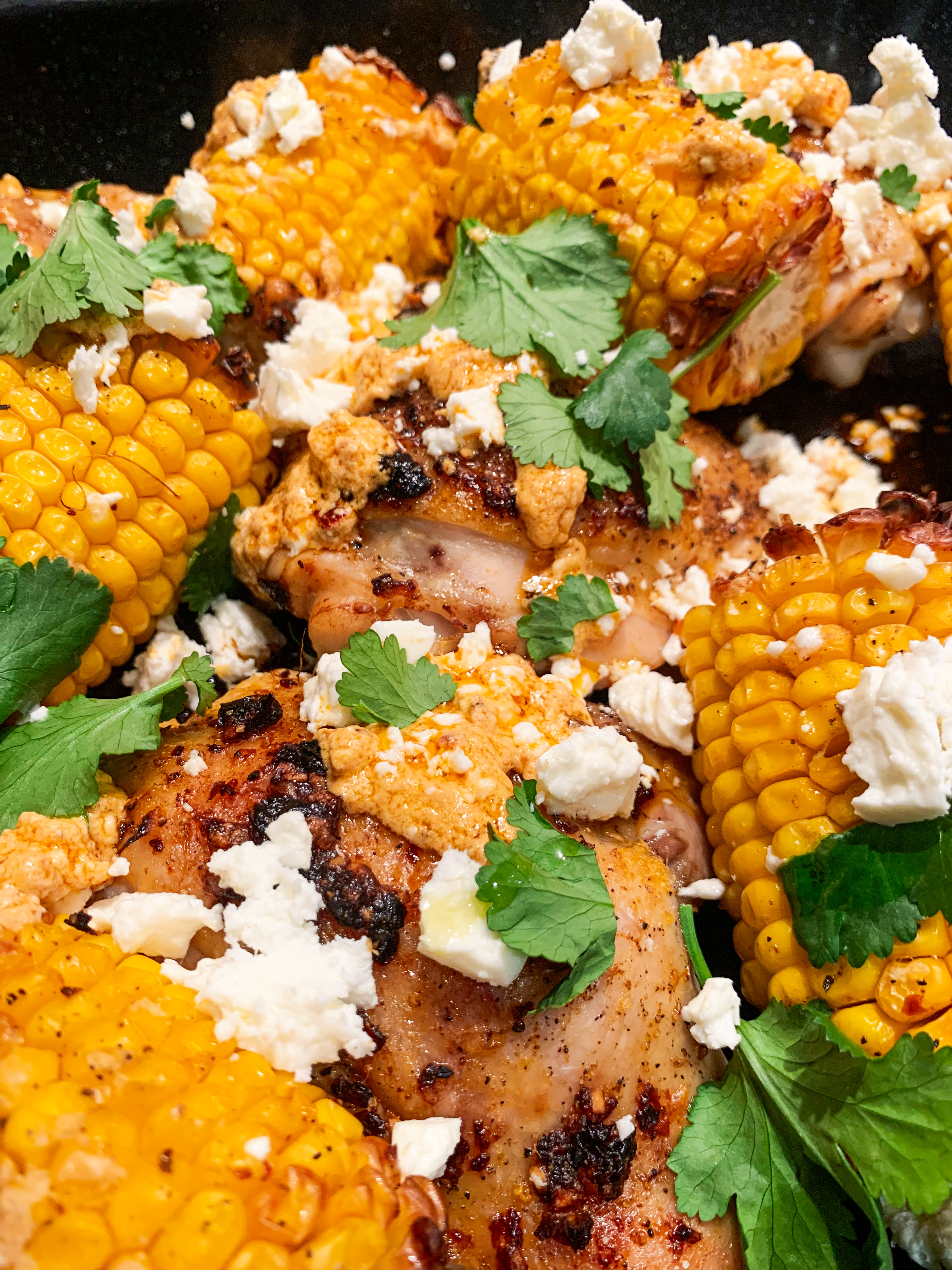 This is a take on the Mexican street-food preparation of sweetcorn grilled then basted with seasoned mayonnaise and dusted with freshly grated cheese, lime and chilli. Inspired by this finger-licking sweetcorn, Claire Thomson created this recipe for her cookbook, One Pan Chicken. With the addition of chicken, it really is finger-licking good and a recipe that is incredibly simple to prepare.