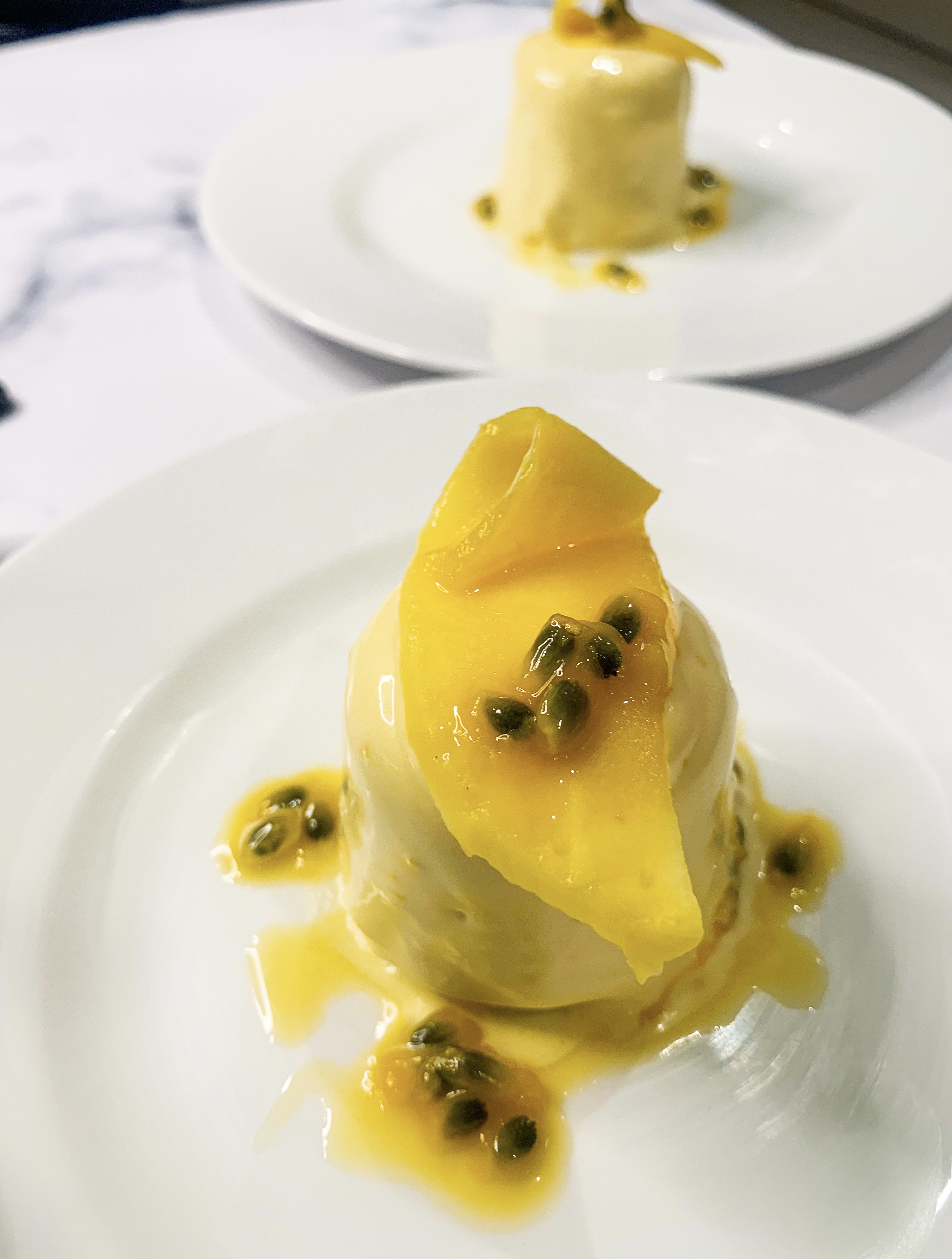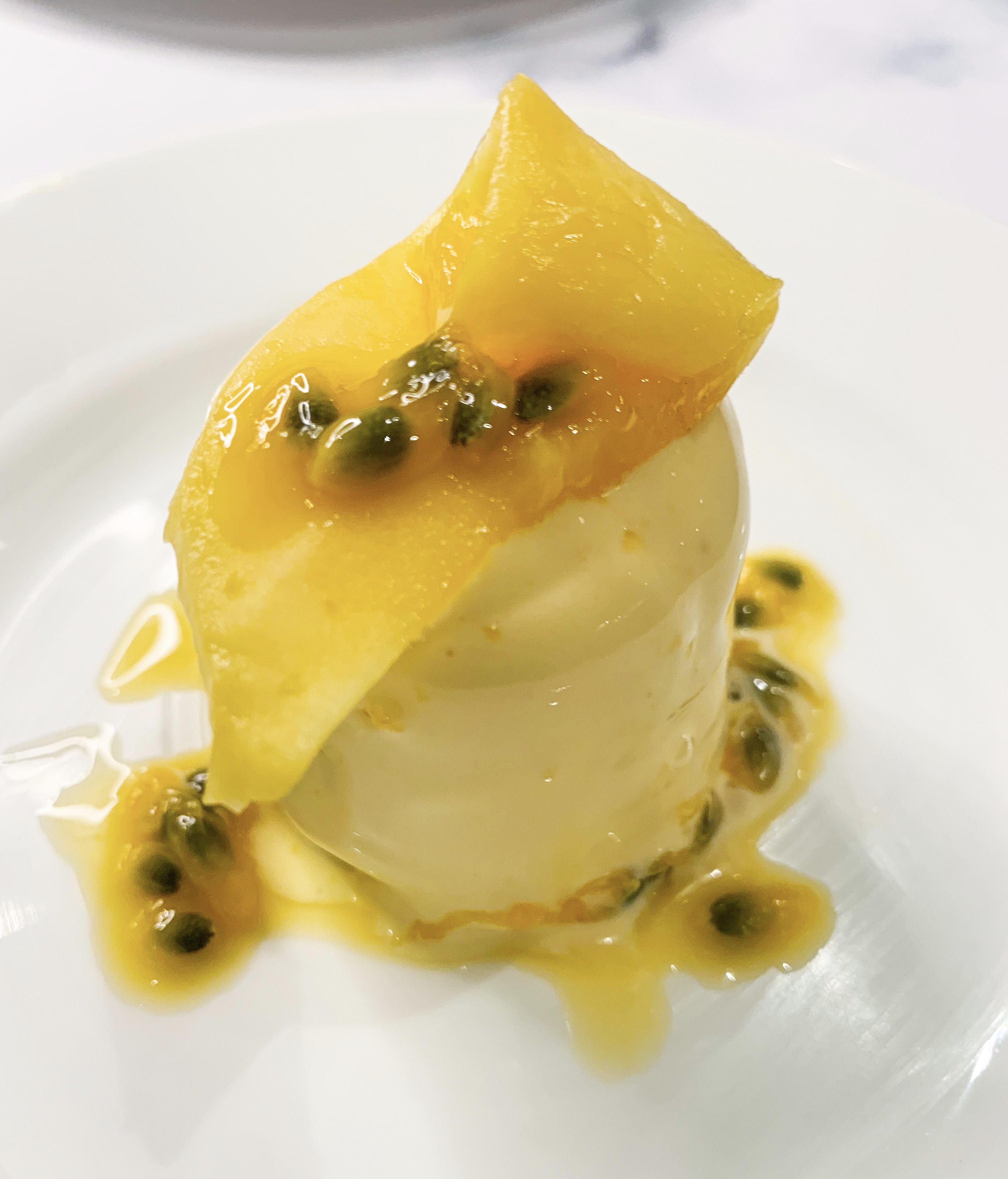 - To turn out each parfait, dip into a bowl of hot water for a second or two, invert the mould onto a plate, give it a light shake to release the parfait. Top each parfait with a folded mango slice and a few passion fruit seeds to serve.