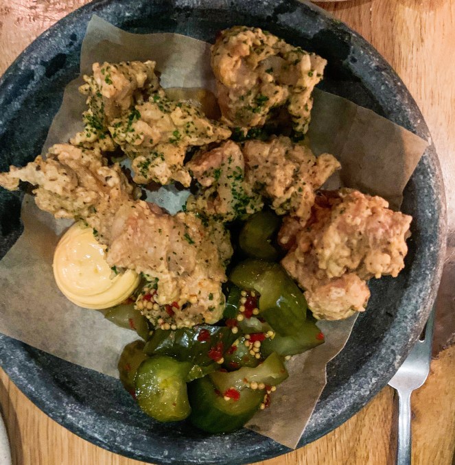By its own admission Daffodil Mulligan ‘embodies the heart, soul and mischief of the Irish, but with international food influences’, I was intrigued to see what this meant exactly!…I must admit on entering the restaurant I was a little sceptical, as it was rather like a modern American bar with tables, not my preferred choice of interior, whilst the ambience was quite lively and rather noisy. When seated at our table we were hit by how cold it was, and looking around we noticed that most people were wearing their layers – the woman seated near to me was wearing her partner’s jacket! When I asked the waiter if it was possible to turn down the air conditioning he apologised, saying that it wasn’t possible and that it was something to do with Covid(?) – I must admit I didn’t actually catch the full explanation as it was muffled by his mask!…Anyway I ended up wearing my leather jacket throughout the evening.