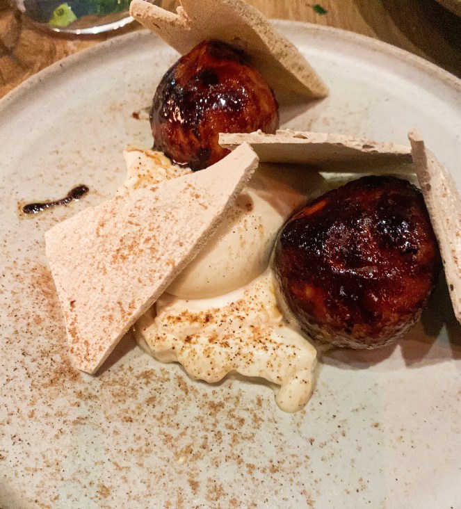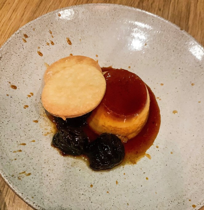 The menu has lots of small tasting plates as starters, in this way the restaurant is more suited to groups of friends rather than couples, as you really do want to share as many as possible – they all sounded delicious. Nick and I shared the Salt Chilli Chicken with Cucumber Pickles and Beef Tartare with Oyster Cream, they were generous portions; both were really unusual, delicious and moreish. For our main courses , I choose the ‘Hannan’s Sugar Spit Pork, Swiss Chard, Gochujang & Smoked Tomato’, the pork was seriously good, literally falling of the bone, it had a beautiful sweet, smoked flavour subtly spiced with the gochujang (the only regret I have is that my waiter didn’t advise me to order a side dish, which it needed, as it was literally just a piece of meat with a few leaves of rainbow chard). Nick chose the ‘Prawn Goan Curry with Ginger & Mango Salsa’, an unusual choice for him, one which the waiter had recommended as they had run out of the sirloin that he had wanted(!), it was good but not groundbreaking, probably not the best choice. Desserts were superb, I had ‘Wood Fire Fig, Brown Sugar Meringue, Mascarpone & Autumn Spice Ice Cream’ – the figs were unusually spiced and beautifully complemented by the brown sugar meringue, Nick had the fantastic ‘Caramel Crème with Tipsy Prunes & Sable’ – the prunes soaked in Armagnac were the winner here!.