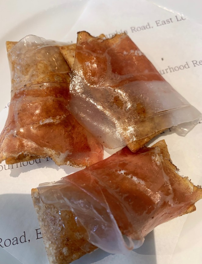 But forget the atmosphere, let’s talk about the food, and yes it deserves to be talked about! Owner/chef Tomos Parry takes his inspiration from the Basque region and apparently, there’s a touch of his Welsh heritage thrown in. The menu is a sharing affair, there is a choice of smaller dishes which would be ideal for couples or a solo diner, but to do the menu justice you’ll need at least three or four mouths so you can try a few dishes plus perhaps their signature dish, a whole turbot, which at £150 isn’t cheap but it feeds four people! Thankfully it wasn’t just Nick and I eating so as a table of four we were able to throw ourselves body and soul into the menu…