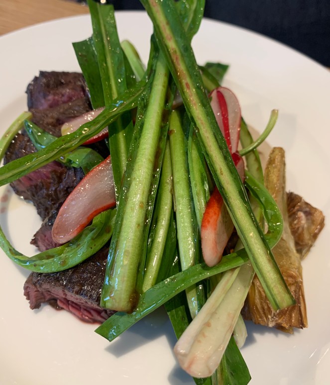 It was a particularly hot evening when we visited and on entering the dining room with its open kitchen and wood-fired grills, I feared the dining room was going to be too hot and stuffy. However, the beauty of the room is that with its high ceilings it has a wonderful airy atmosphere and its large windows bathe the space with natural light. Despite its wooden panelled walls, it has a modern industrial feel; it’s a little rough around the edges – a bit ‘New York loft-style… and yes, without overusing the word, it’s ‘cool’! It’s also rather noisy, there is a constant hum of excited chatter as each table shouts to be heard over the other – the atmosphere is buzzing. We were visiting with friends and I was quite pleased to be seated at a table for four which was tucked in a corner so offered some relief from the ‘frisson’!