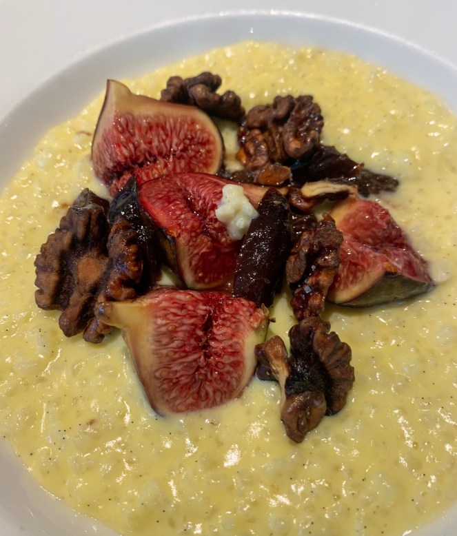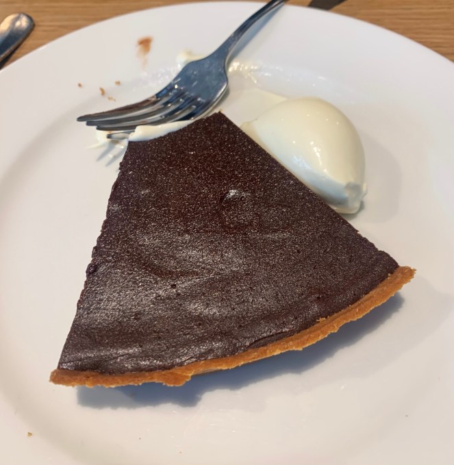 The menu is seasonal, with lots of interesting flavours such as the starter of ‘Raw Scallop, Almond, Apple, Sorrel & Horseradish’, which was delicious with beautifully balanced flavours. We also shared a platter of Coppa which was really fresh and flavoursome, and ‘Gnocco Fritto, Schiena’, little pieces of lightly fried dough also wrapped in Coppa, these were very light and moreish. For my main course I chose the ‘Partridge, Rainbow Chard, Quince, Lentils & Pancetta’, it was good, the quince really held this dish together with its slight sweetness which complemented the saltiness of the lentils, however, I must admit to having ‘plate envy’ for Nick’s chosen course, ‘Onglet, Fried Violet Artichokes, Shallots, Anchovy & Chicory’, the flavours of this were divine; the deep fried artichokes particularly stood out. Finally desserts, an amazing ‘Chocolate Tart’ – the fondant was smooth whilst the pastry base was crisp and light, and a ‘Vanilla Rice Pudding, Figs, Walnuts & Boozy Prunes’ – need I say more?…it was a perfect autumn afternoon hug!