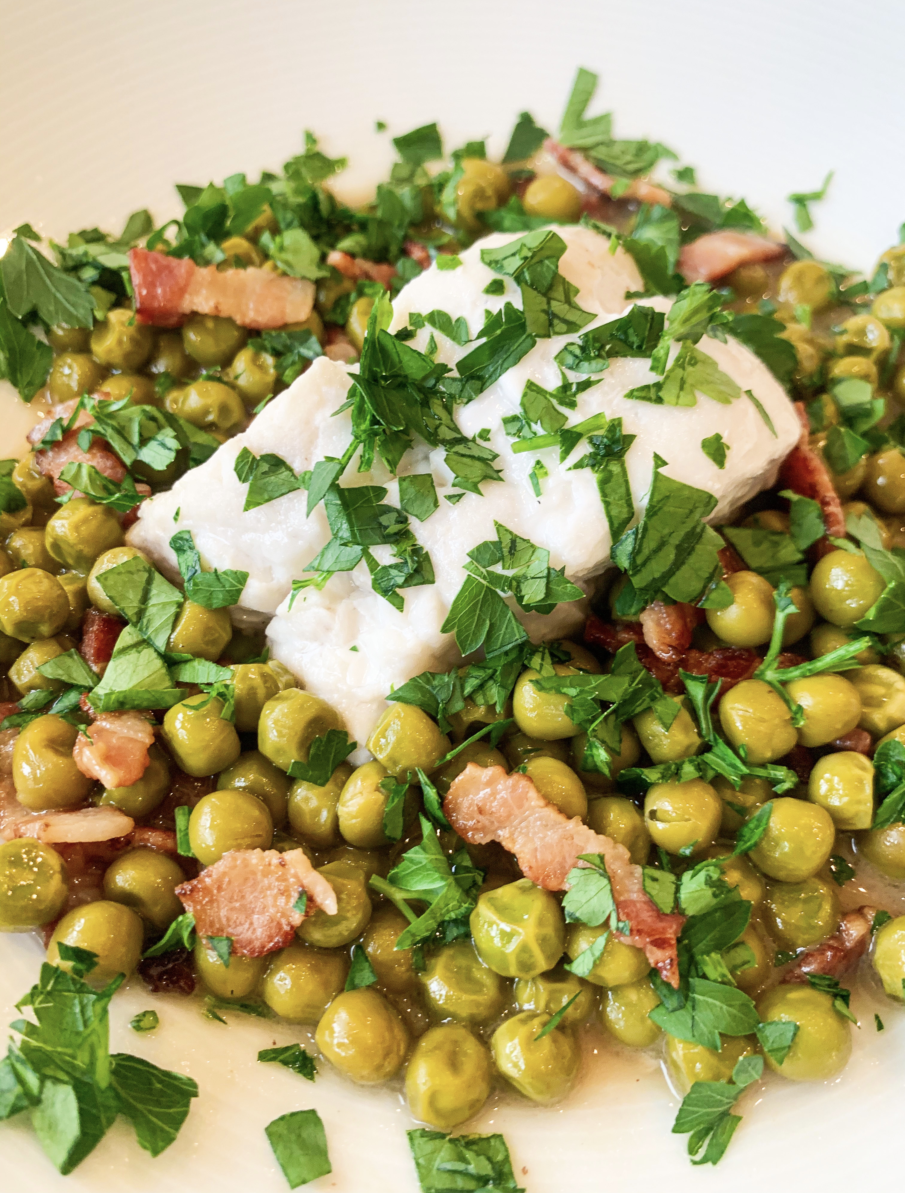 - Place the fish fillet on a plate. Stir most of the parsley through the peas and bacon in the pan (check the seasoning), then spoon it around the fish along with the lovely cidery juices. Sprinkle with the remaining parsley and serve, simply steamed new potatoes are delicious with this dish!
