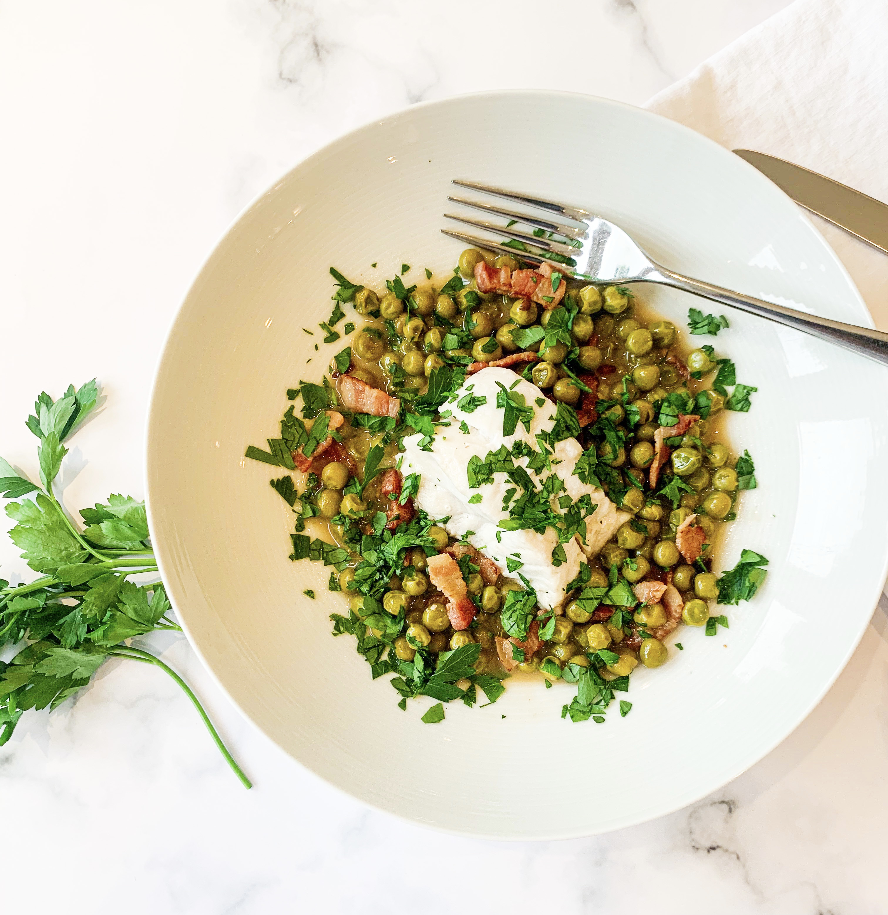 - Heat the olive oil in a pan (with a lid), fry the bacon until crisped and golden, then add the frozen peas, give them a good stir.