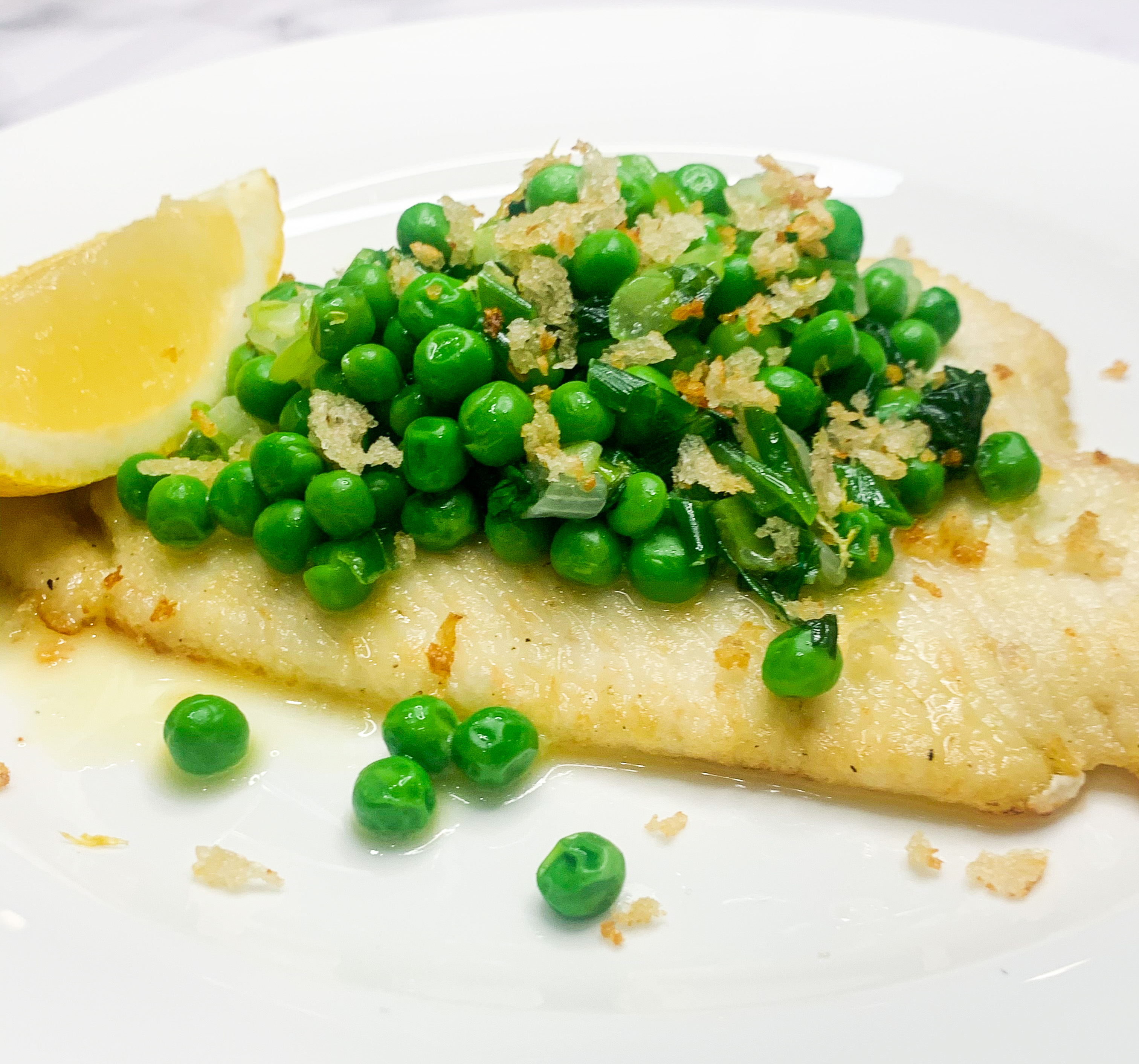 - Place the lemon sole on a plate, spoon over the pea mixture and, if using, sprinkle with the toasted breadcrumbs, serve with a wedge of lemon on the side and some steamed new potatoes.