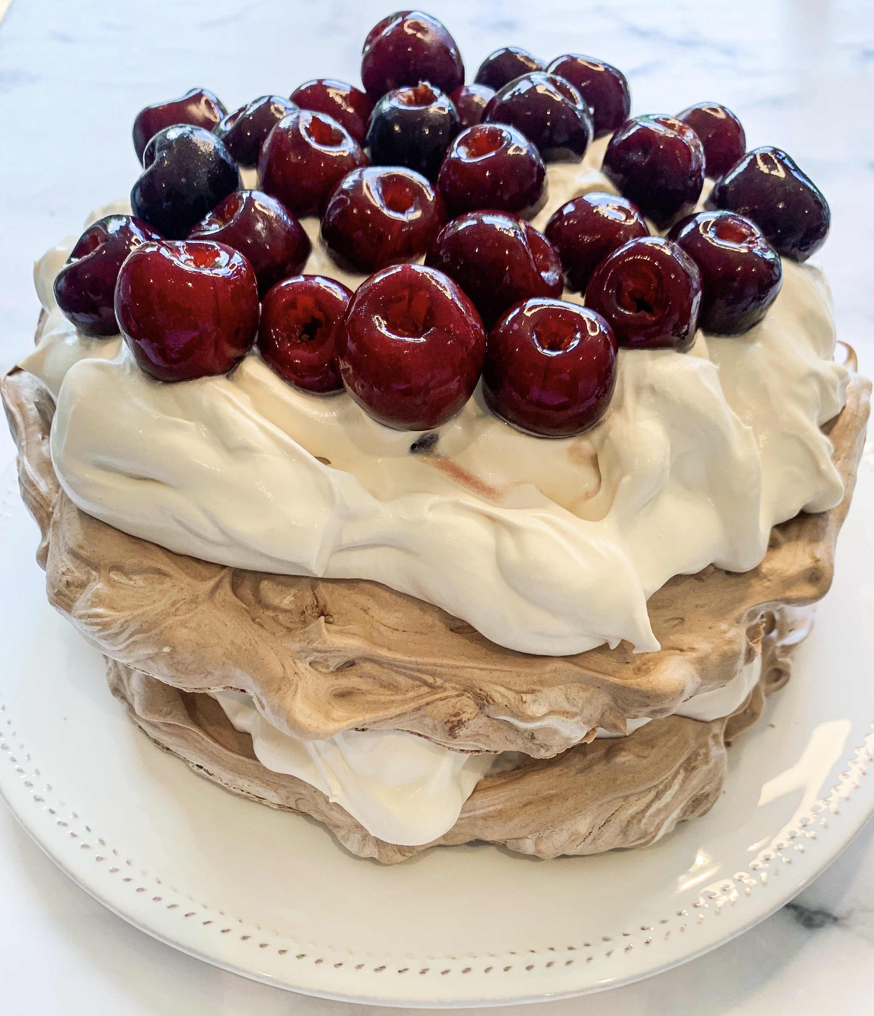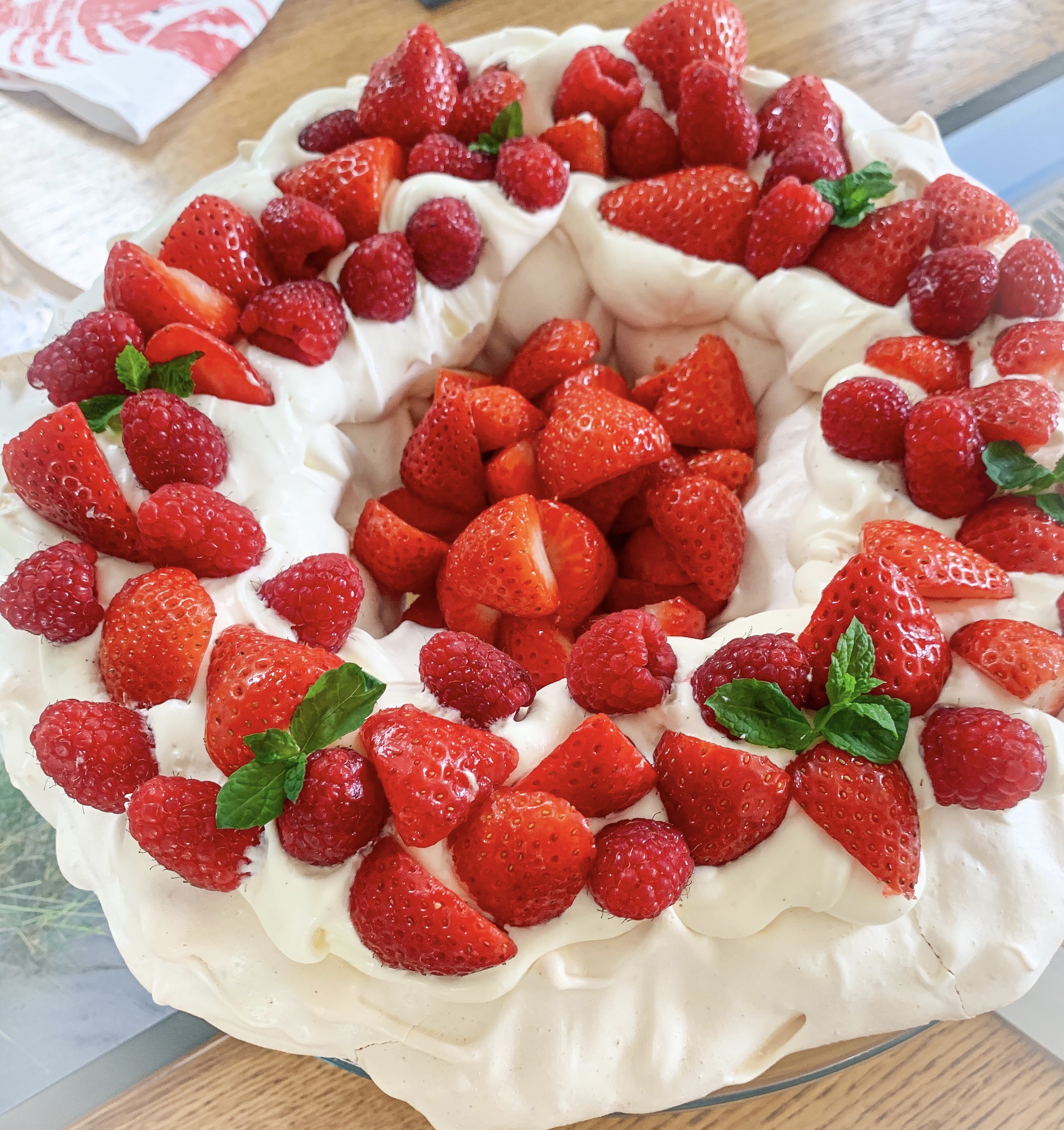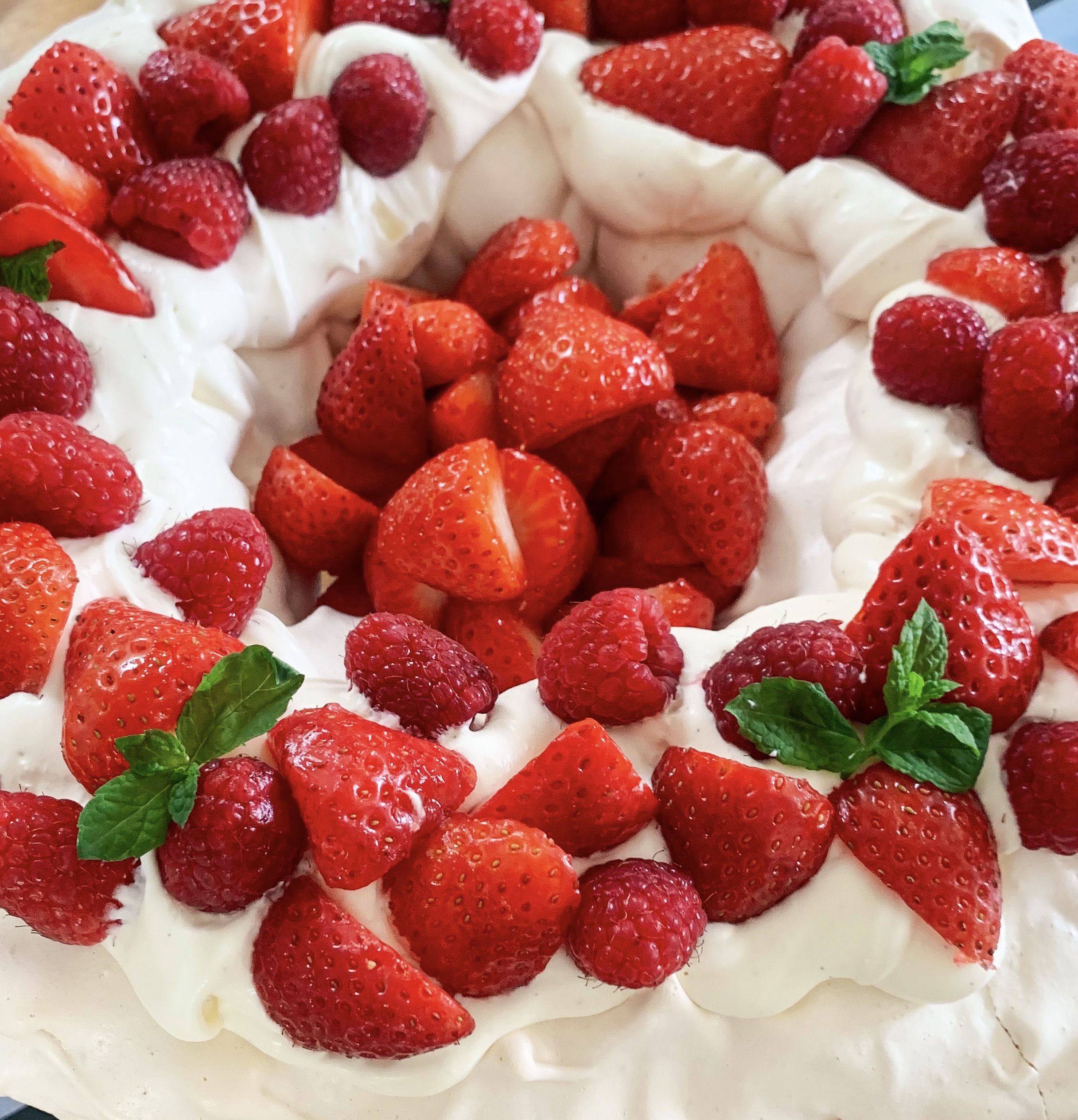- To assemble, whip the cream, vanilla paste and icing sugar together until stiff peaks form. Spoon the cream in the trench of the pavlova and top with the berries and decorate with the mint leaves (if using). Finally sprinkle with icing sugar. Delicious!!