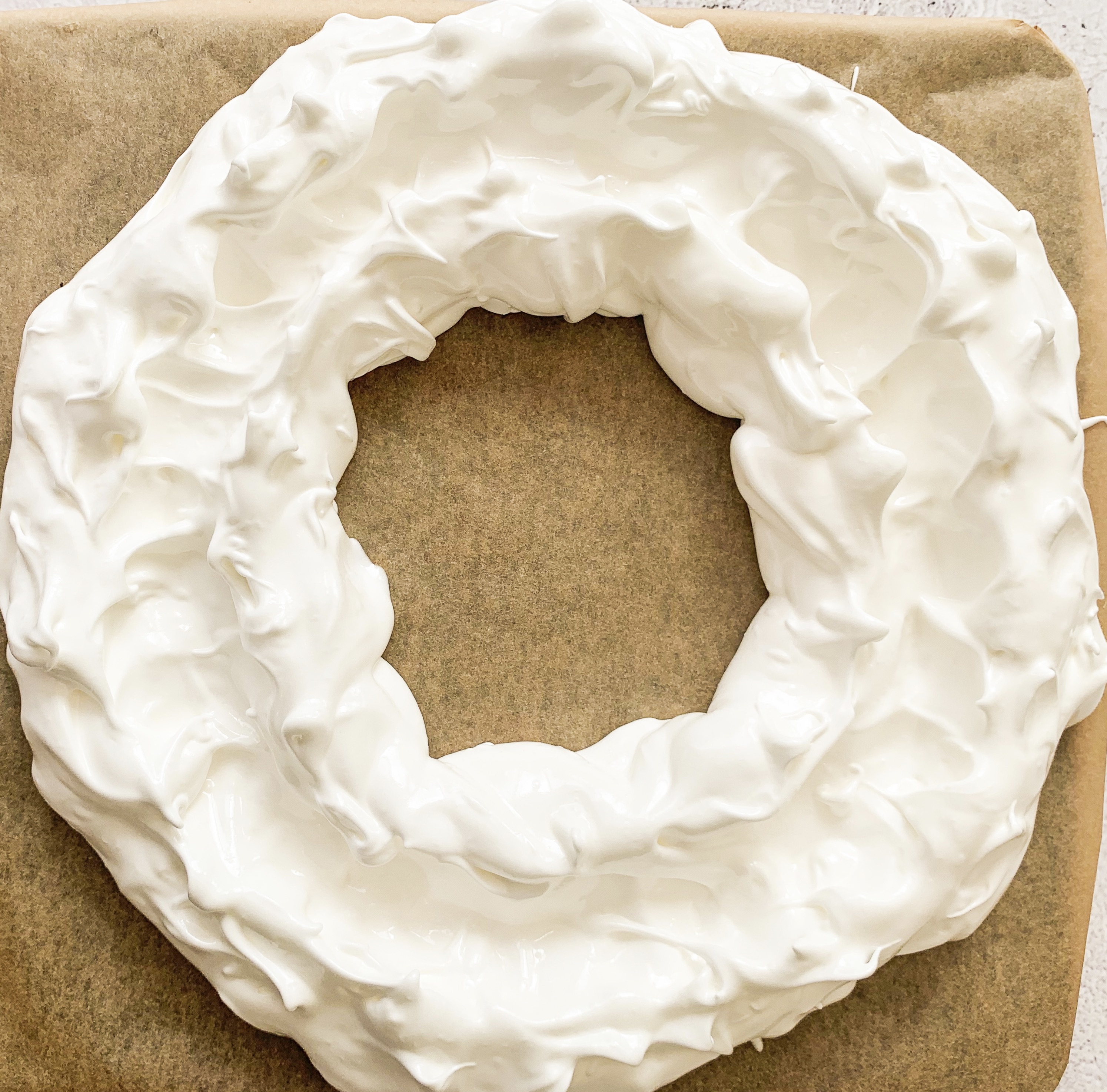 - Spoon the meringue mixture onto the ring drawn on the parchment. Using a spoon to make a shallow trench in the meringue for the cream to sit in – see photo above.
