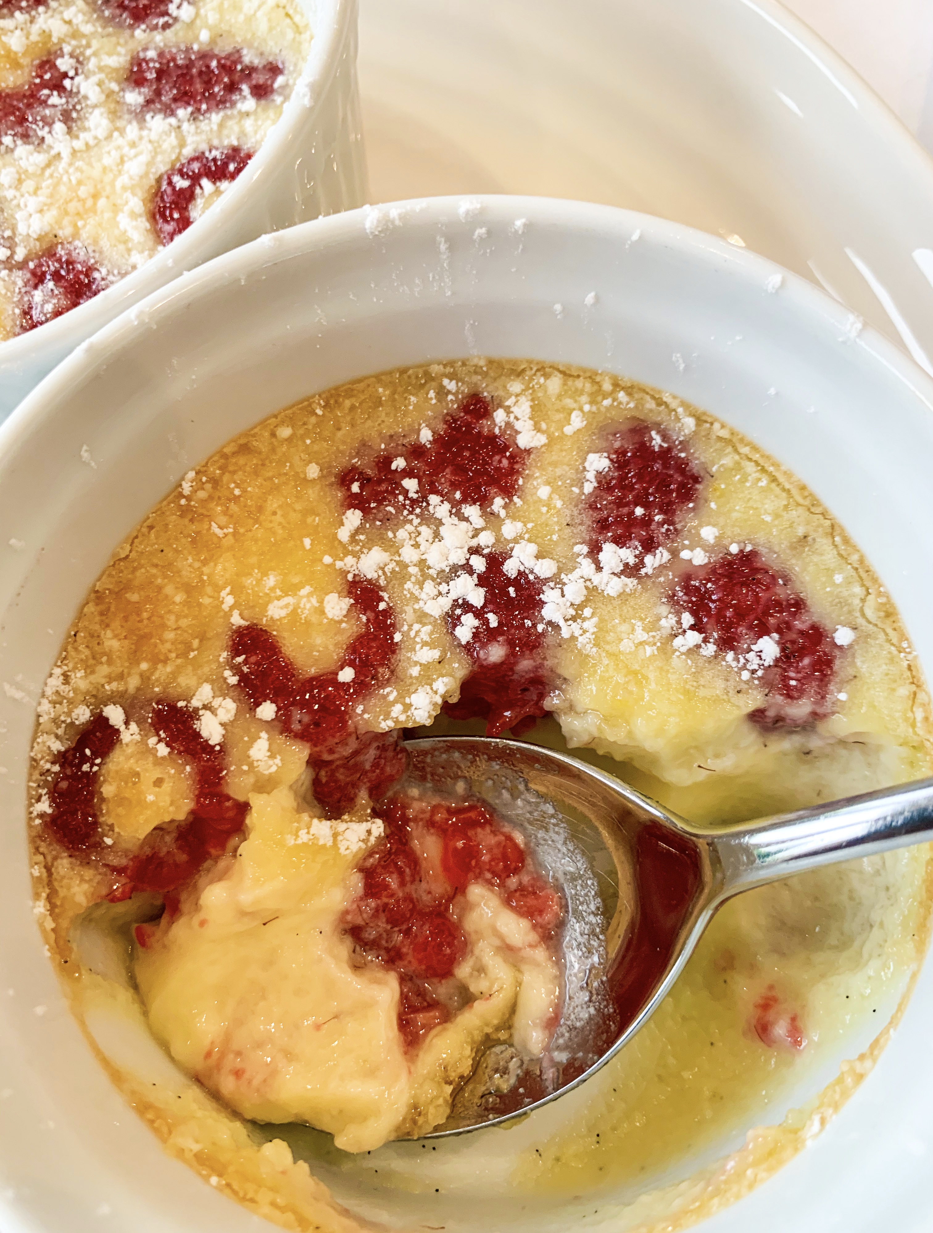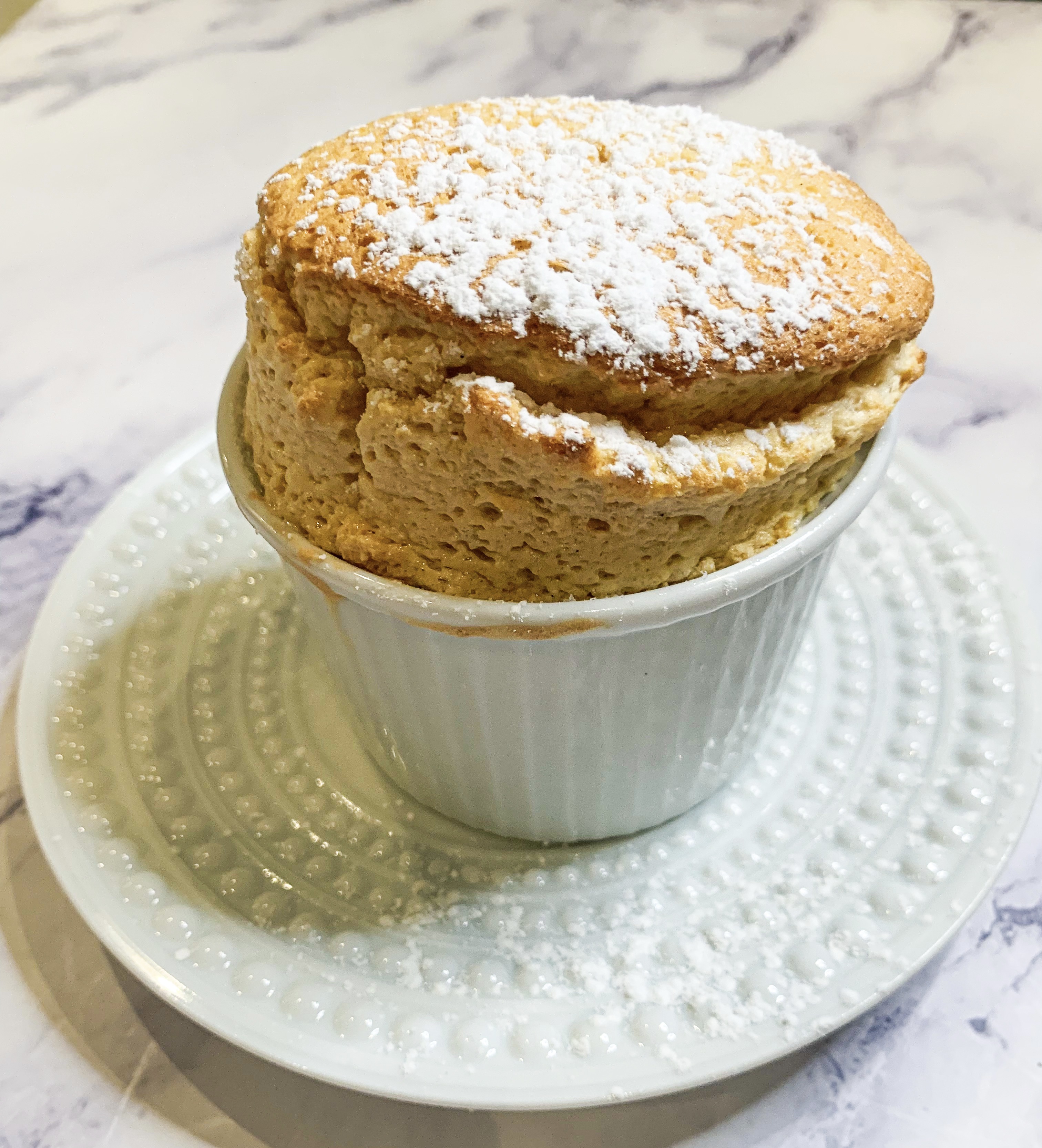 - Remove the soufflés from the oven dust with icing sugar and serve immediately with the warm sauce – it’s a good idea to make sure your guests are seated at the table so you can serve them the moment they come out of the oven so that everyone can appreciate them in their full ‘risen’ glory!