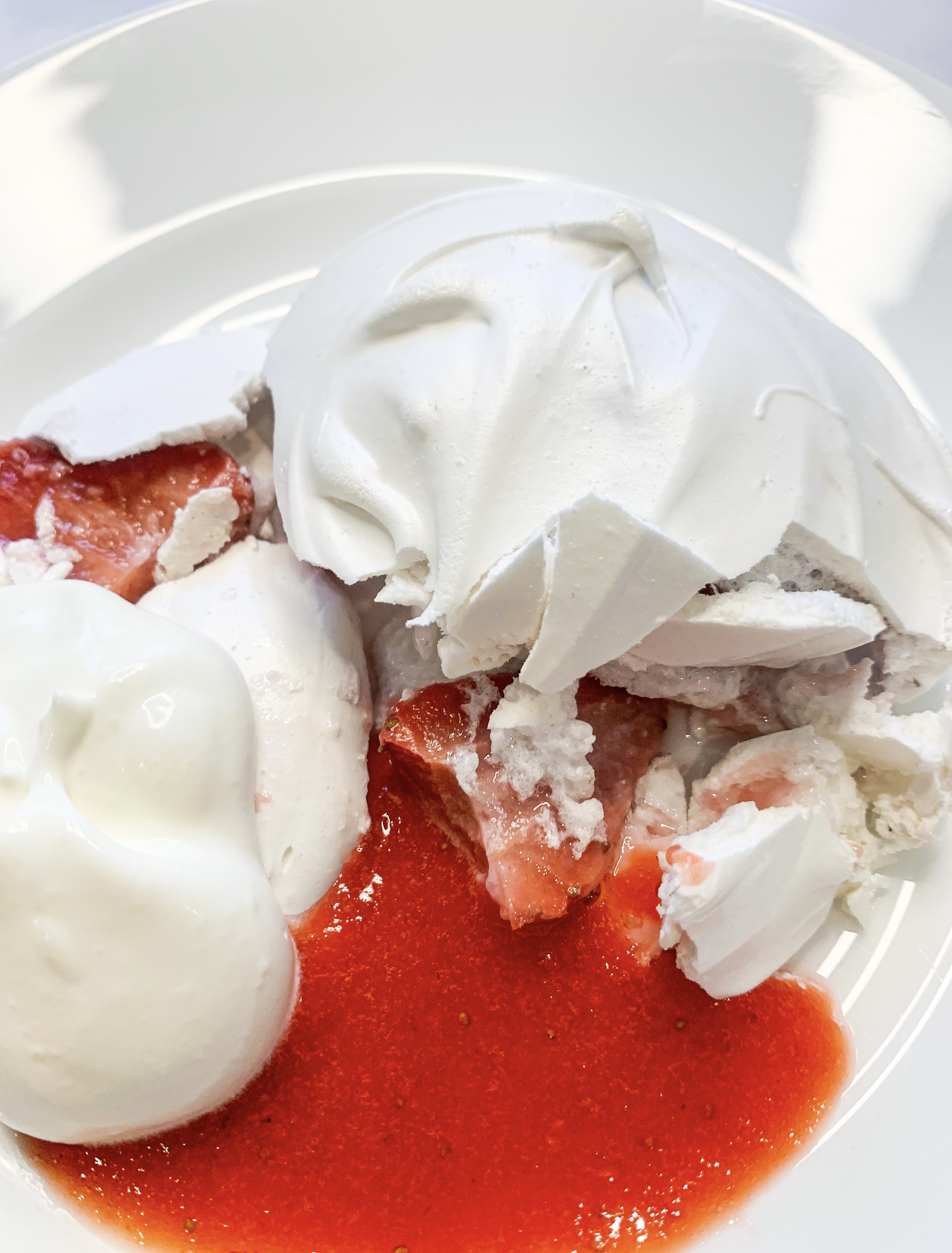 - To assemble (see note above): in a bowl, gently mix the meringues and strawberries (reserve a few for decoration) into the cream and gently fold in about 2 tablespoons of the purée.