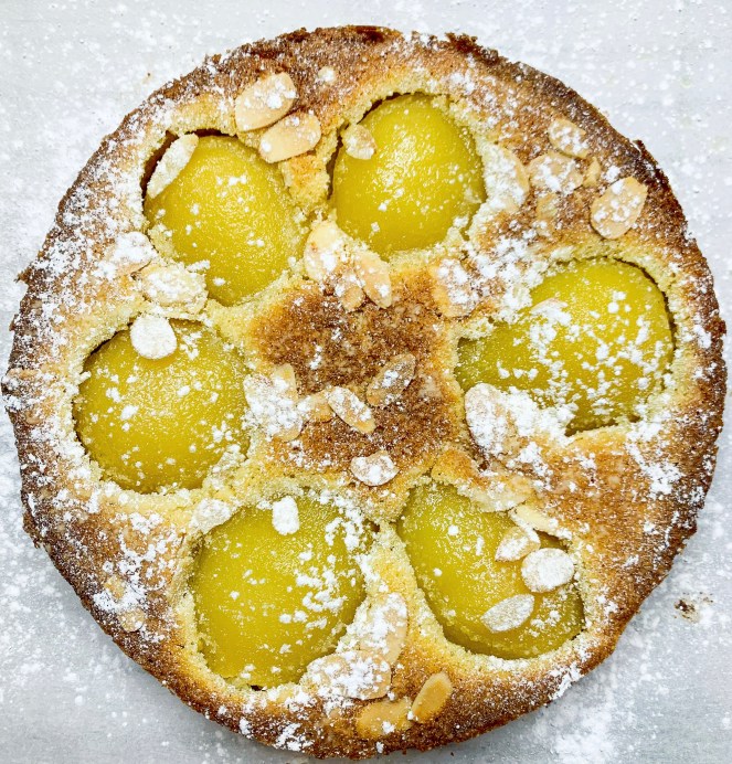 - Place in a preheated oven, 200’c fan and cook for 10 minutes, then turn the temperature down to 180’c for 40 minutes. Remove the golden brown tart and allow to cool in the tin for at least 30 minutes before transferring to a serving plate. Dust the top with icing sugar.