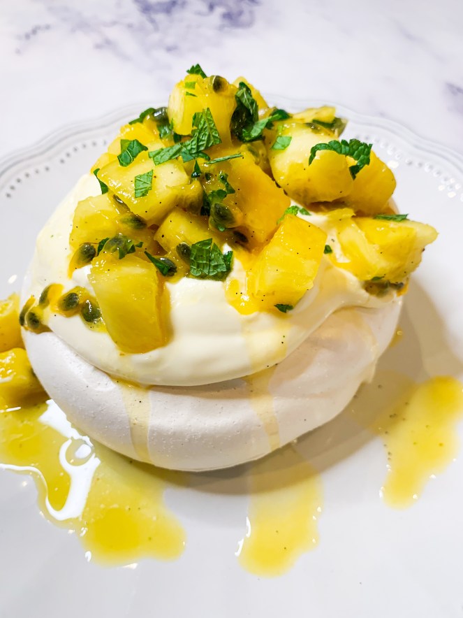 Vanilla Pavlova with Passion Fruit Cream, Pineapple and Mint Salsa (Serves 8)