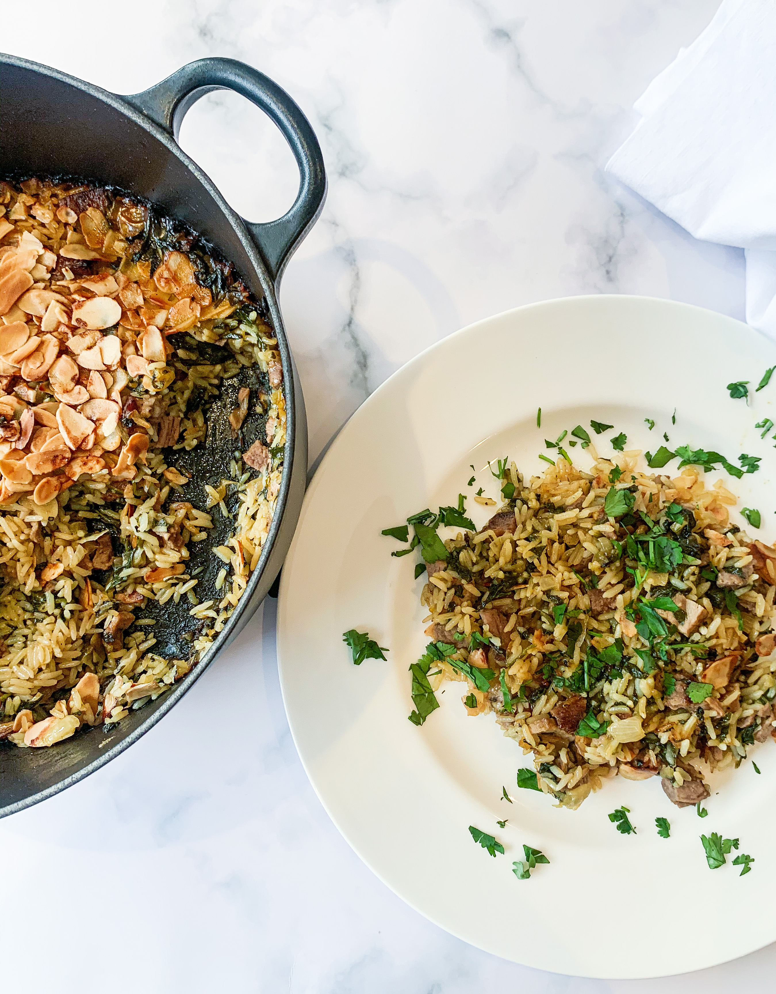 - Add the curry powder, flour, chutney, and the chopped lamb, season with salt and pepper then stir well. Pour in the lamb stock. Top with the reserved, cooked rice, sprinkle with the almonds and drizzle with the melted butter. Cover with a lid (or tin foil) and place in a preheated oven, 200’c fan.