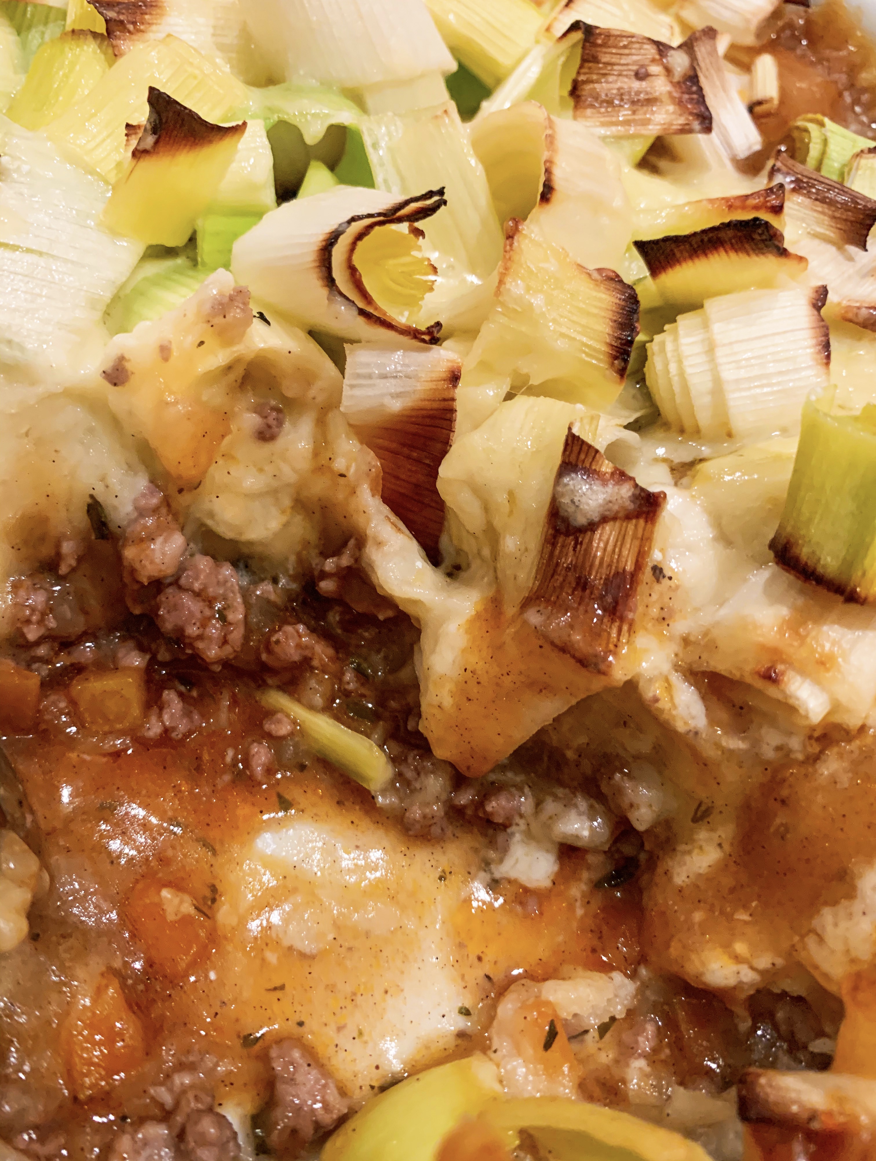 - When the meat is ready, spoon into a baking dish, level it out, then top, evenly, with the mashed potato. Sprinkle over the leek slices and finally with the cheese.