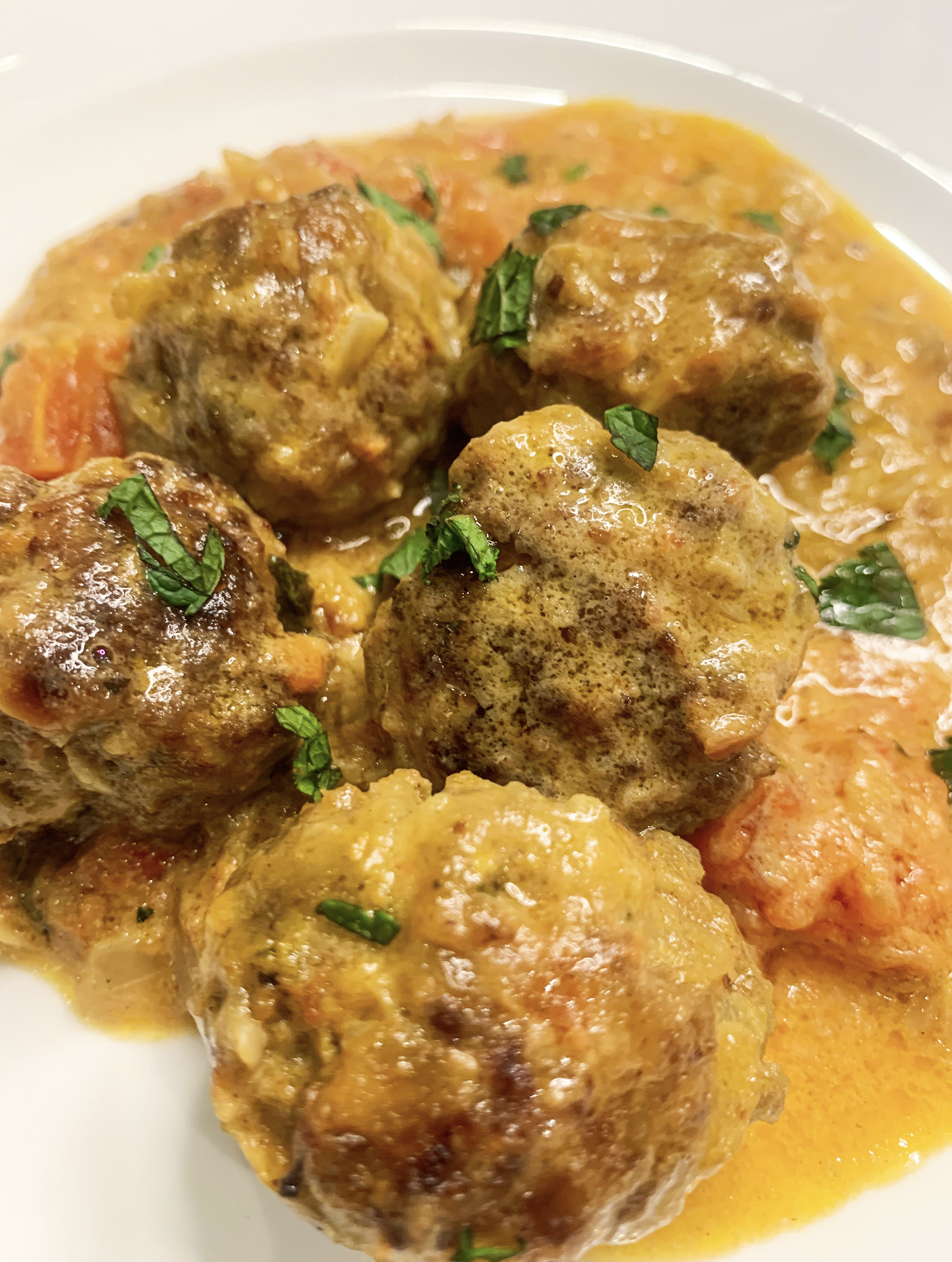 - Place the lamb in a bowl, adding the fried onions and mixing in the ground coriander and cumin, the turmeric, garam masala, chilli powder, pepper, salt, mint and egg. Form the mixture into walnut sized balls (koftas), roll in the flour and fry in the butter, in batches, until golden brown all over, remove to a plate.