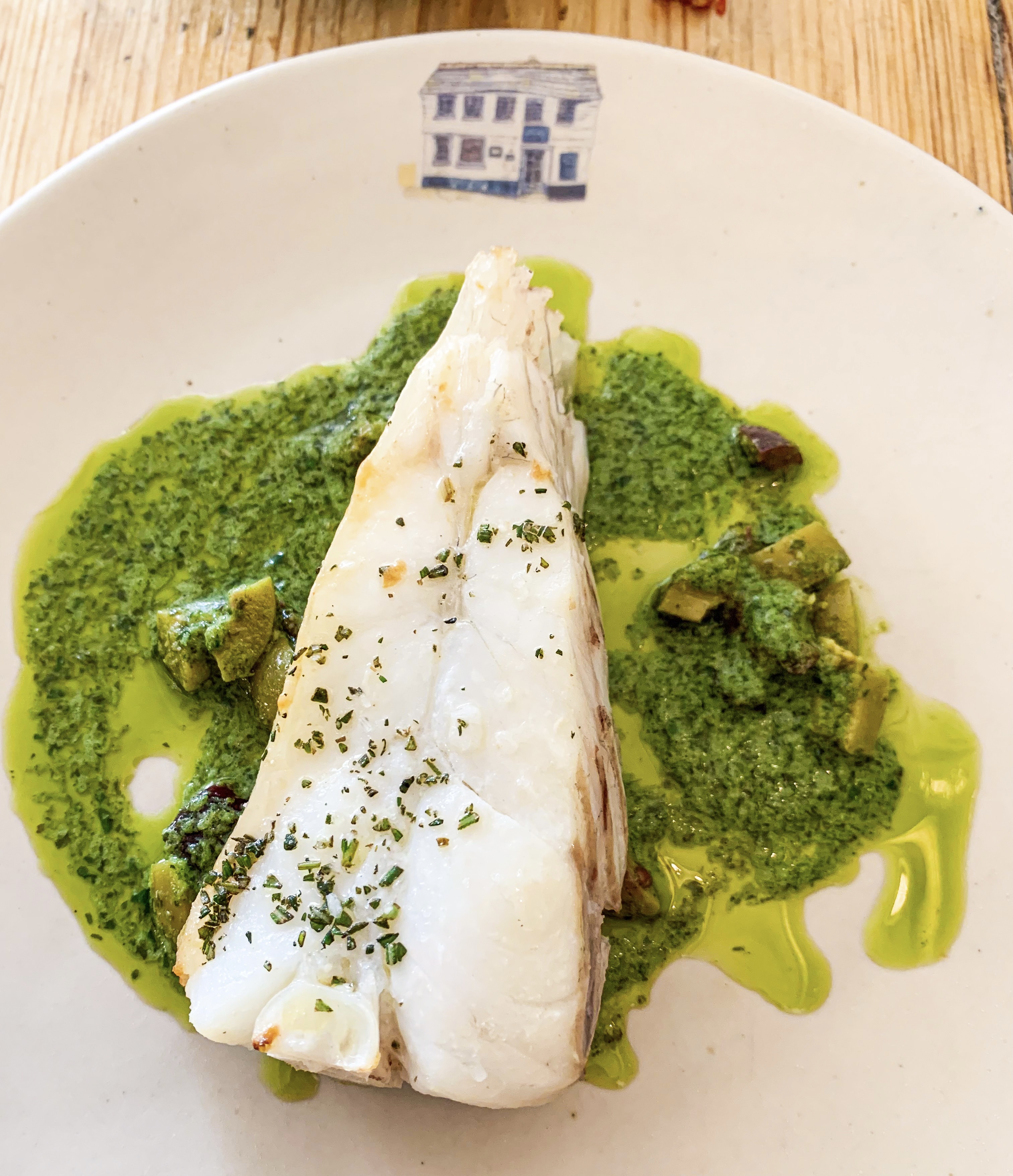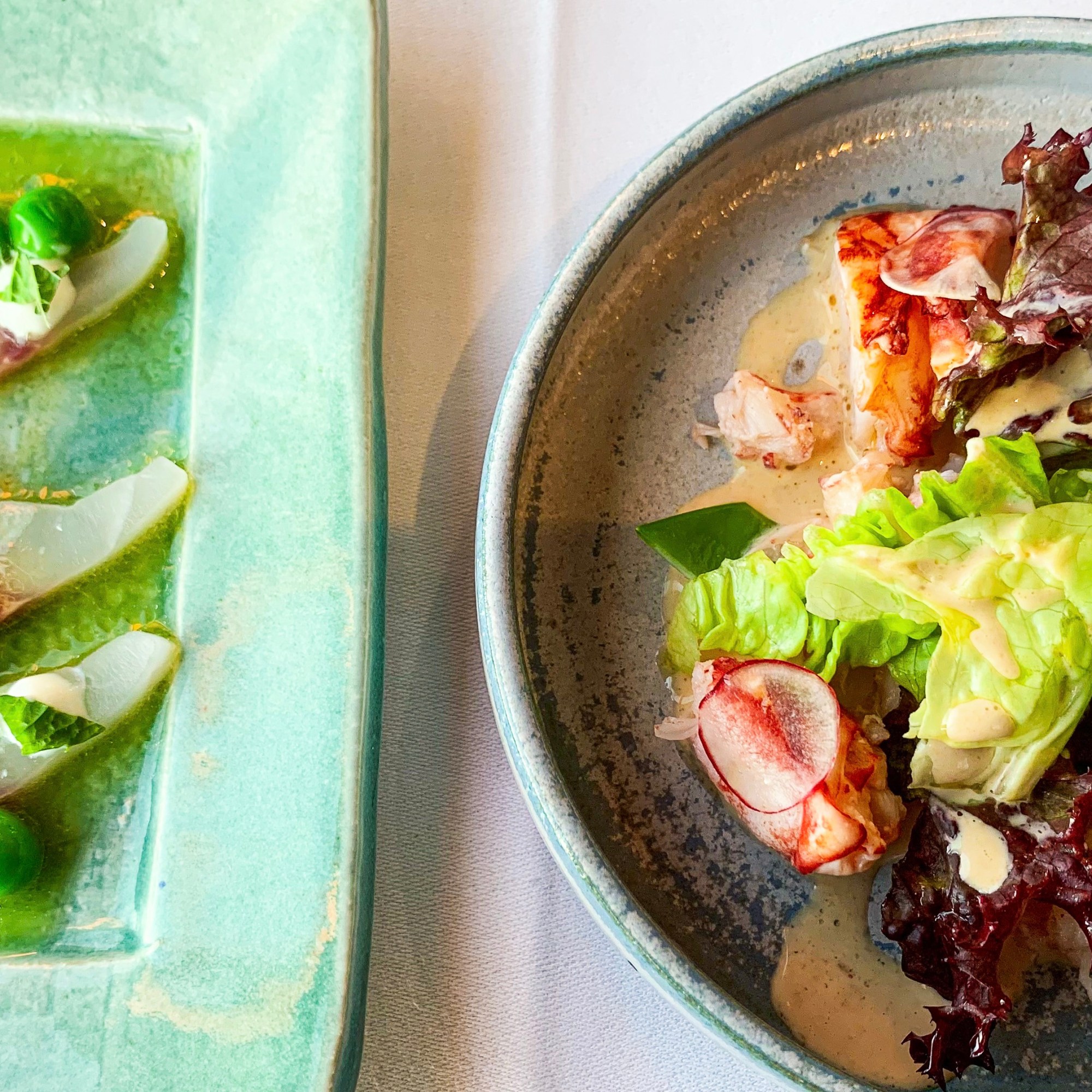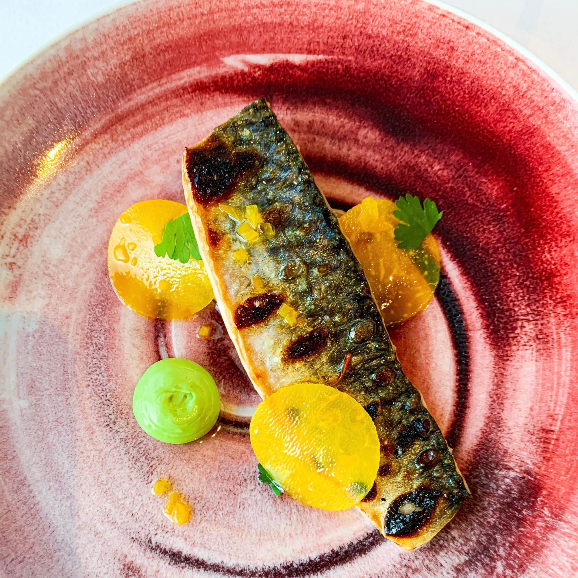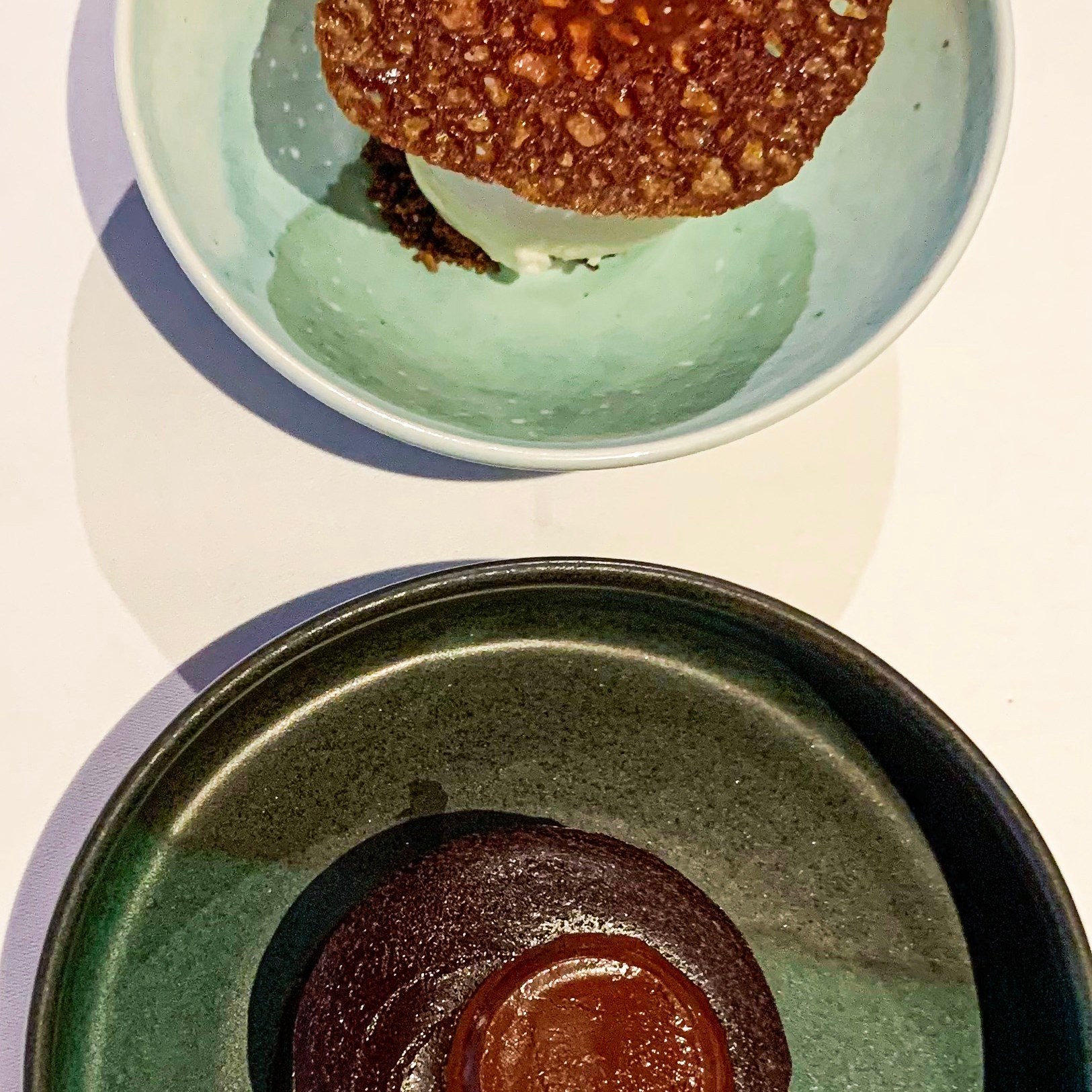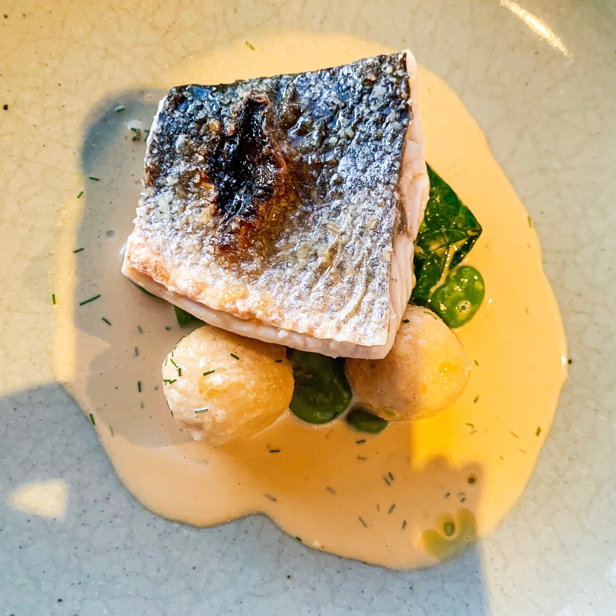 Outlaw’s New Road is literally a ‘stones-throw’ across the road from Outlaw’s Guest House. Before crossing the road we enjoyed an aperitif on the guest house’s terrace with its incredible vista of the coast, we could just make out the Tintagel footbridge we had crossed earlier! Our second tasting dinner was a slightly more grown-up affair, the fish menu features classic, elegant flavours. To kick off the ‘fish show’ there was sweetly smoked trout with rye bread and a light crab salad. This was followed by ‘Raw Bass’, served with a beautifully light pea jus and a ‘Lobster Salad’, with chunks of lobster which were lightly dressed allowing them to sing with their full, fresh flavour. Next up was ‘Lobster Bisque’, which was incredibly flavoursome with the added surprise of a delicious piece of hake nestling under its surface. Equally good was ‘Mackerel’, served with the delicate, sweet crunch of kohlrabi. Finally, ‘Bass’ was served with a wonderful creamy wine sauce with gnocchi, broad beans and spinach; it goes without saying that it was a perfectly cooked piece of fish (the chefs at Outlaw’s definitely know a thing or two about fish!), its delicate flavour was perfectly matched by its accompaniments. Dessert was ‘80% Chocolate’, a fondant pudding with crème fraiche ice cream and a brandy snap. It was a rich, wonderfully executed dessert – a sublime end to a sensational meal.
