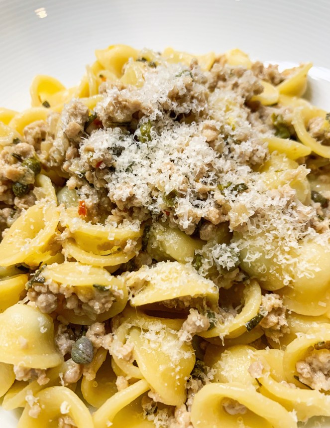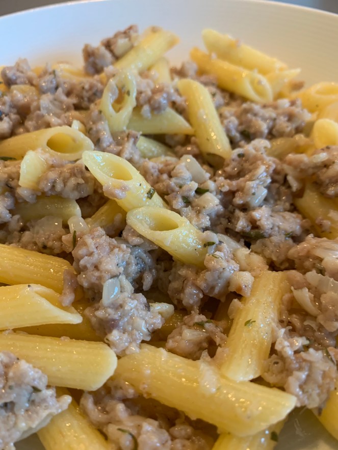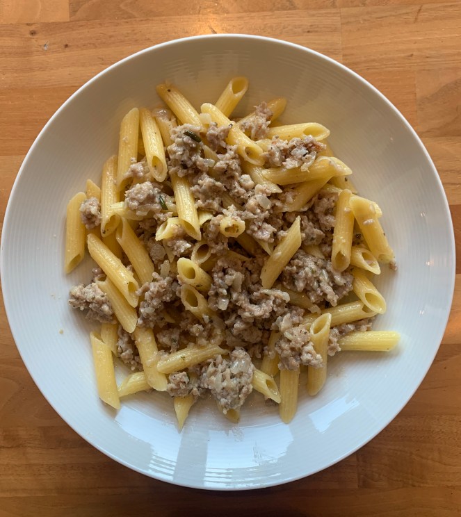 I regularly cook this pasta dish as not only is it very tasty but incredibly quick to make. Although just a pinch of nutmeg and cloves are added, they really do make the sauce. The recipe is from ‘Passion for Pasta’ by Antonio Carluccio, I first bought this book over 20 years ago, it became so tattered from over use that I had to buy a second copy! If you are gluten free, like me, you can use gluten free sausages – I get some great ones from my local butcher. You can also serve this sauce with gluten free pasta, I think these days it’s hard to fault it; I have given it to Nick and Felix before, when I’ve been too lazy to cook two types of pasta, and they’ve hardly noticed! I particularly like ‘Barilla’ and ‘Garofalo’ gluten free pasta.