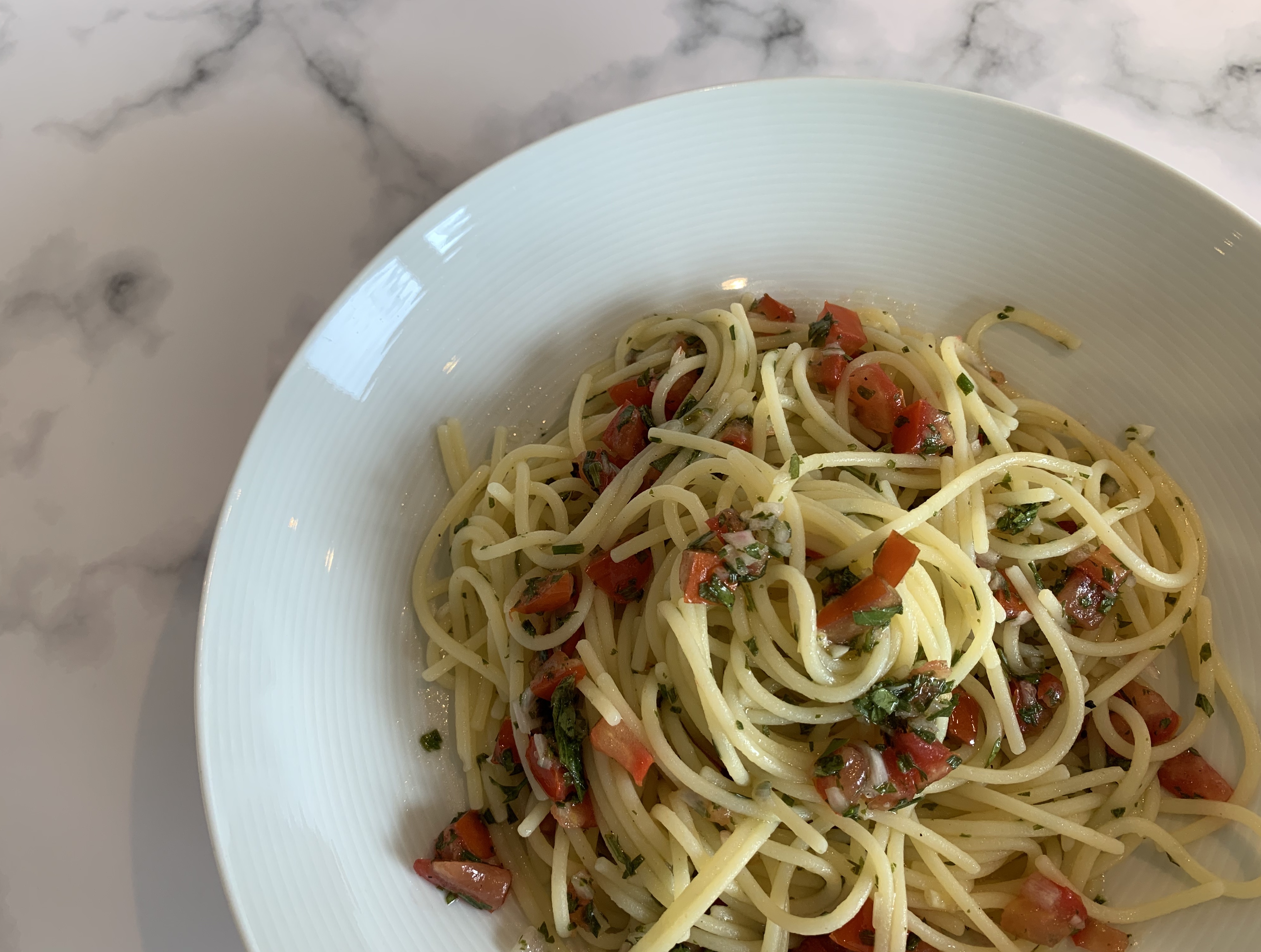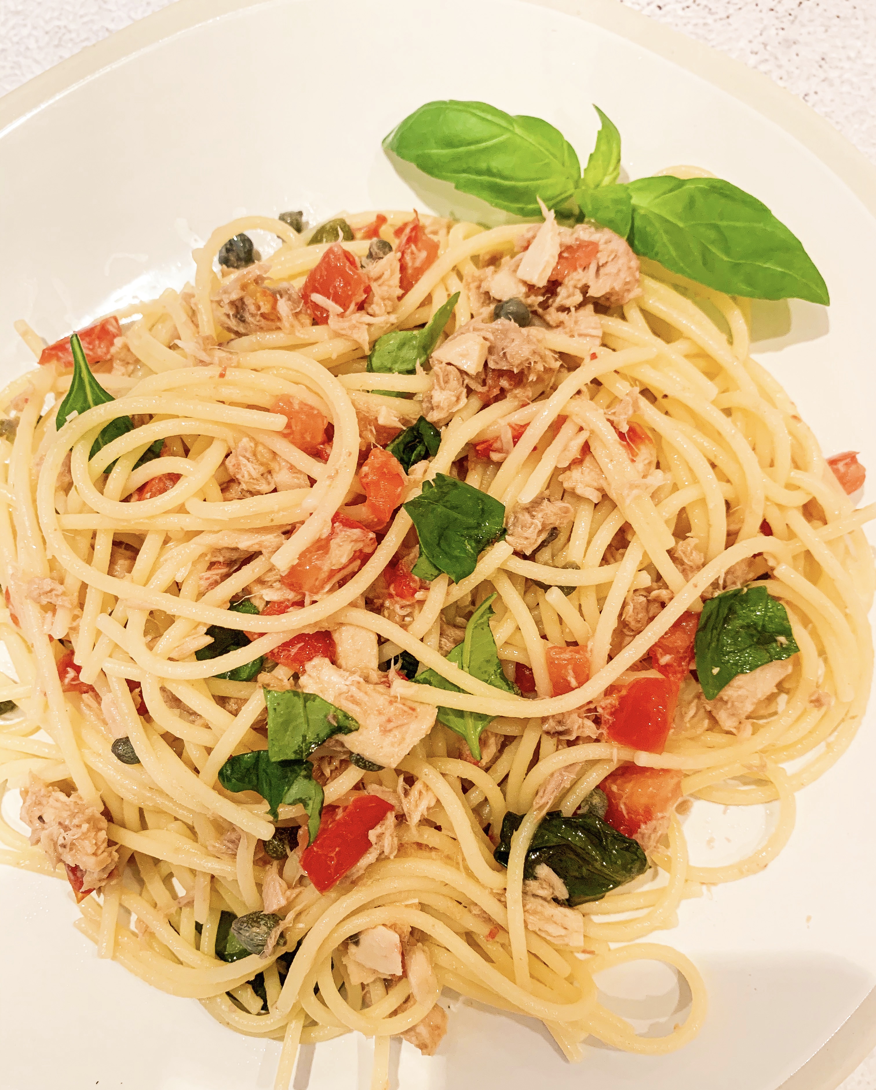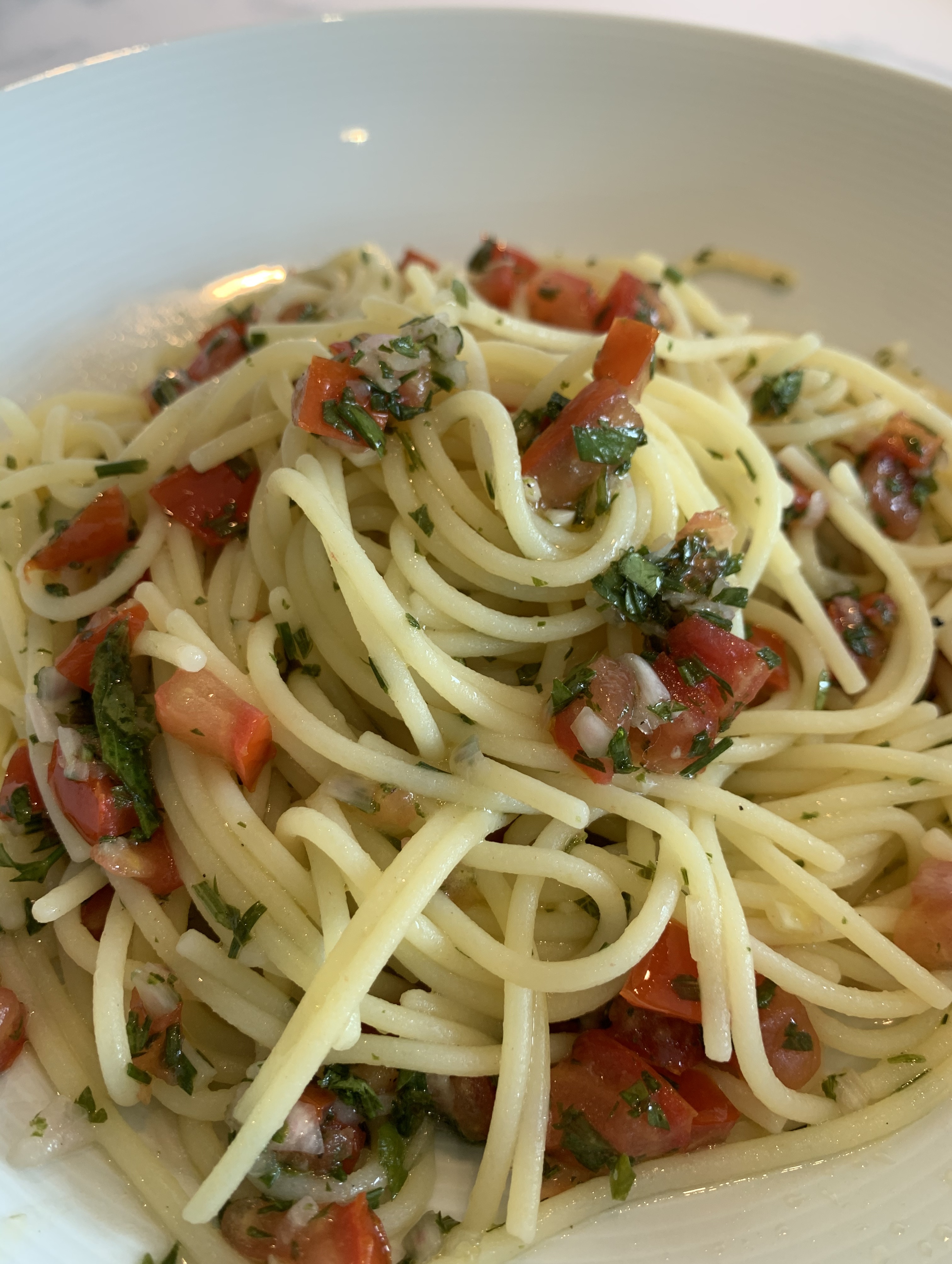 This is a perfect summer pasta dish, a delicious ‘no cook’ sauce for spaghetti with the added bonus of being vegetarian!