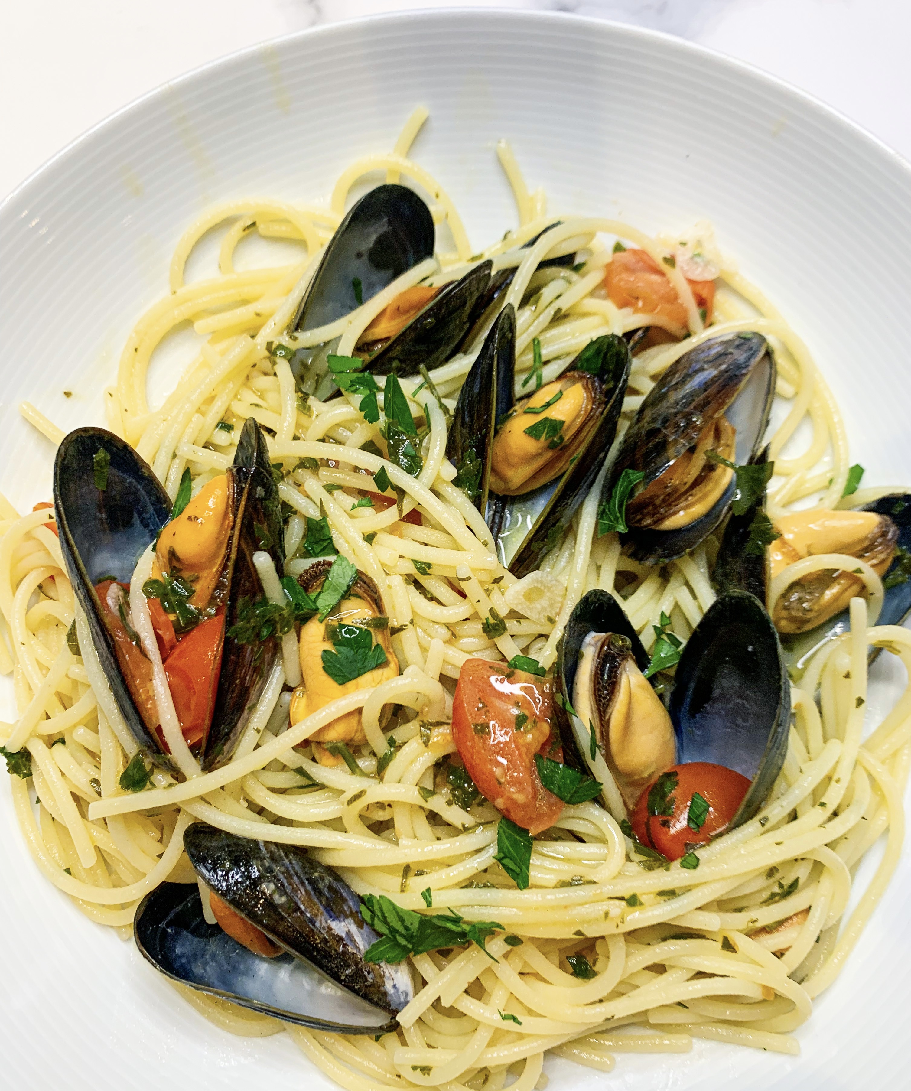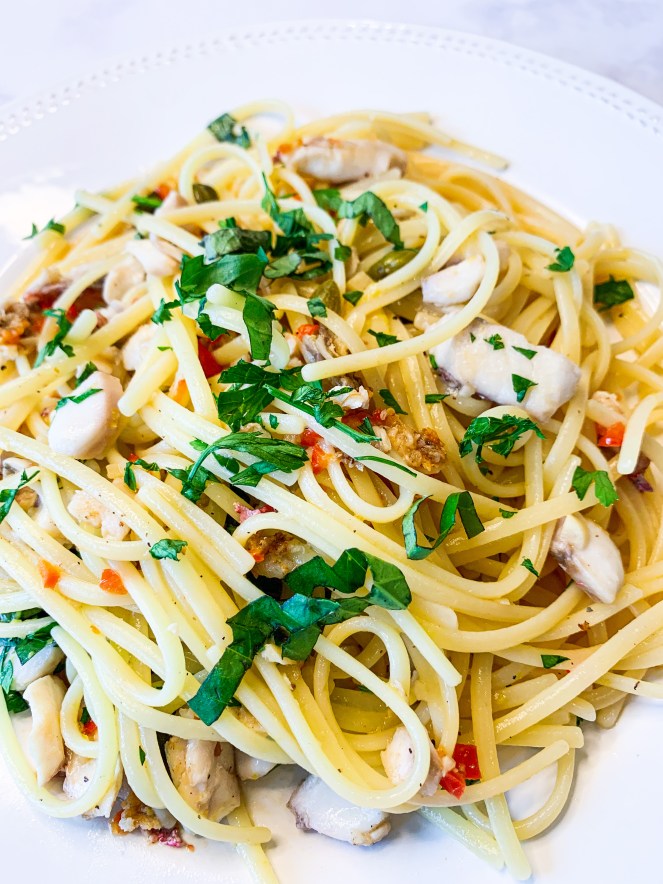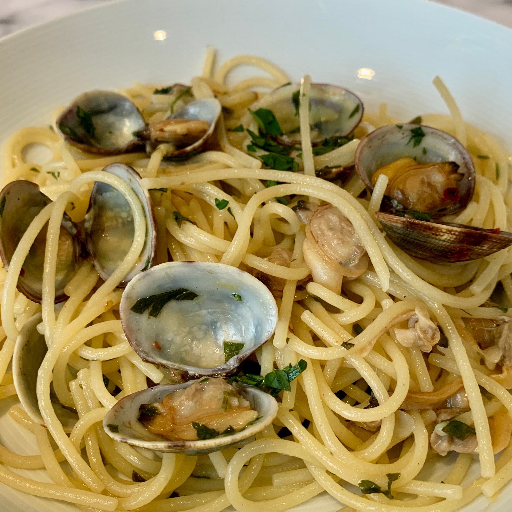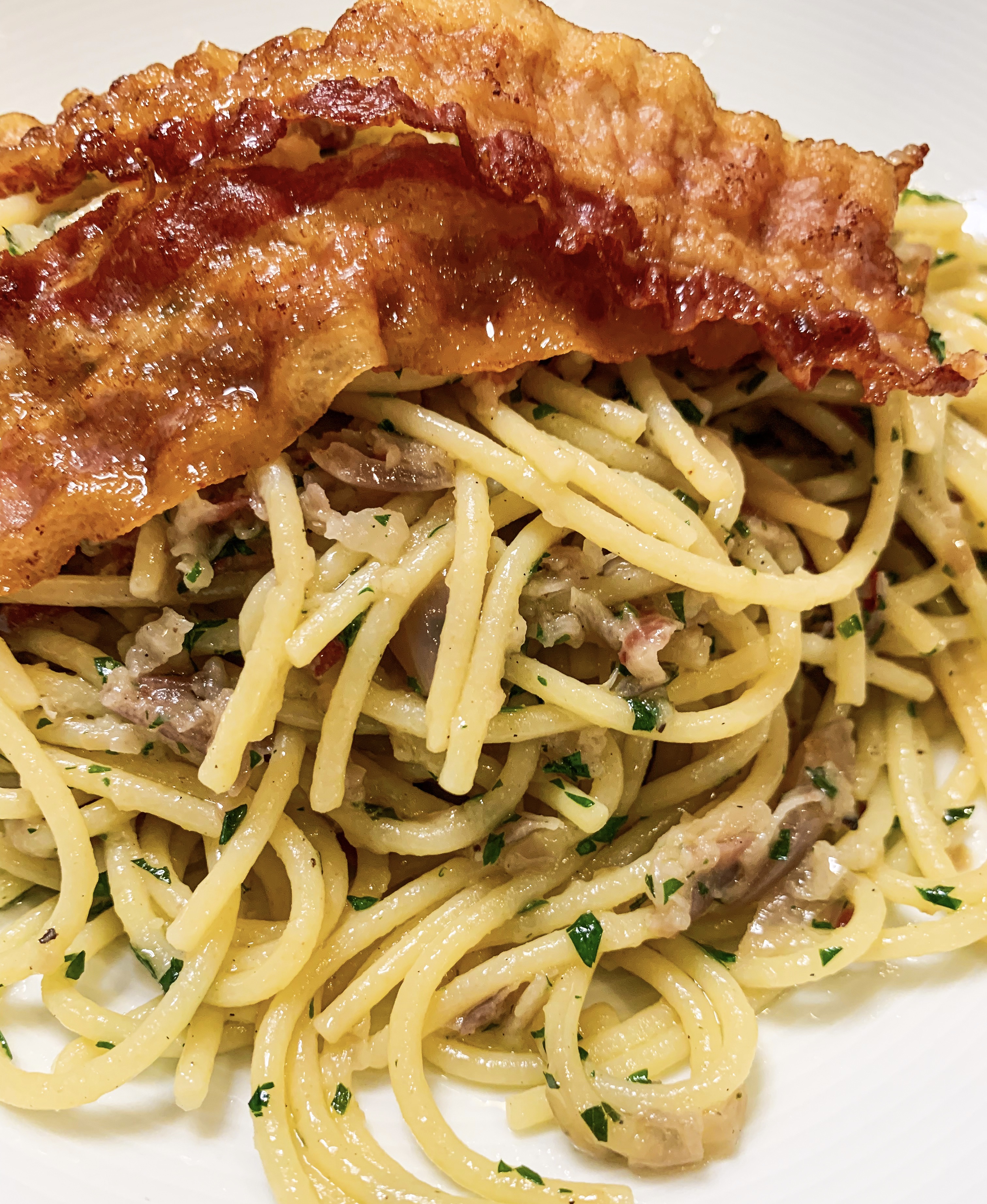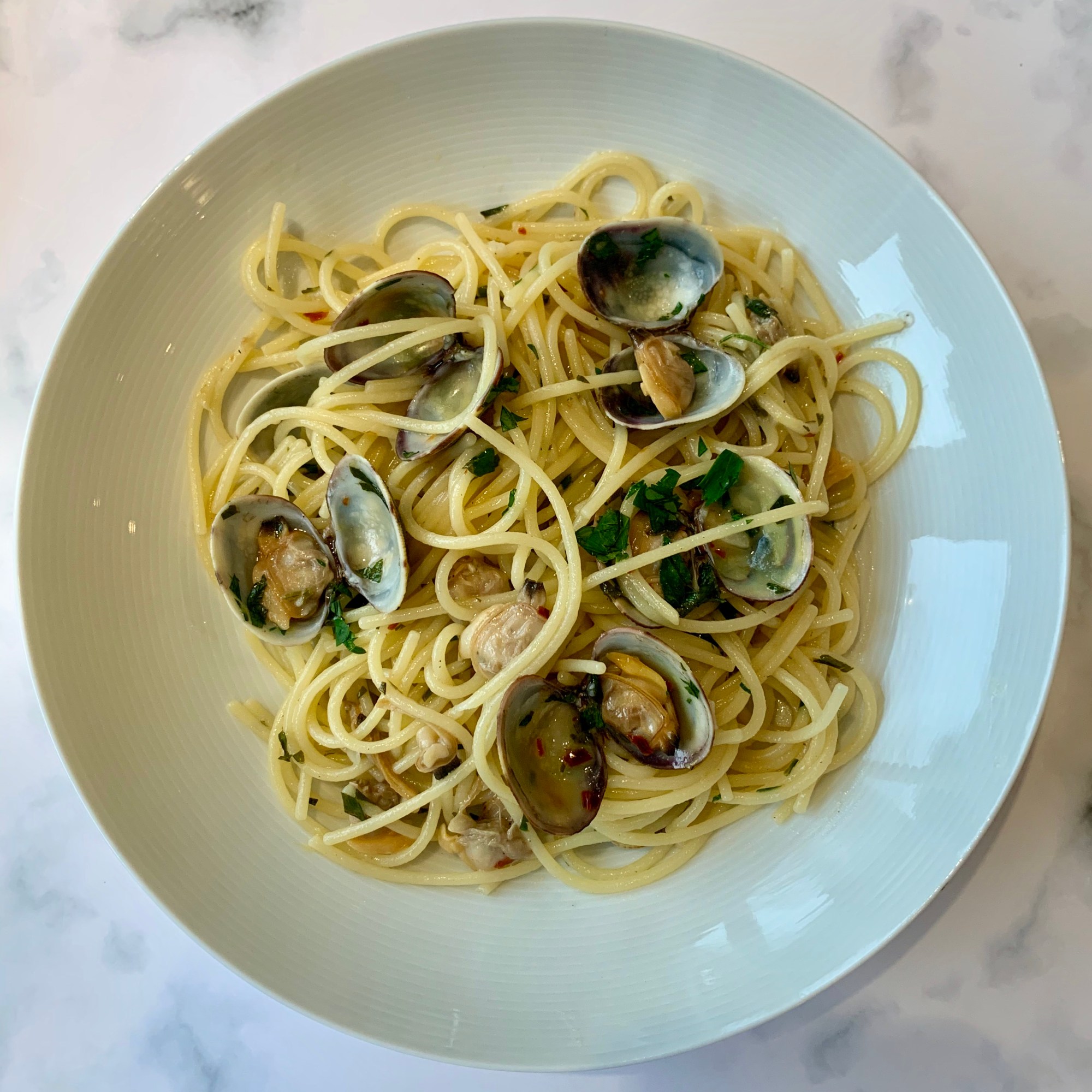 This dish is one of my all-time favourites – one of ‘my last supper’ dishes. It is extremely simple to cook and ready in minutes! I really do believe that using prosecco or sparkling wine improves the flavour of the sauce – giving it a sweetness. I buy the mini 20cl bottles of prosecco from my supermarket. I like more rather than less clams, so I suggest 1.25kg for 4 people, but you could use 1kg.