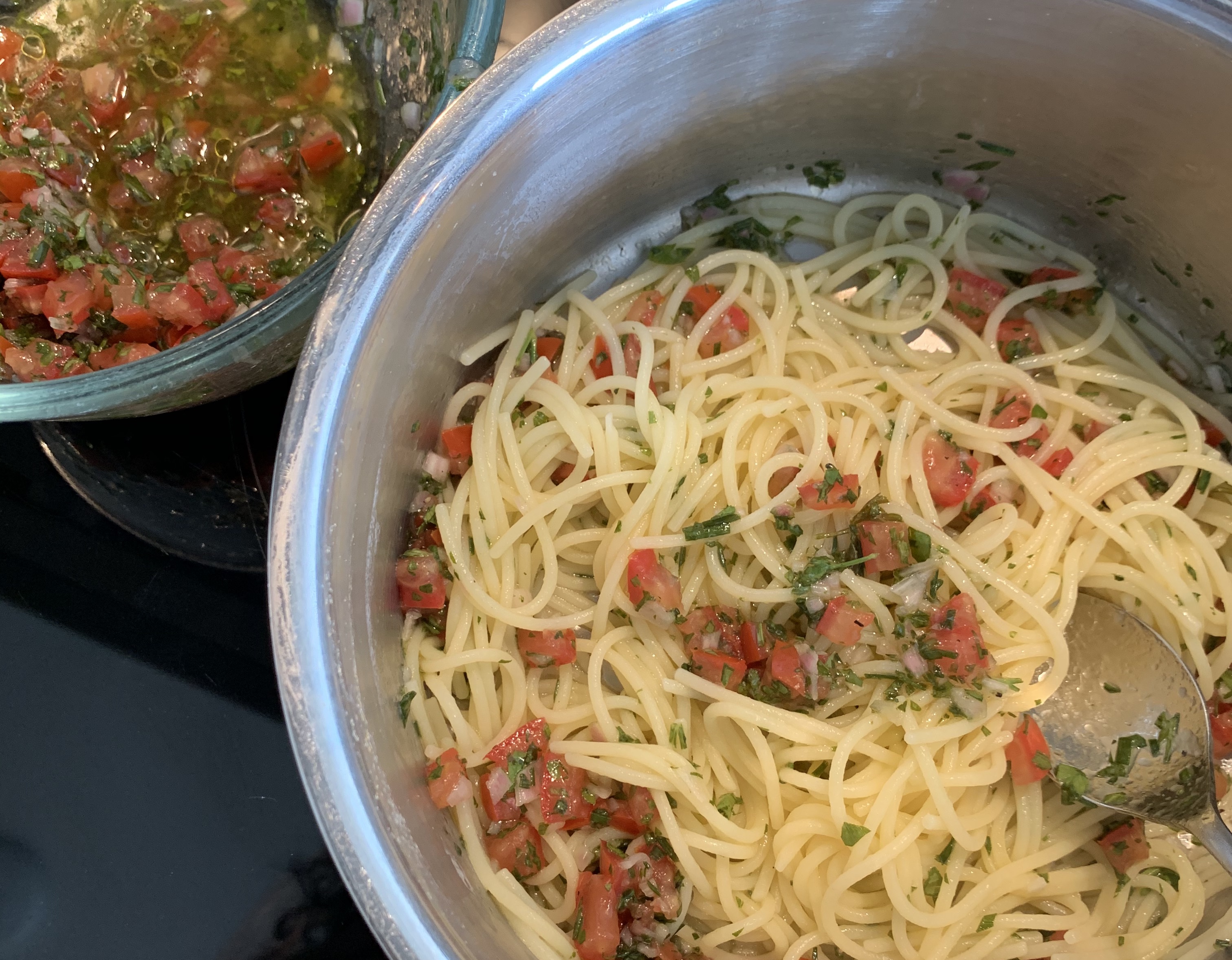 - Drain the spaghetti and mix with the Sauce Vierge.