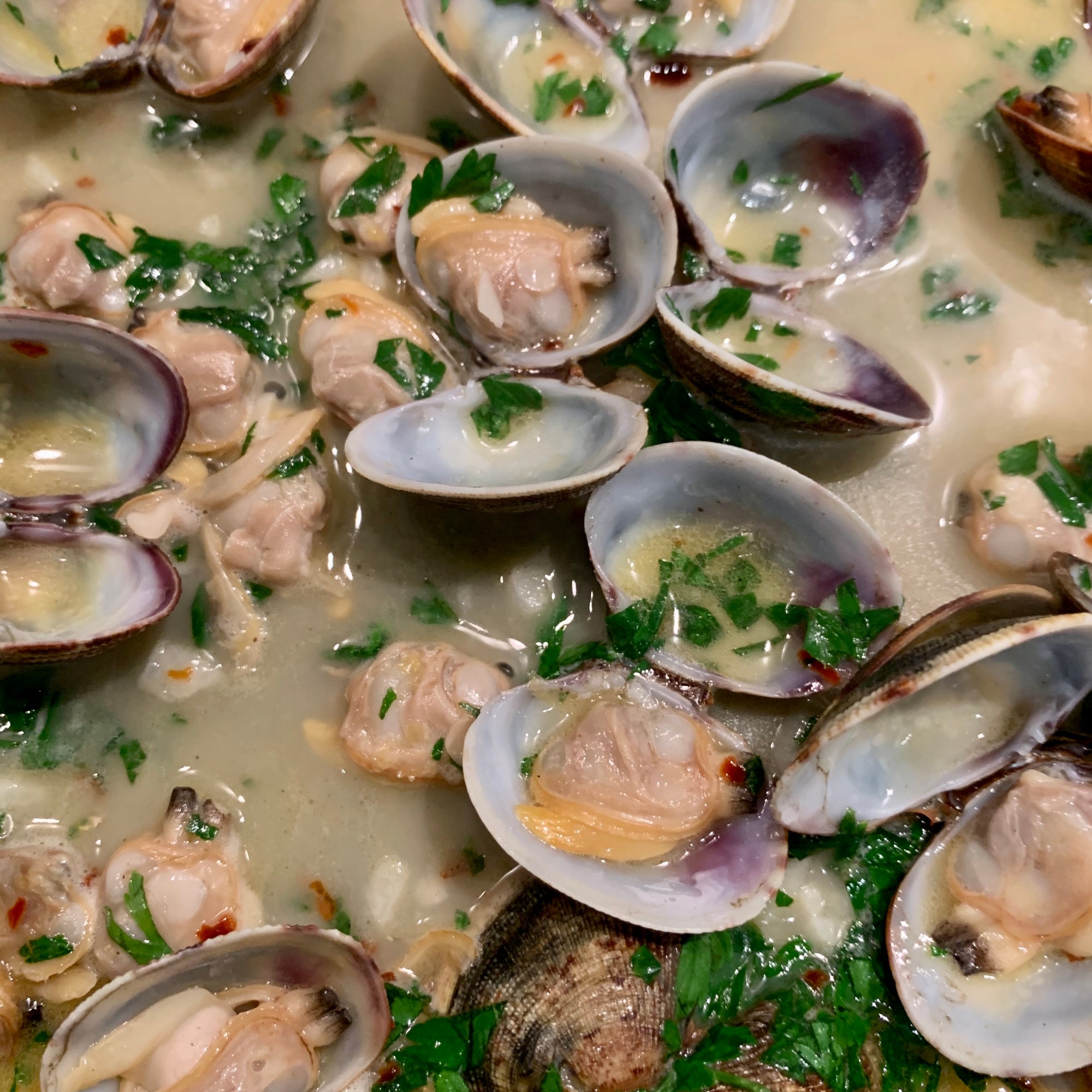 - Add the remaining 10g of butter which will slightly thicken the sauce, and all of the clams including those with their shells plus the chopped parsley, cook for a further minute. Check seasoning.