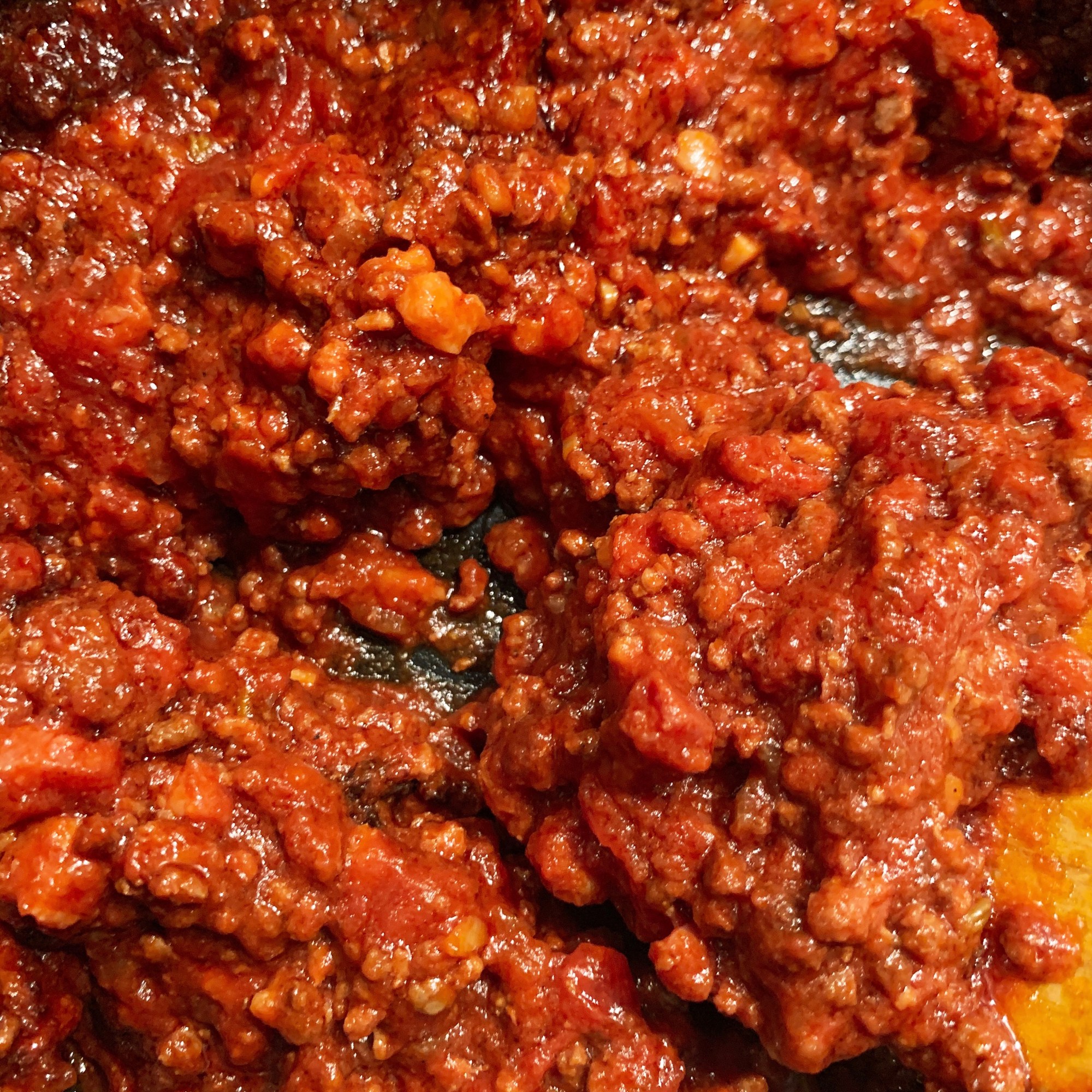 - Add the tomato purée and cook for another minute before adding the tinned tomatoes. Rinse the tins with a splash of water and add half a tin of this tomatoey water to the pan. Simmer for 20-25 minutes, breaking up the tomatoes with a spoon and stirring occasionally, until the sauce is thickened.