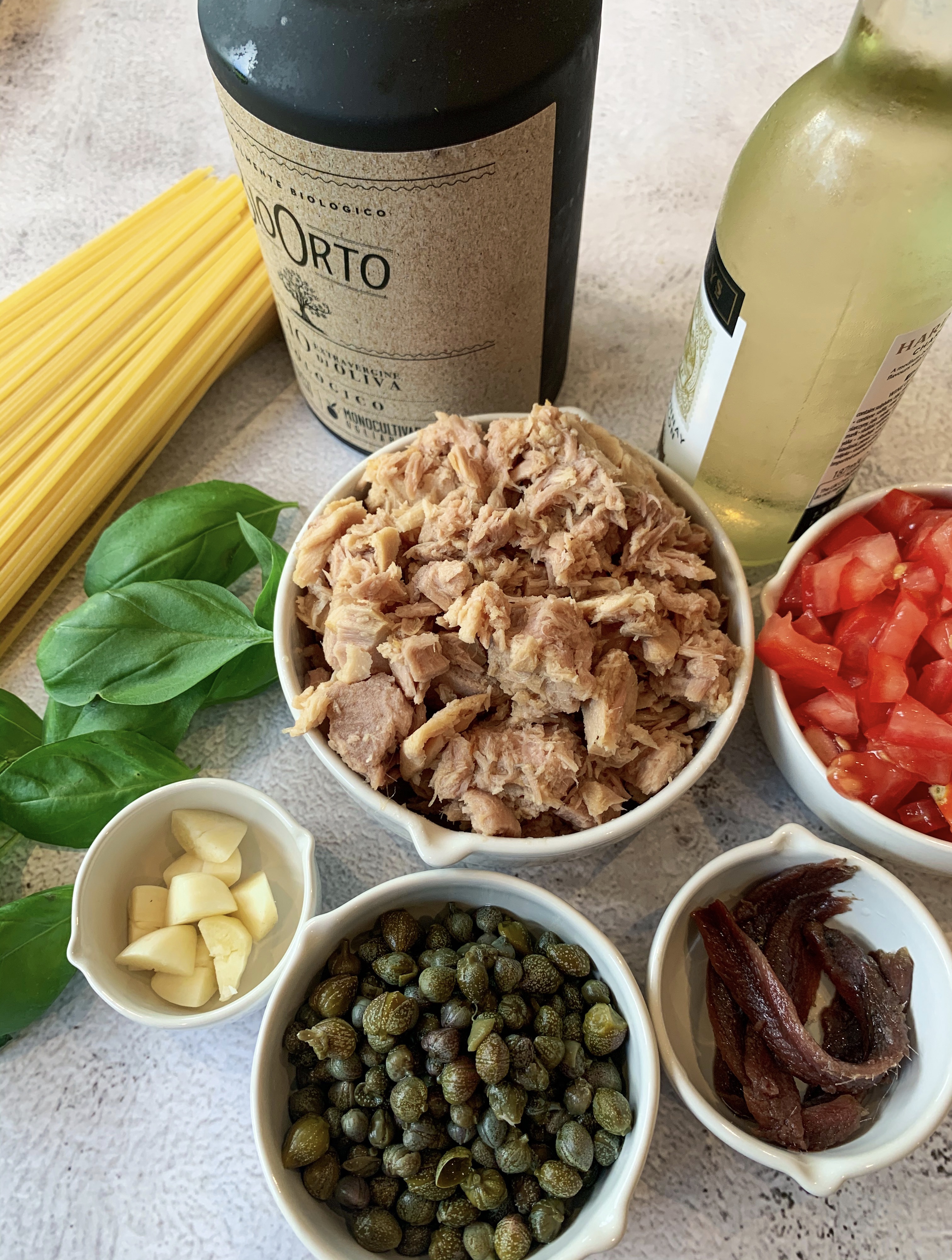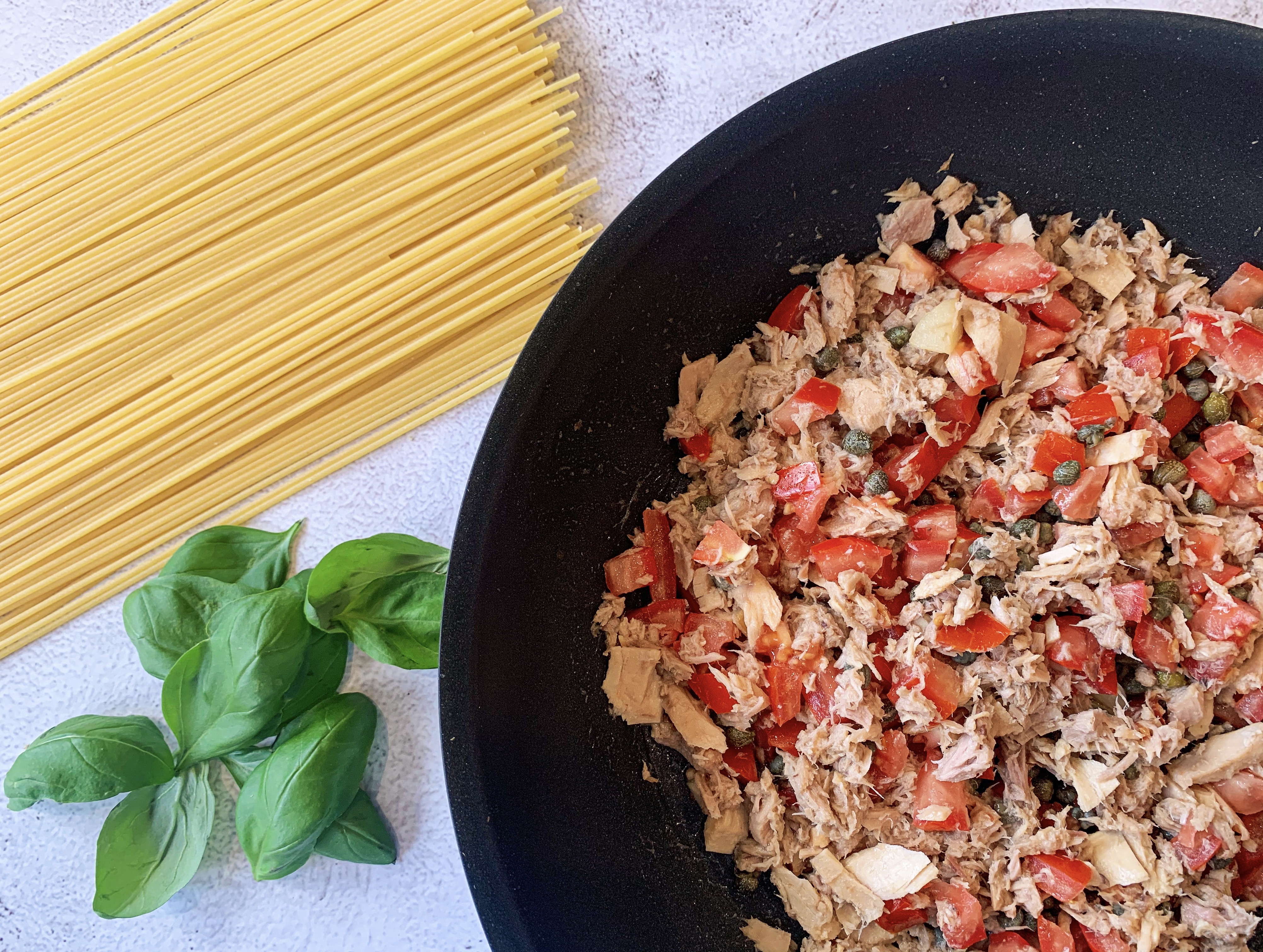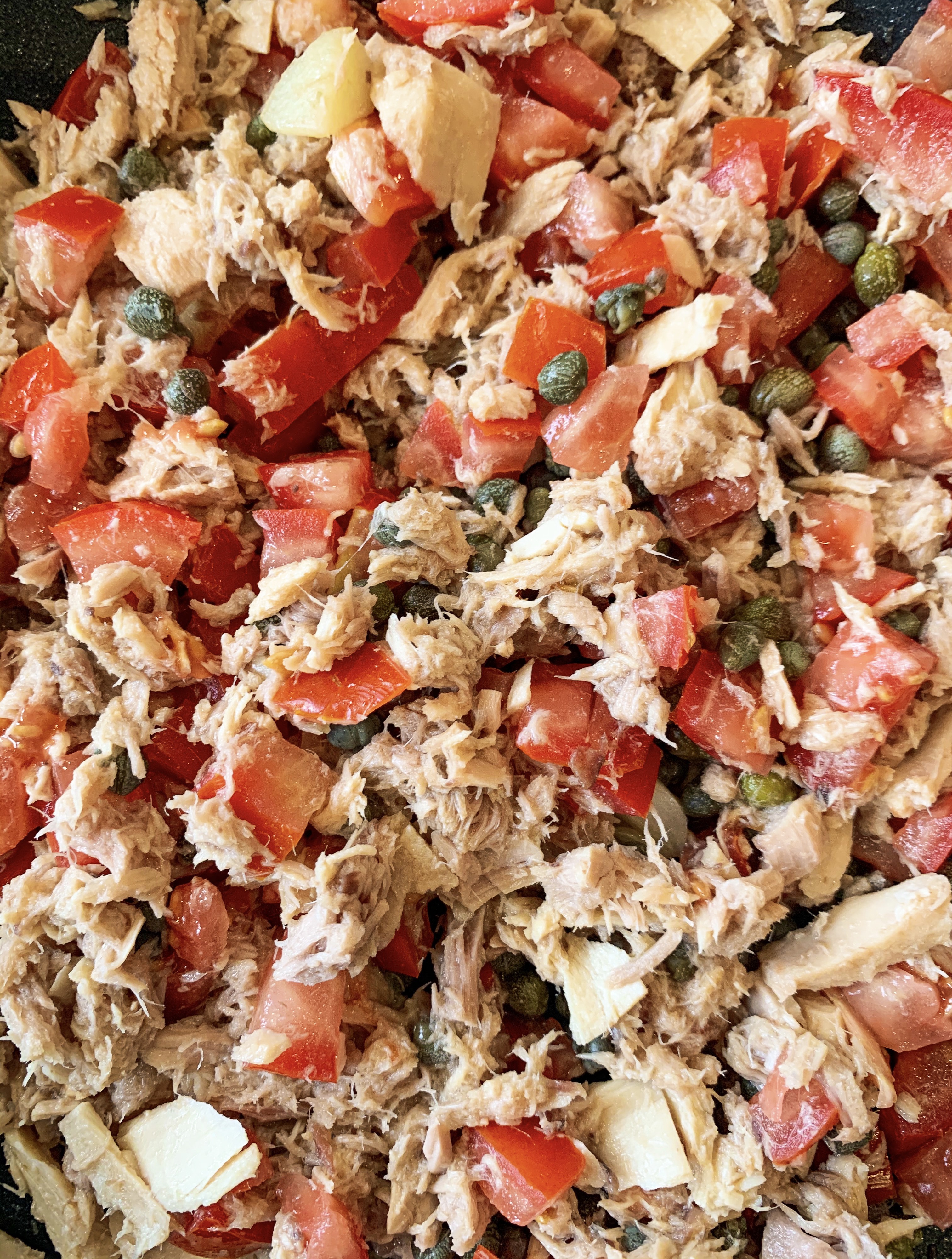 - Increase the heat and add the tuna, stir for a few minutes, then add the white wine, let it bubble for a few minutes for the alcohol to evaporate.