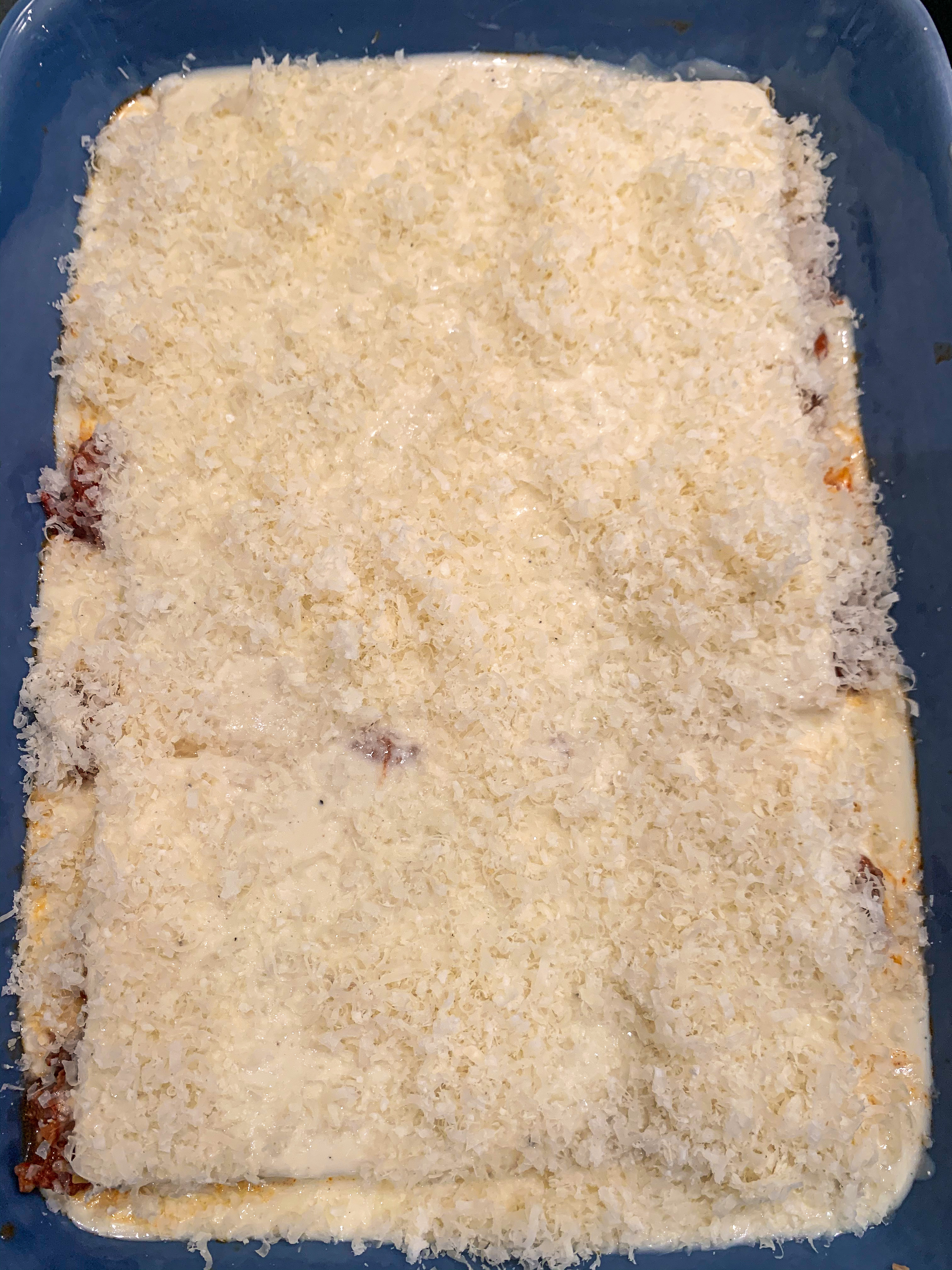 - Spread a few spoons of the tomato sauce across the baking dish and top with one layer of lasagne, followed by more tomato sauce. Add half of the courgette mix, top with 1 ball of mozzarella, grated cheese, 1/3 of the ricotta sauce, and salt & pepper. Repeat once. Finally, top with more pasta, the last 3rd of the ricotta sauce, grated cheese, seasoning and olive oil.
