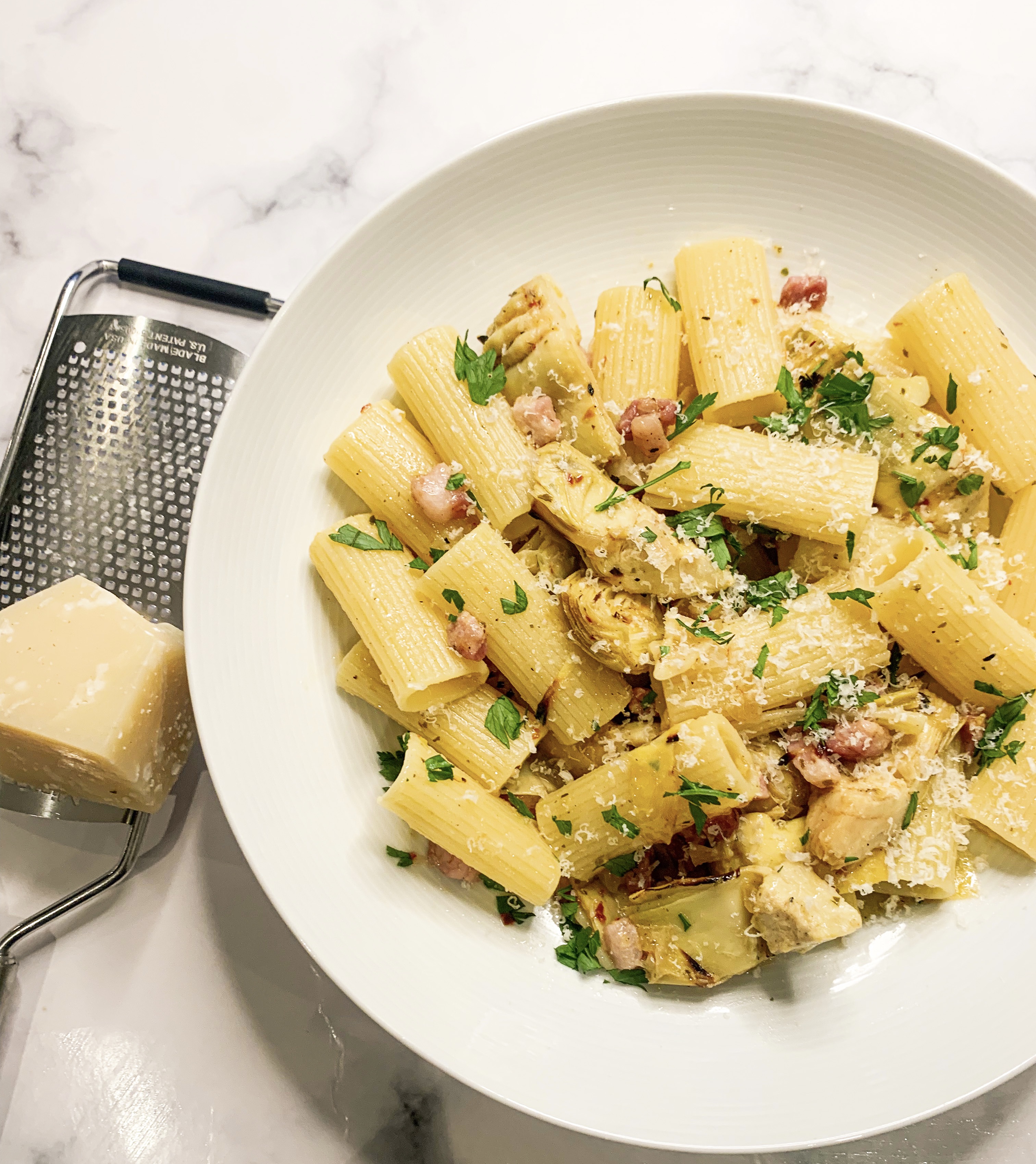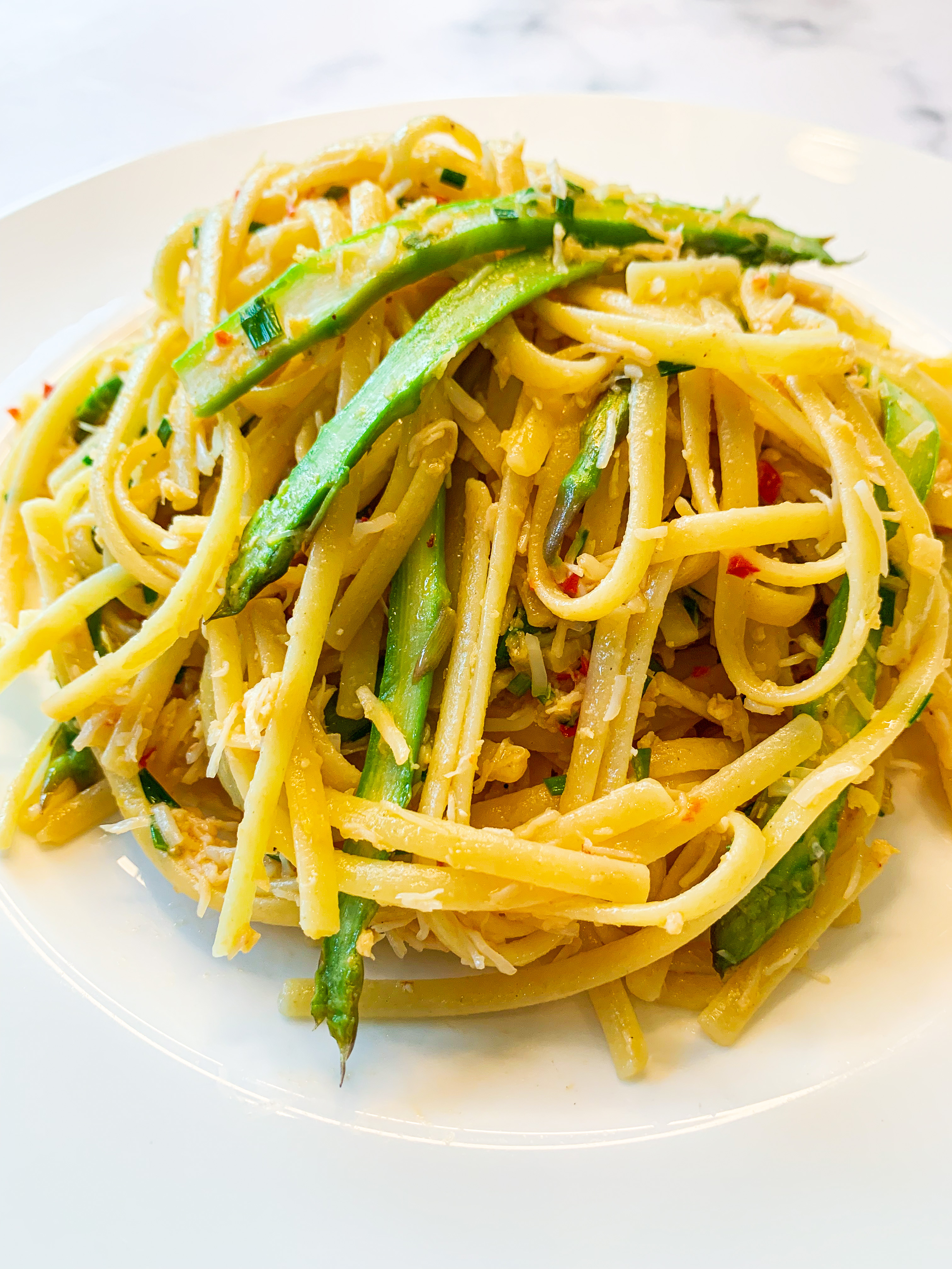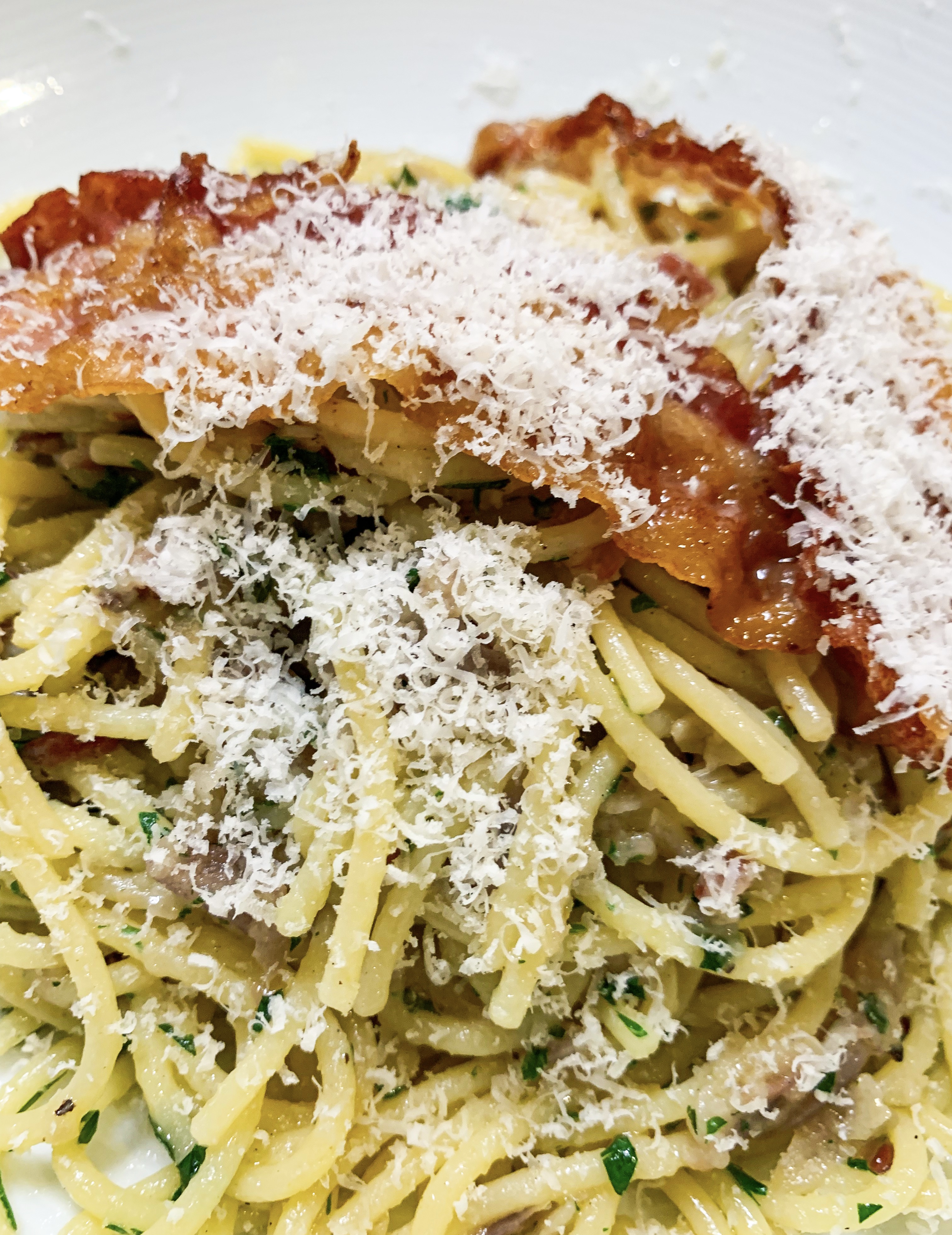 Another recipe from my beloved cookbook ‘A Passion for Pasta’ by the late Antonio Carluccio. You could cook this dish with your eyes closed, it really is that easy, and will be ready to eat in 15 minutes! For those of you who are vegetarian you can leave out the smoked bacon – add a pinch of paprika to give a little smokiness.