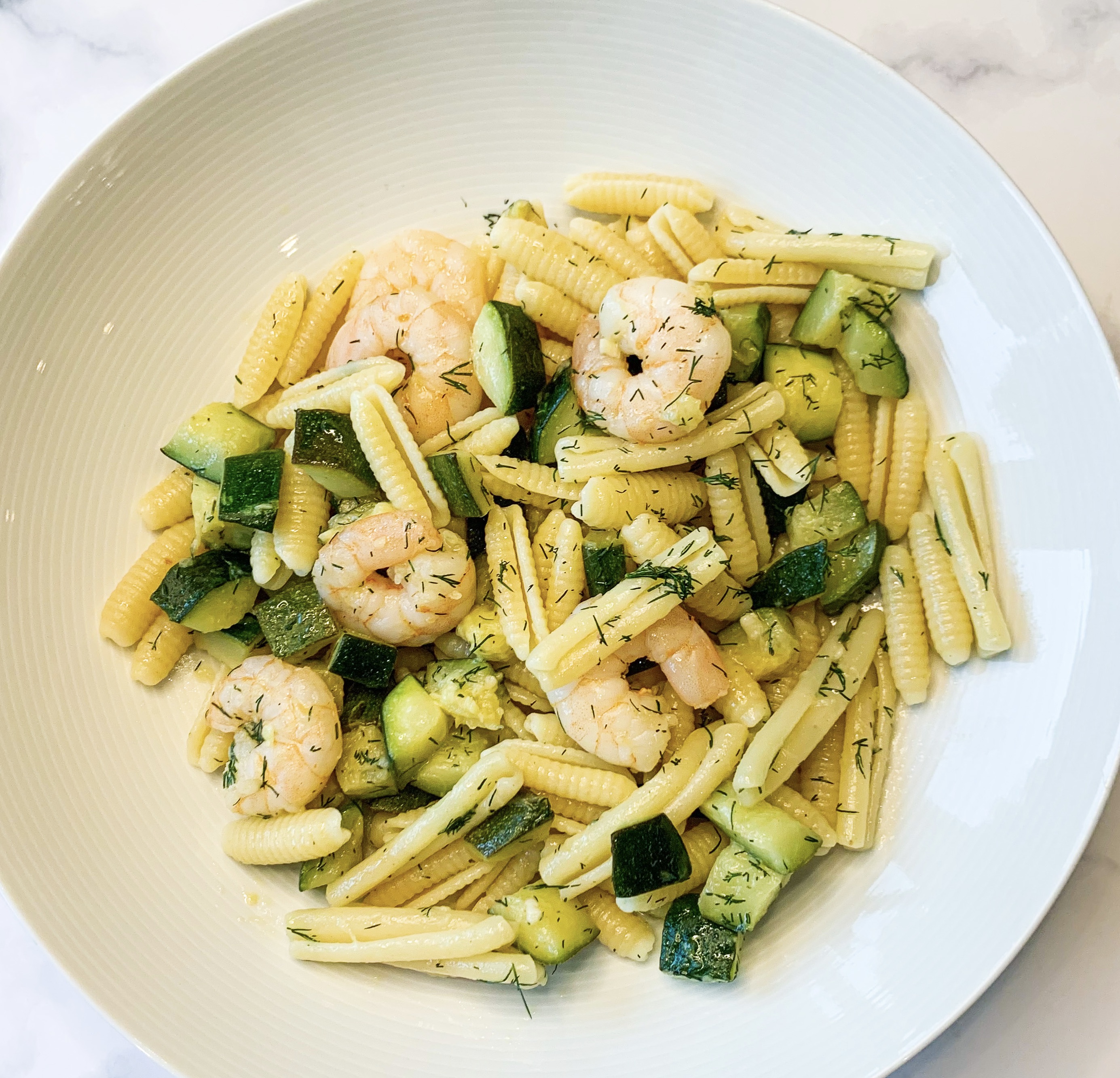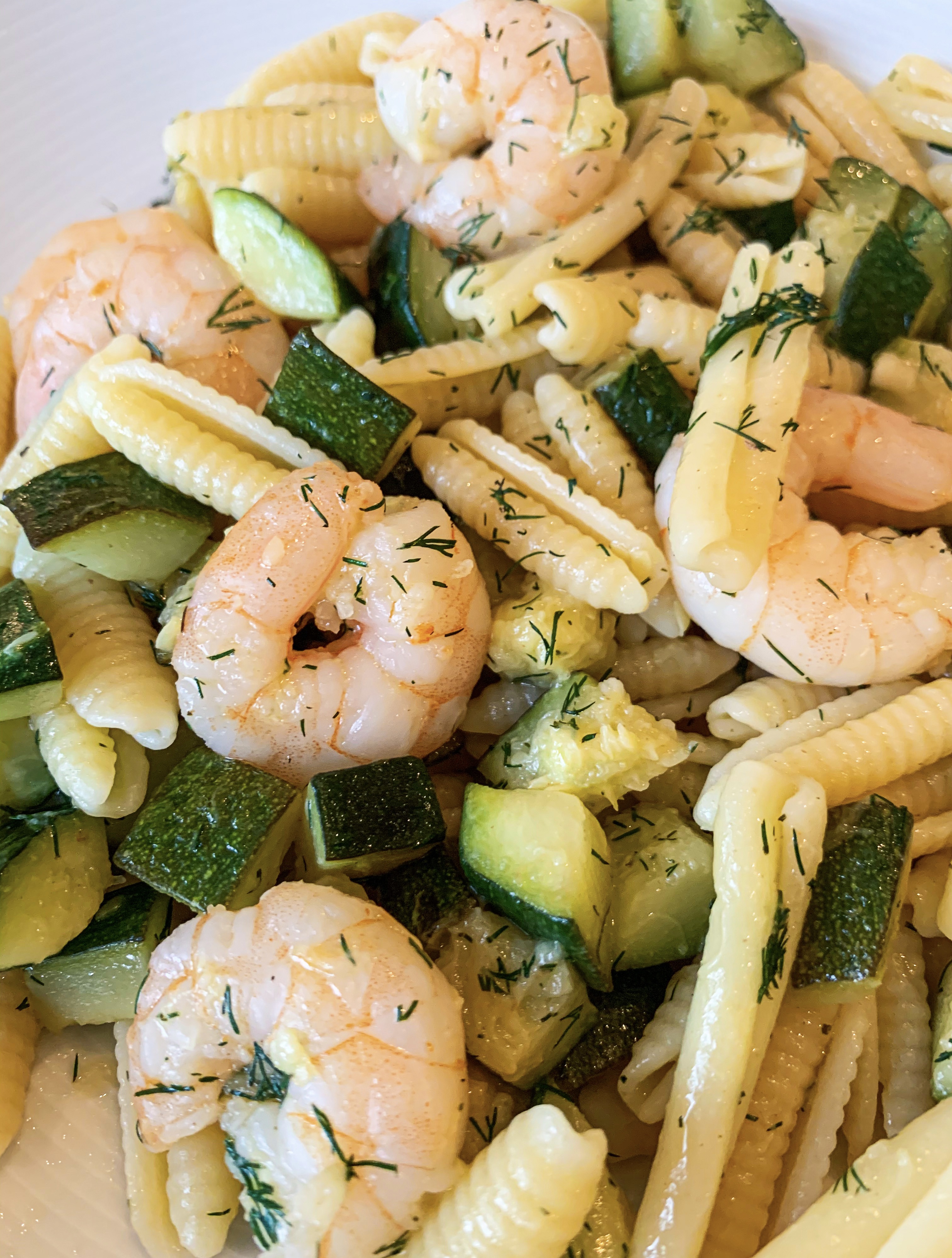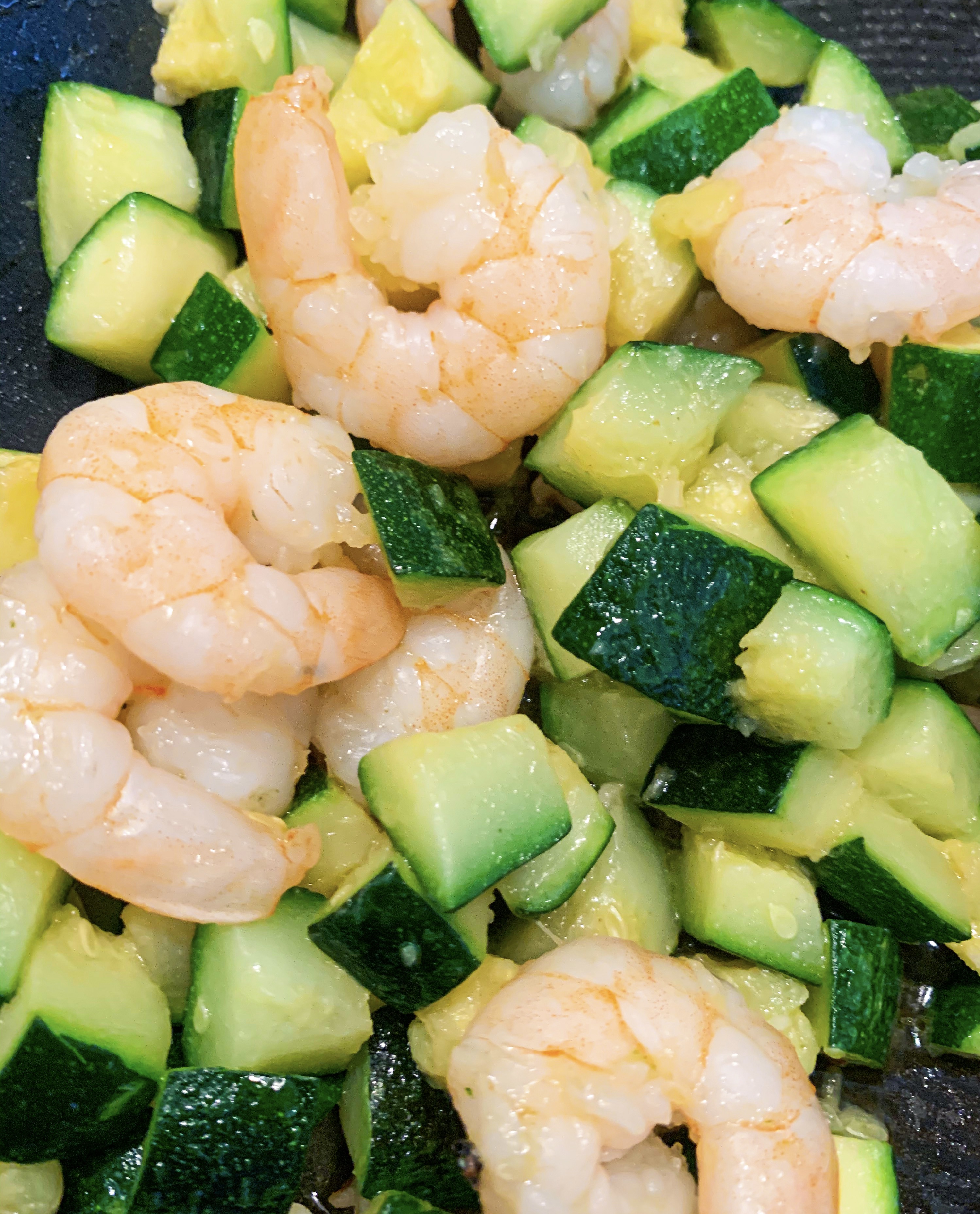 - Meanwhile, sauté the onion in 2 tablespoons of olive oil until soft and just turning golden. Add the chilli flakes and prawns. Stir the prawns and onion around until the prawns turn pink and are cooked – it will take about 2 minutes. Add the parsley and lemon juice.
