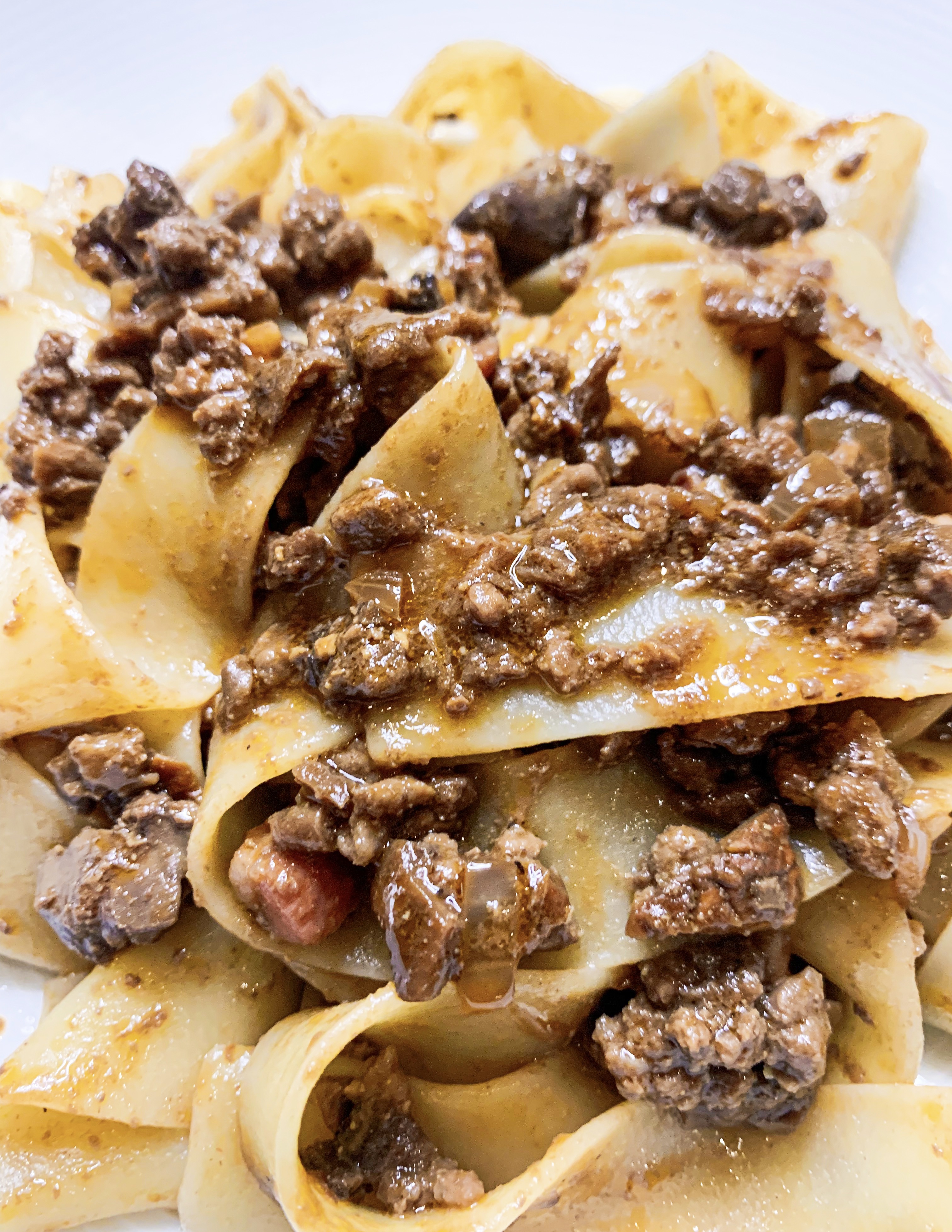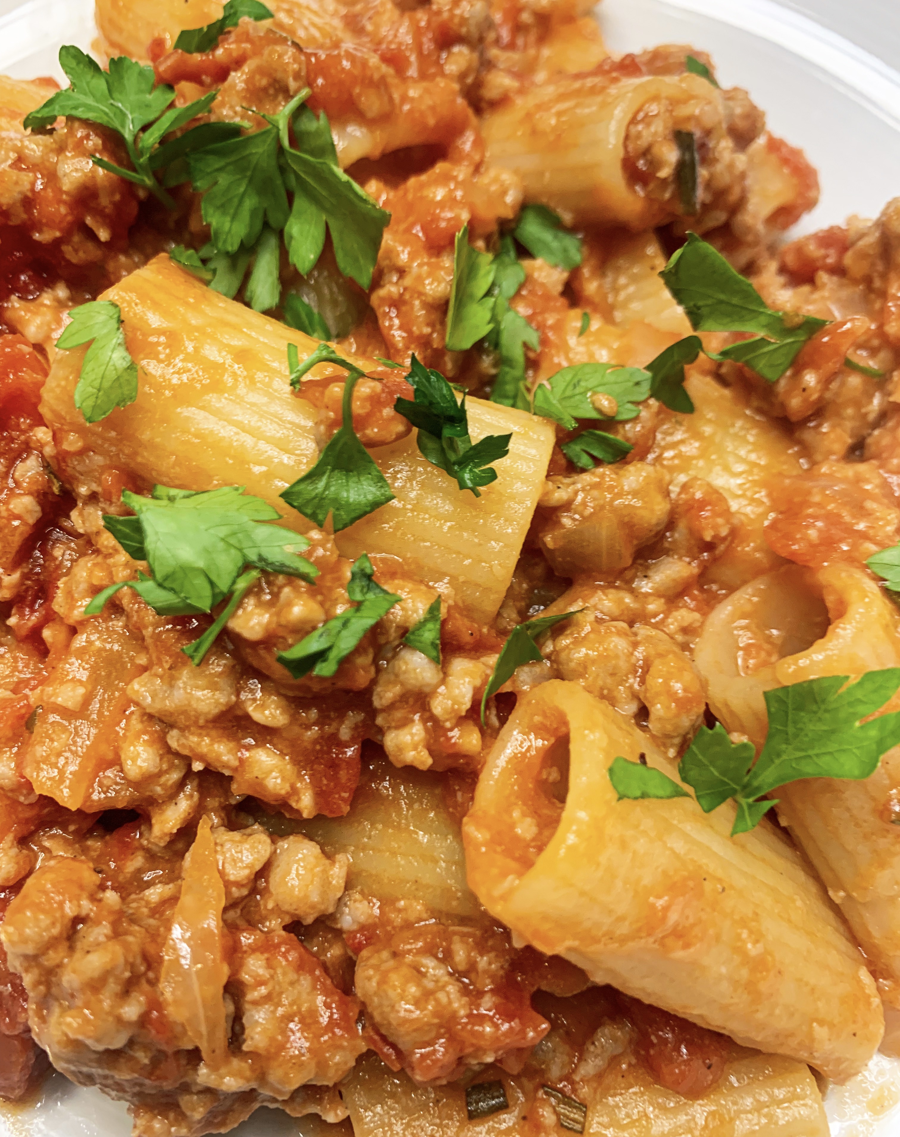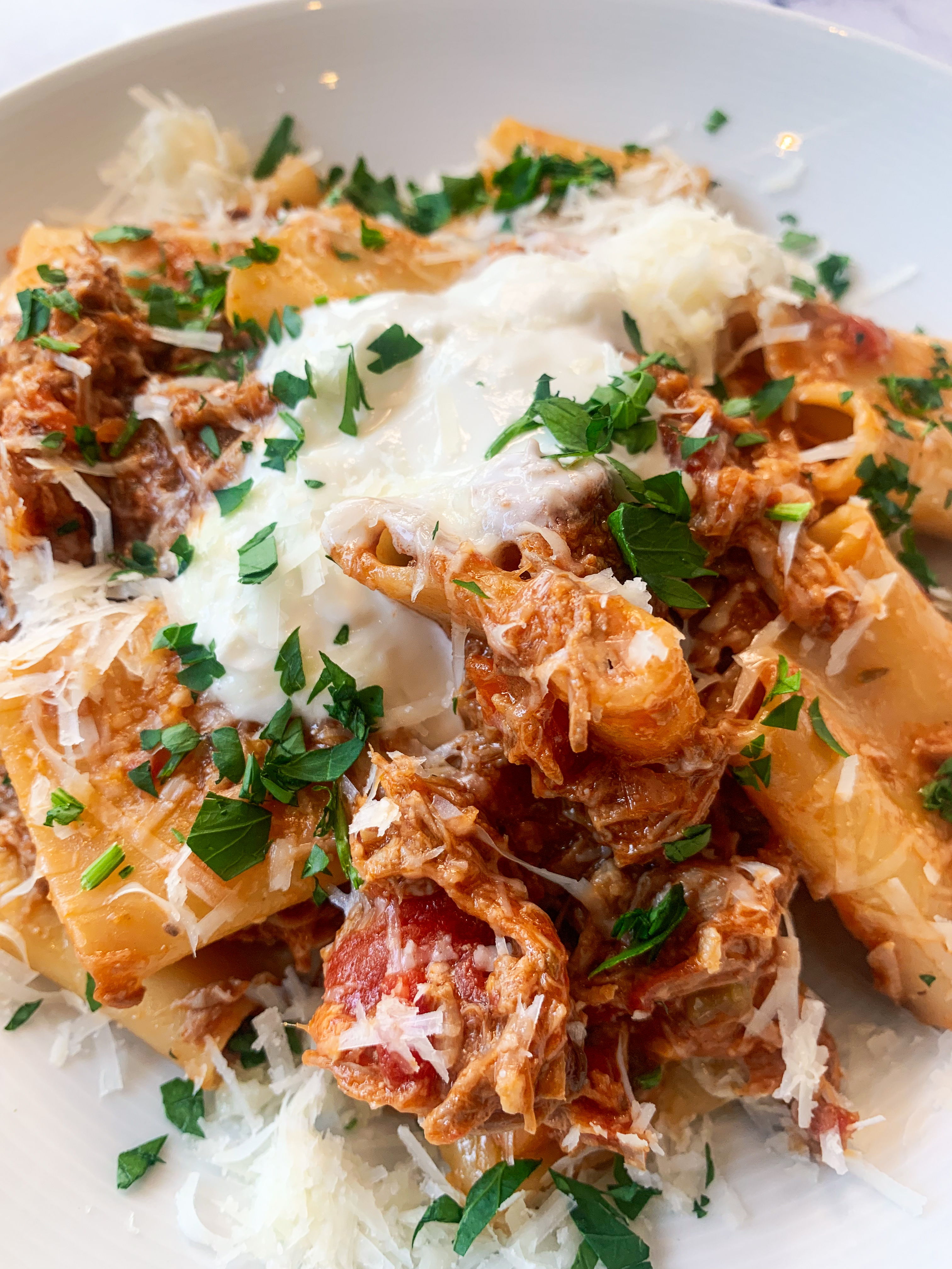 Rigationi with Pork Shoulder Ragu & Creamy Goat Cheese (Serves 6-8)