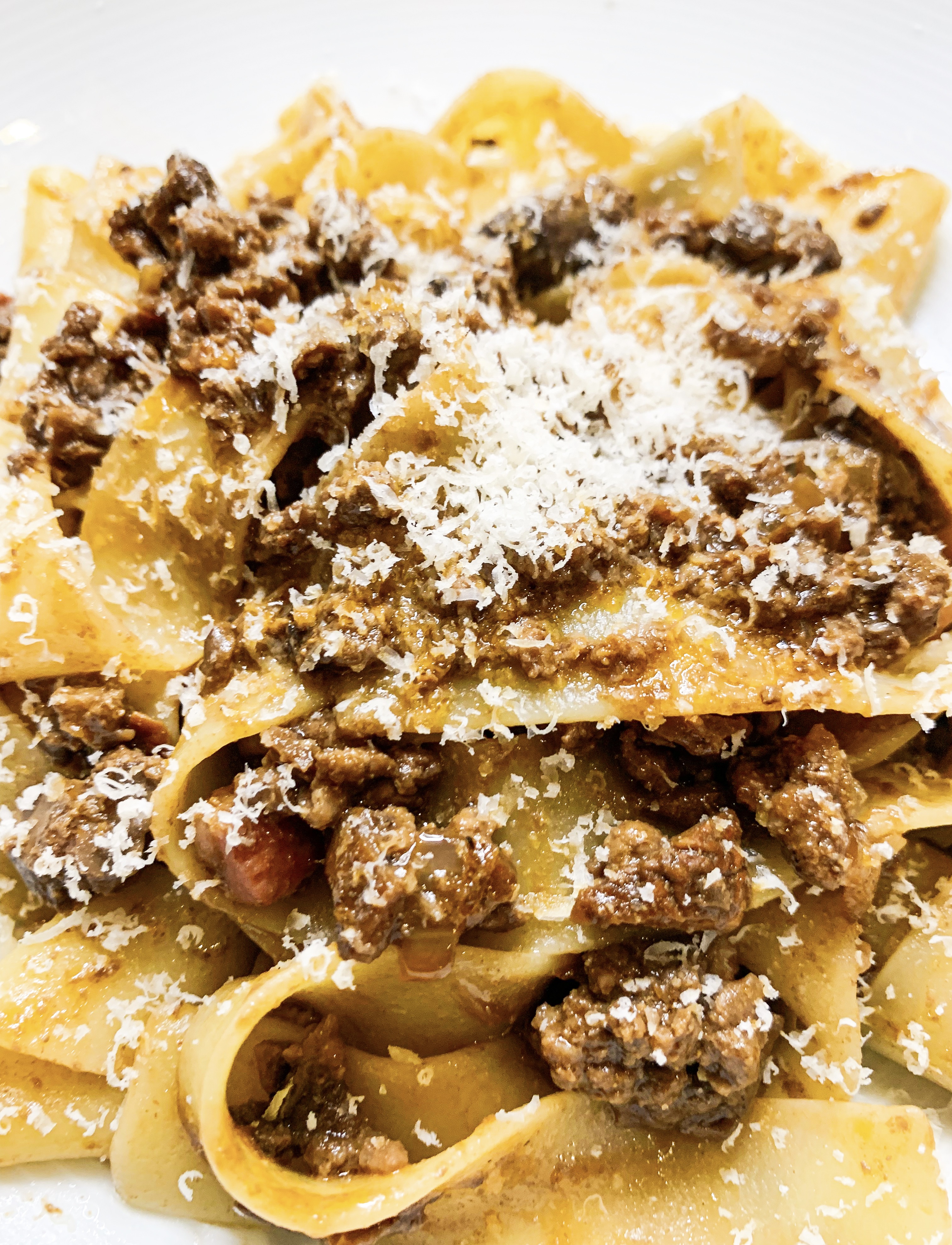 - To serve divide the pasta among bowls and pile each with the ragu. Top with some grated pecorino cheese and a dollop of goat cheese, season with freshly cracked black pepper.