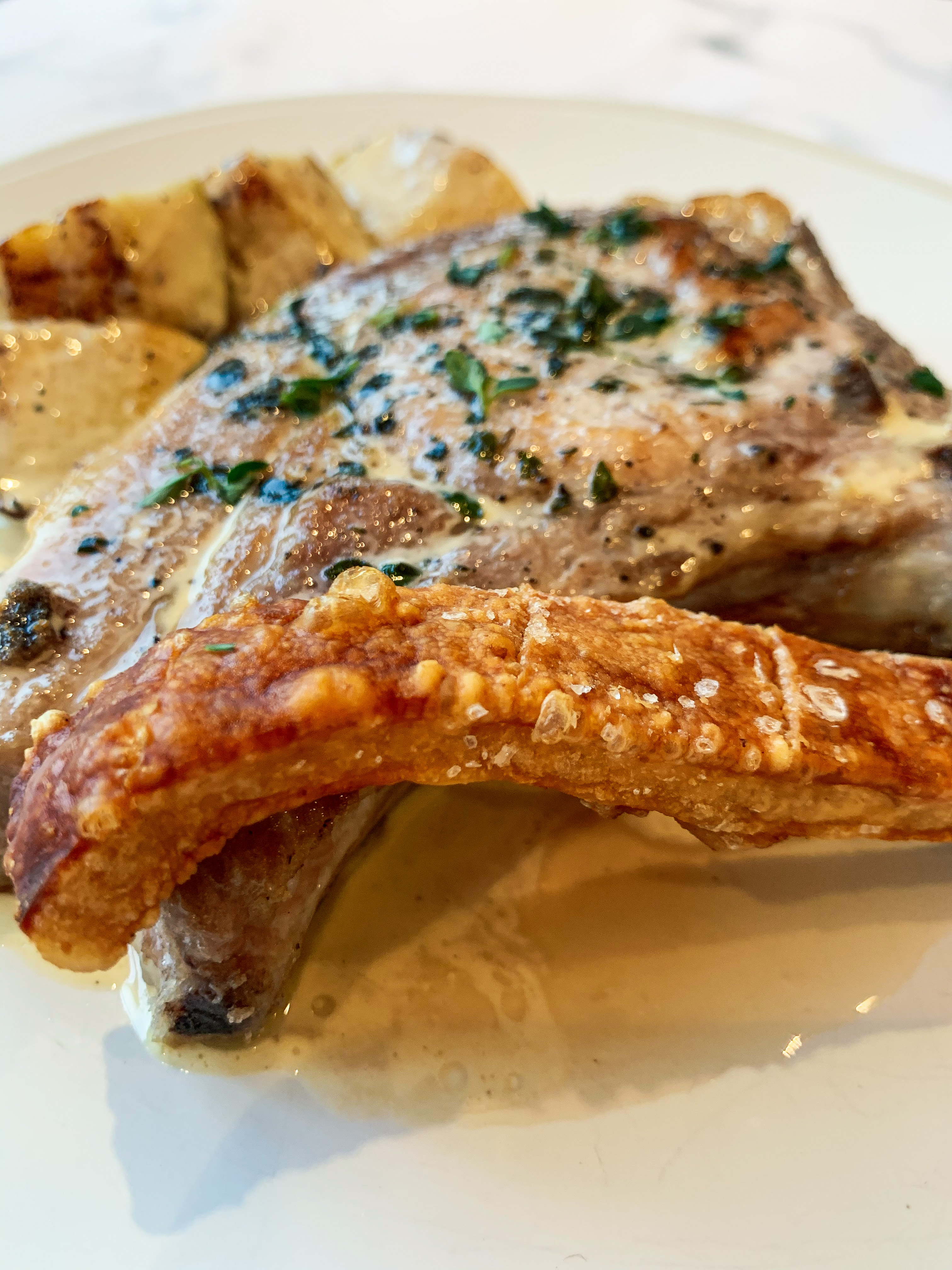 - Carve each chop and serve with the apple sauce, chimichurri and crackling.
