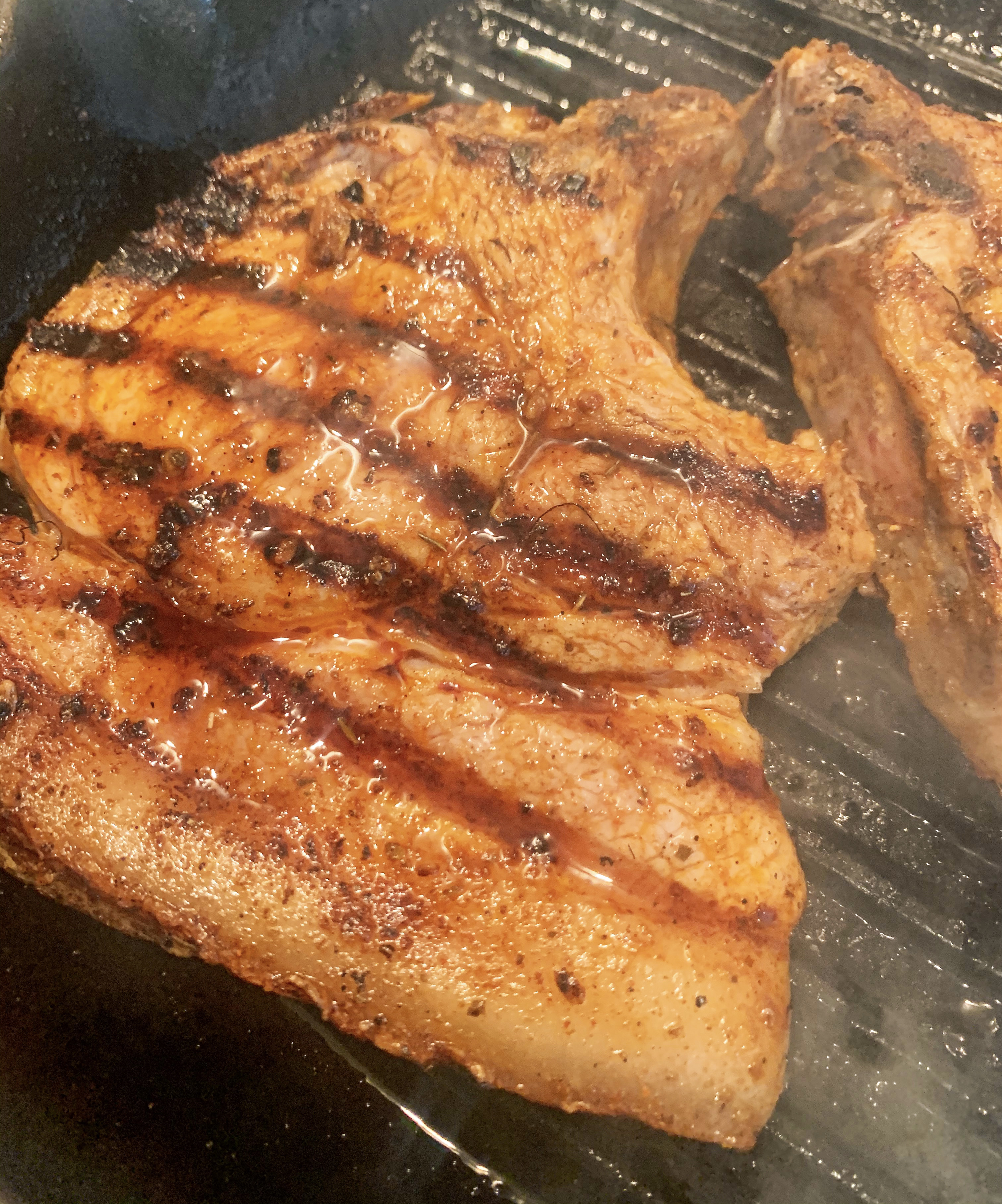 - Reheat the griddle pan until smoking hot and place the pork chops on the pan, griddle for 2-3 minutes, so they get lovely chargrilled marks, then turn and cook for a further 1-2 minutes, until the chops are cooked through.