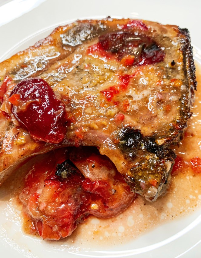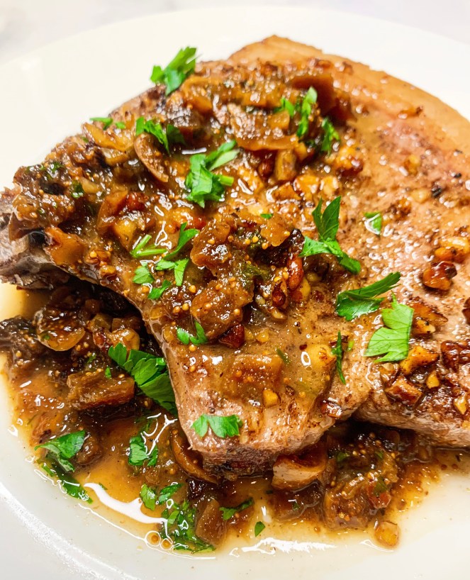 - Remove the pork chops to a warmed plated and cover with foil to keep them warm. Deglaze the pan with white wine, reduce by half, then add the chopped figs and chicken stock and season to taste. Finally, whisk in the butter, parsley and lemon juice.