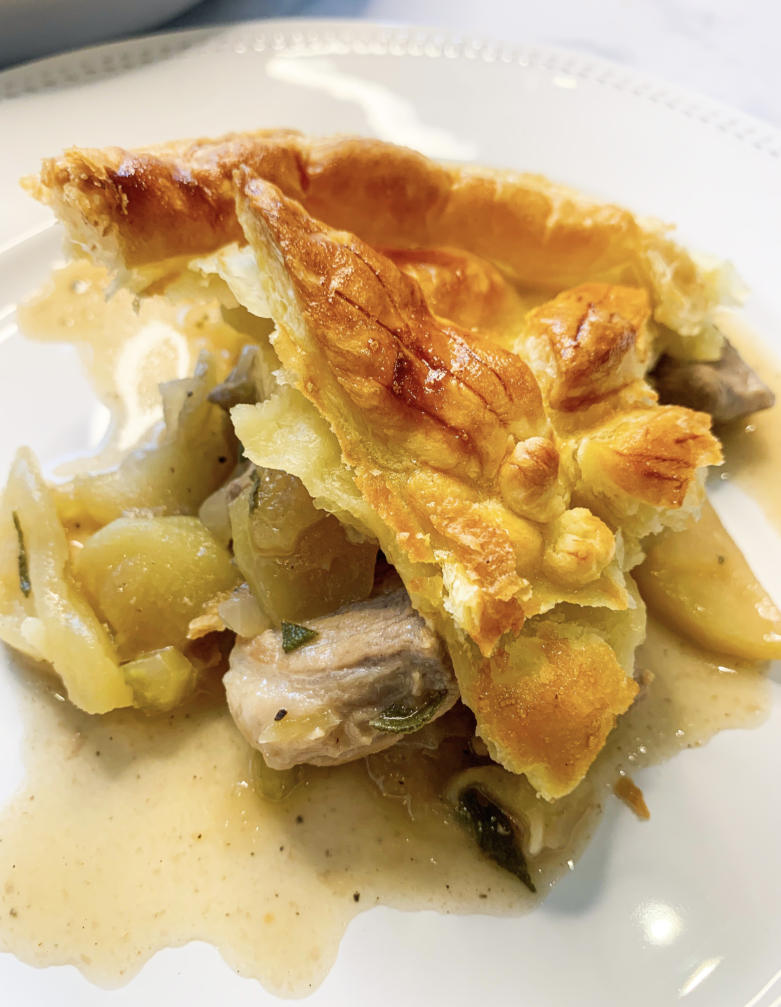 This pie takes full advantage of the wonderful affinity between pork and apple. The apples give the pie a subtle sweetness – unsurprisingly it’s become a firm favourite in our household! The recipe is from Paul Hollywood’s cookbook ‘Pies & Puds’. The original recipe calls for a ‘cider pastry’, I have tried it with this, but I didn’t think it was that special and it definitely didn’t warrant the extra time needed to make it. So I use ready rolled puff pastry and I suggest you do the same!…(I’m gluten free so I can’t eat the pastry, occasionally I use ‘Jus Roll’s Gluten Free Puff Pastry’, but if I’m to be honest it’s not as delicious as the regular version, so I tend to eat the filling with some buttered new potatoes – thus leaving Nick and Felix to fight over my left over pastry!!)