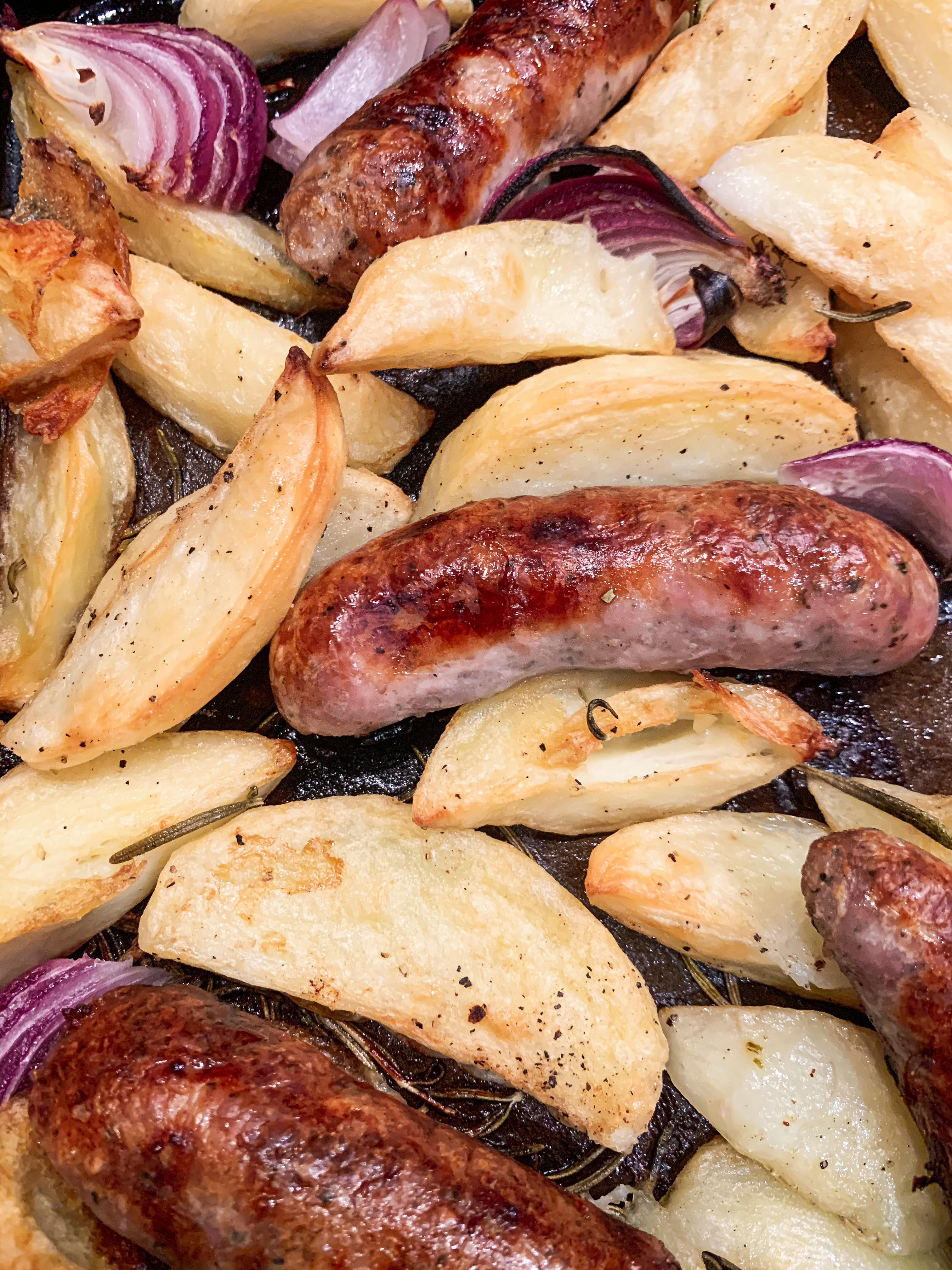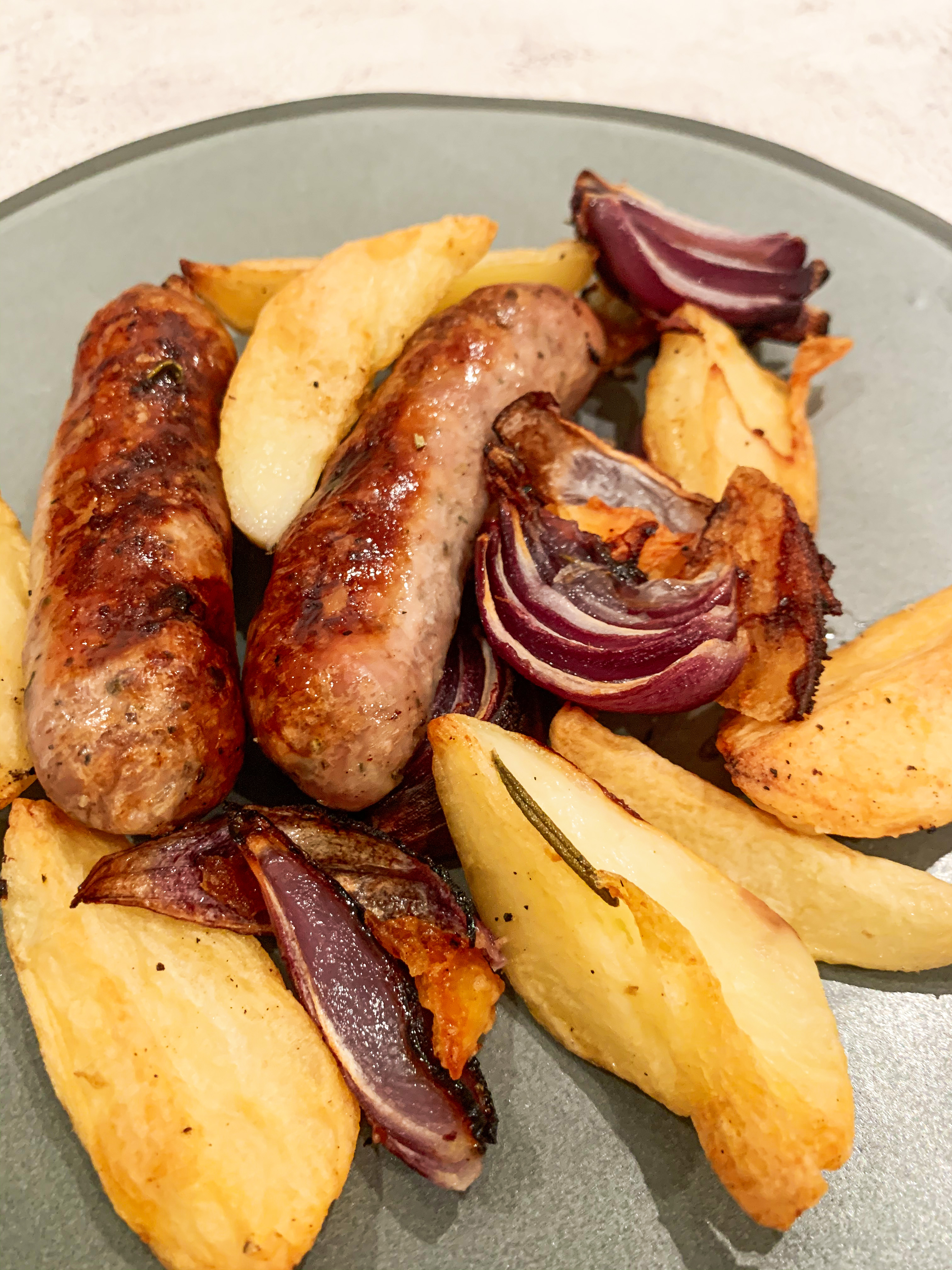 Simple Sausages with Roasted Potato & Onion Wedges (Serves 1)