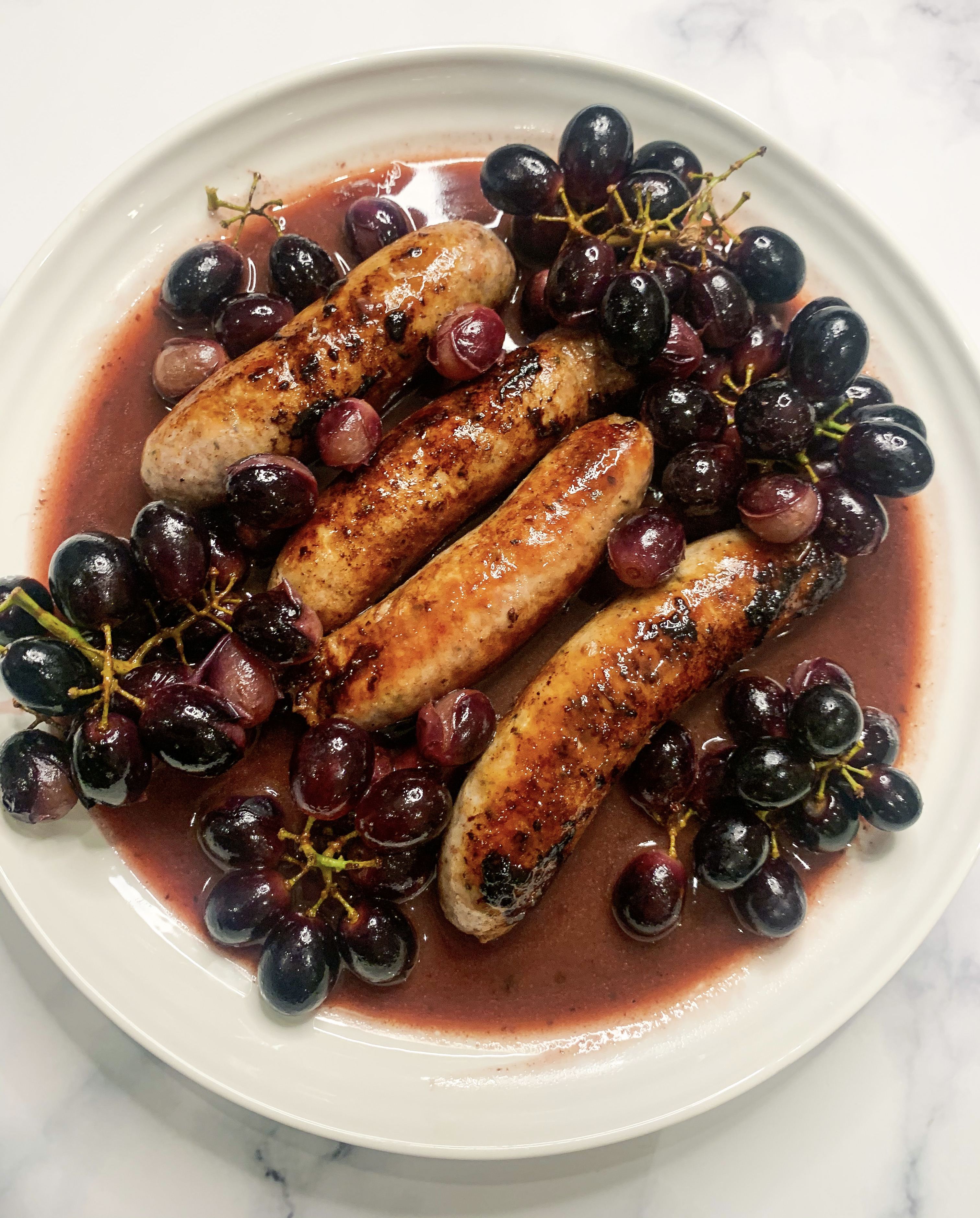 - Bring to the boil, then reduce the heat to low and simmer gently, uncovered, for 15-20 minutes until the sausages are cooked through and the wine has evaporated by half. Remove the sausages and grapes to a serving dish with a slotted spoon, leaving behind the cooking juices.