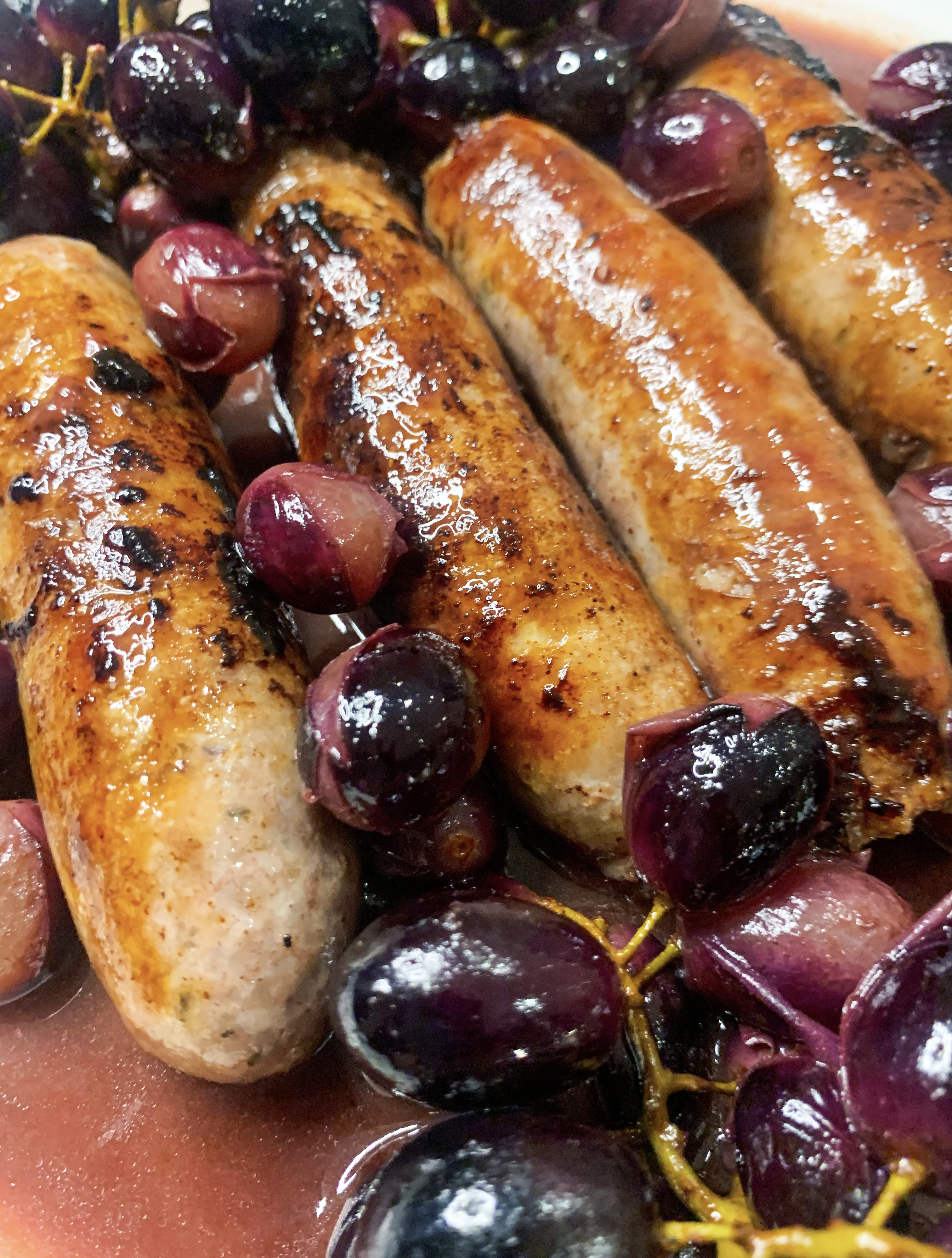 - To make the sauce, mix the cornflour with a tablespoon of cooking liquid in a small bowl, then add this to the juices in the pan. Bring to the boil, stirring, and simmer for 2 minutes until thickened. Serve with the sausages and sweet grapes.