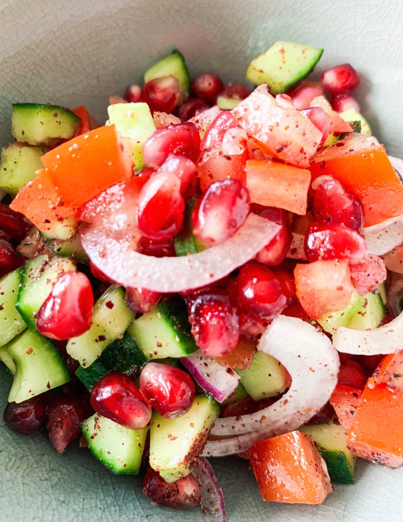 - Place the cucumber, tomato and red onion in a bowl. Drizzle with a little olive oil, season with the salt and pepper and pour over the lemon juice then give everything a good mix. Finally, sprinkle over the pomegranate seeds and sumac and refrigerate for at least 20 minutes, as it’s best served chilled.