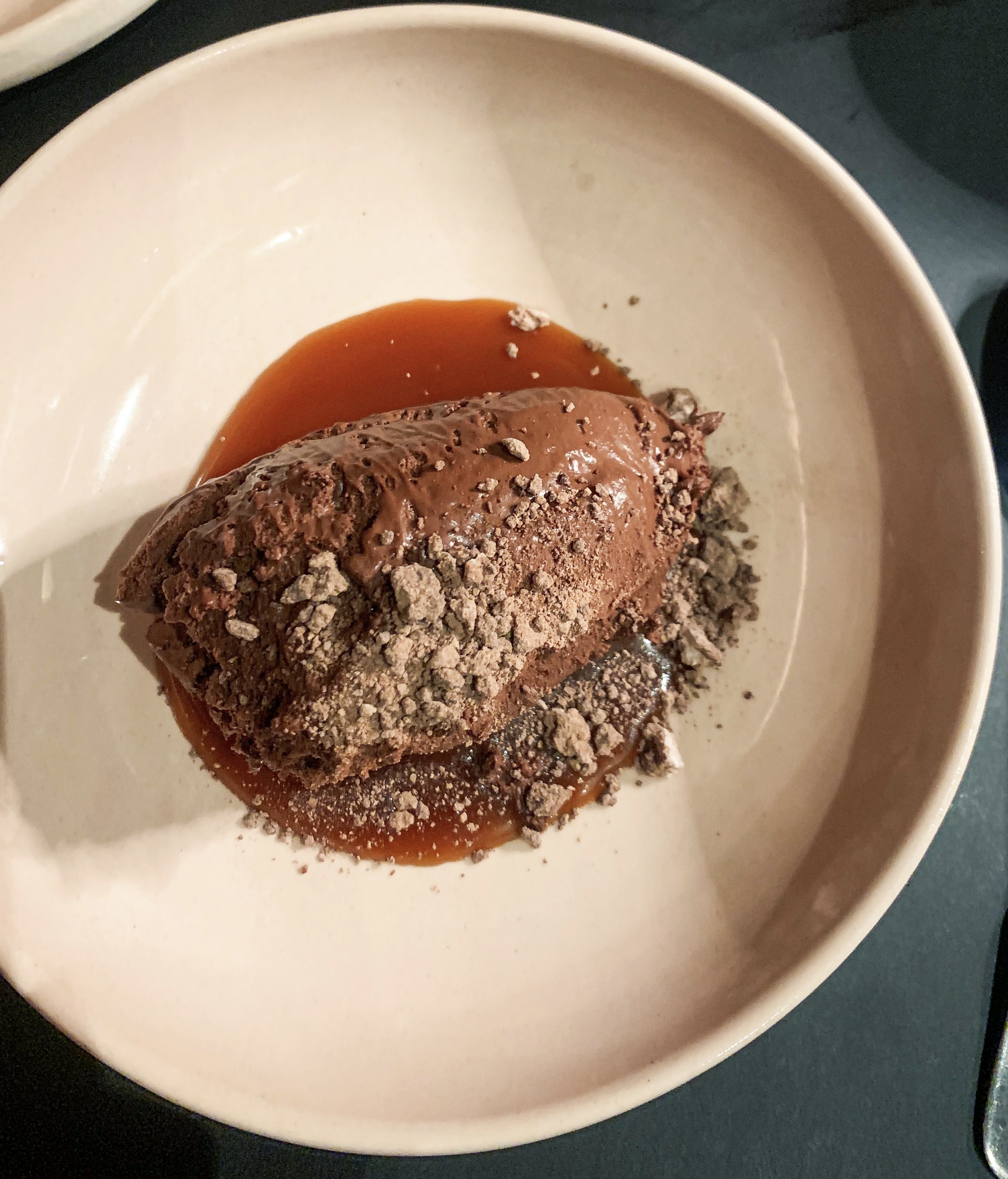 Before our first course we were presented with a selection of amuse bouche – ‘Farm Radishes with Whipped Sesame’, ‘Trout & Turnip Roll with Japanese Artichoke’, ‘Black Garlic and Togarashi’ – all very fresh and flavoursome. These were followed by the kick of a ‘Roasted Vegetable Tea with Burnt Garlic Oil’, this was a sweet and salty, beautifully balanced broth. Our next course, ‘Tokyo Turnip, Almond Praline and Ricotta’, was presented as a flower and was almost too stunning to eat; the flavours didn’t disappoint! ‘White Onion Royale, Broad Beans and Wild Garlic’, was a wonderful light foam and, although just a small interlude before our main course, it was packed with flavour; the white onion and wild garlic were beautifully balanced by the broad beans. Our meal had so far been outstanding, in terms of both flavour and presentation, so the main course had a lot to live up to… all I can say is ‘wow’, ‘Roast Chicken, Hen of the Woods, Bearnaise Chicken Sausage, Cider Mustard’, was a sublime dish, the ‘chicken sausage’ was something that I could happily eat for breakfast (lunch and dinner!). Finally, dessert, ‘Pump Street Chocolate Tart’; with its crisp pastry shell and rich chocolate mousse filling it was exactly how any good tart should be!