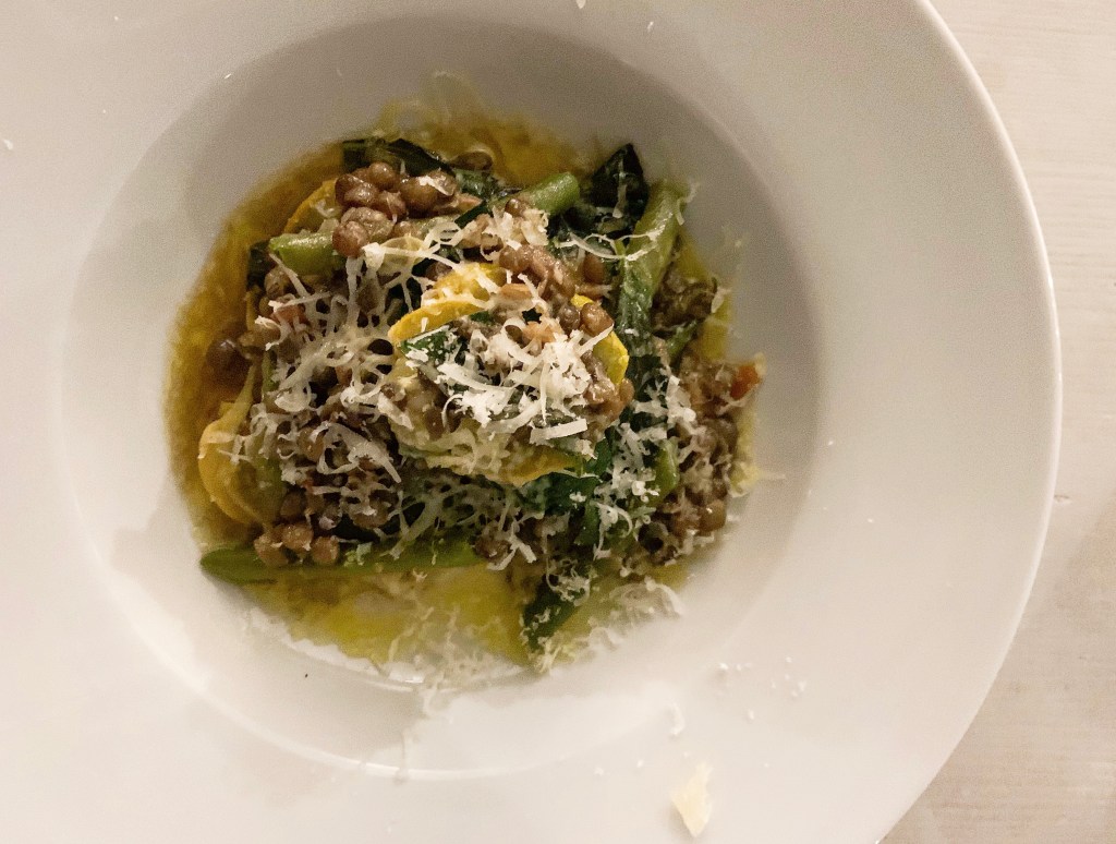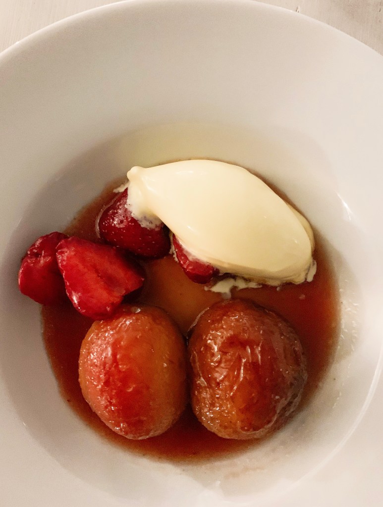 We enjoyed a fantastic meal, starting with a Salad of Tomato, Goats Curd & Herbs – the flavours were beautifully lifted by the addition of the dill and mint. This was followed by Pappardelle with Courgette & Cora Linn (a salty sheep’s milk cheese). As I am gluten free I didn’t have this dish (although my fellow diners assured me it was delicious), instead I was served a Warm Salad of Lentils with Courgette, Beans and the aforementioned Cora Linn – it was extremely good, with salty overtones from the cheese. For our main course we enjoyed Roast Romney Lamb from Suffolk, with Green Beans, Dijon & Almonds; a simple dish but with beautiful, clean flavours. We opted for the additional cheese course, Brightwell Ash Goats Cheese with Sourdough Crisps and Pickled Cherries, I had never tasted pickled cherries before, and I discovered that they are a lovely, tangy accompaniment to a creamy cheese. Finally for dessert, we tucked into Baked Plums and Strawberries with a dollop of thick cream – a truly tasty, British pudding! Our meal was complemented by bottles of their Pinot Blanc and Pinot Noir, both bioganic wines, which although still very young and rather crisp, complemented the simple yet very tasty flavours of our food.