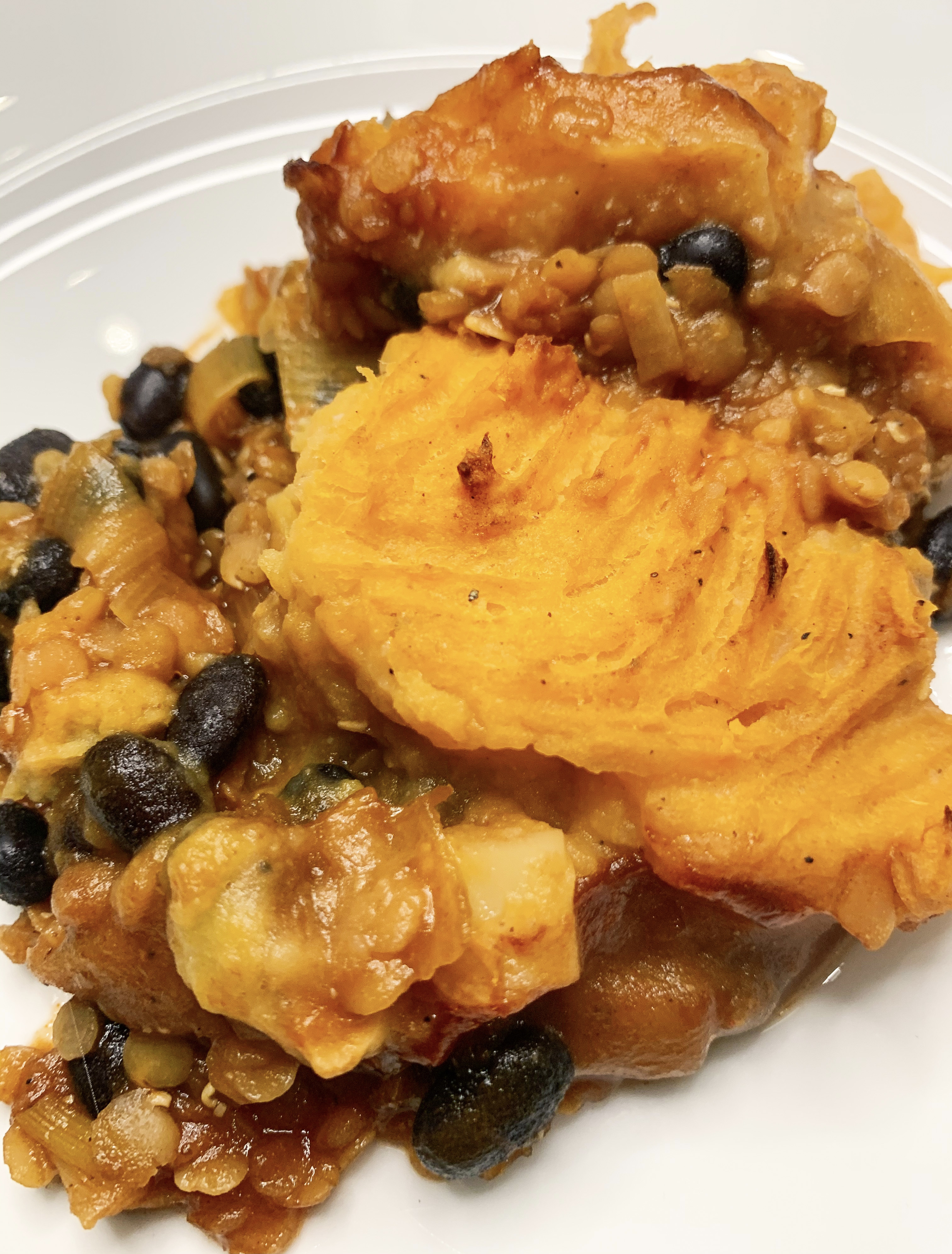 Bean and Lentil Bake with Sweet Potato Mash (Serves 4)