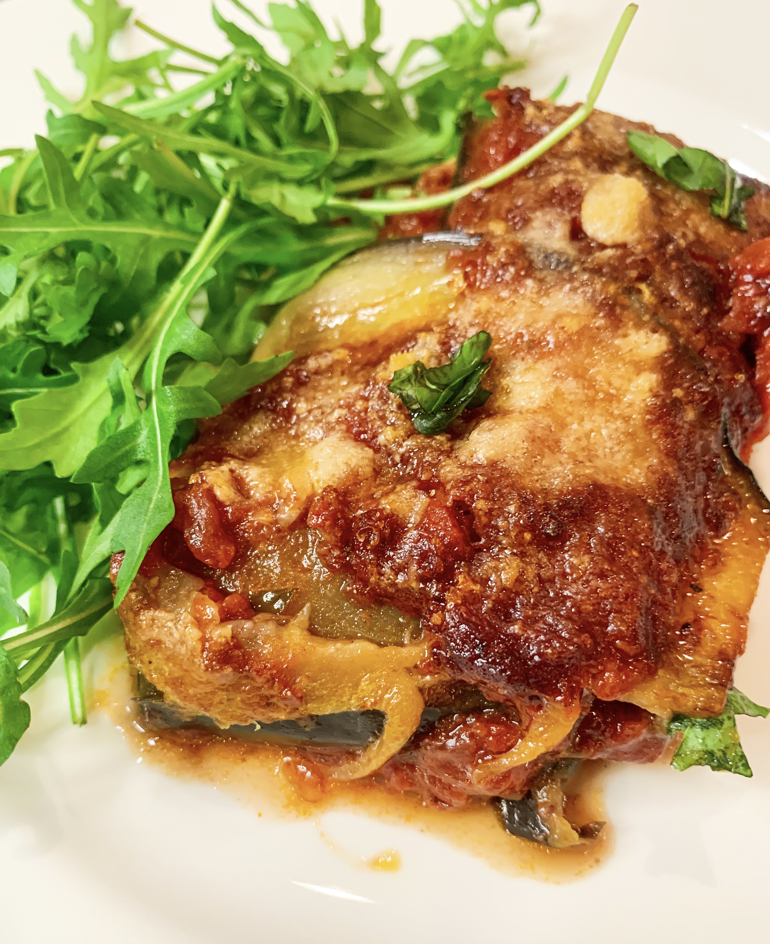 With the wonderful mix of tomato, parmesan, mozzarella and aubergine, the flavours of this dish will brighten any day! Simply serve with a well-dressed green salad. I like to fry half of the aubergine slices and blanch the other half, in this way the parmigiana isn’t too oily yet still very tasty. Simply leave out the breadcrumbs for a gluten free option.