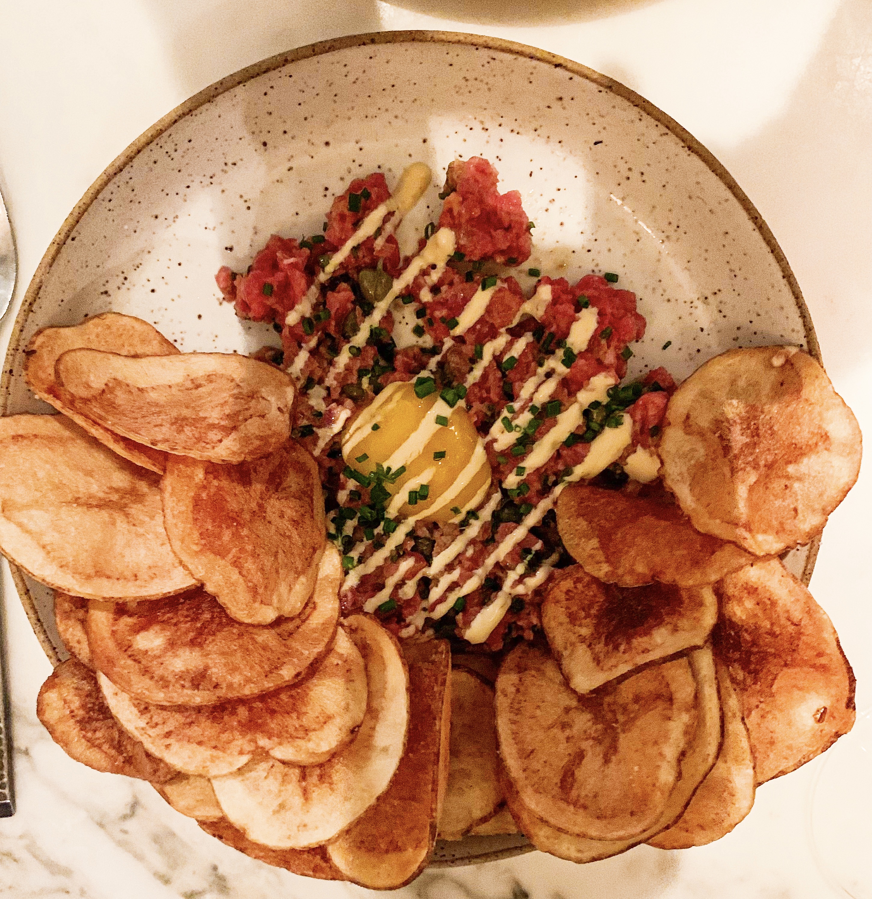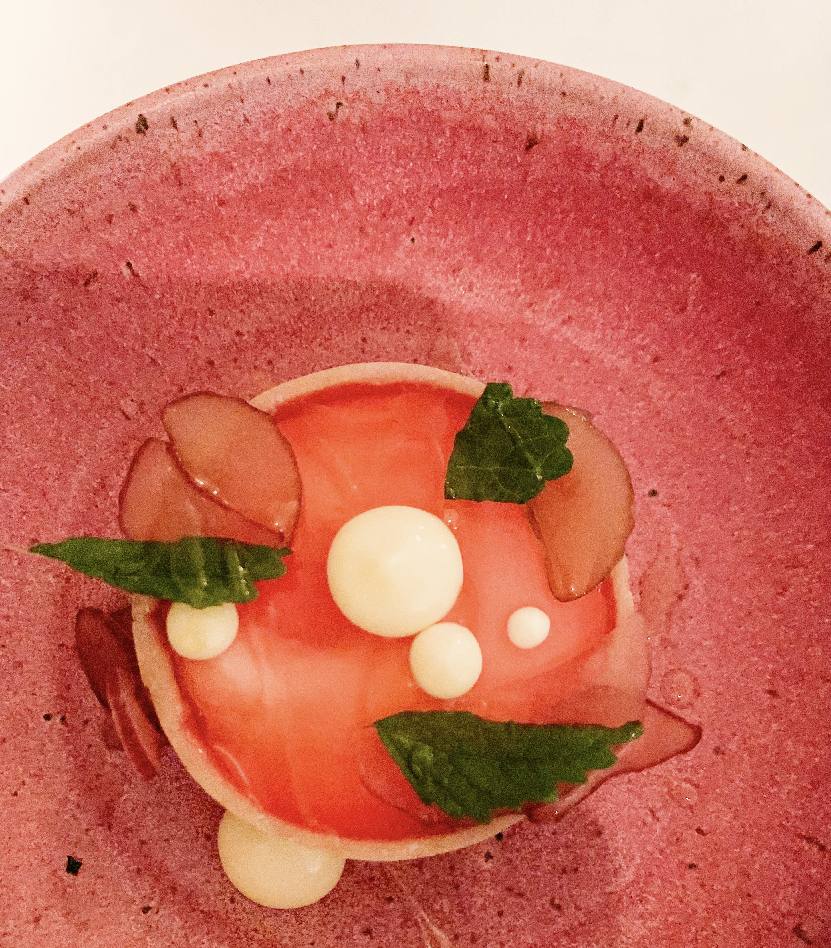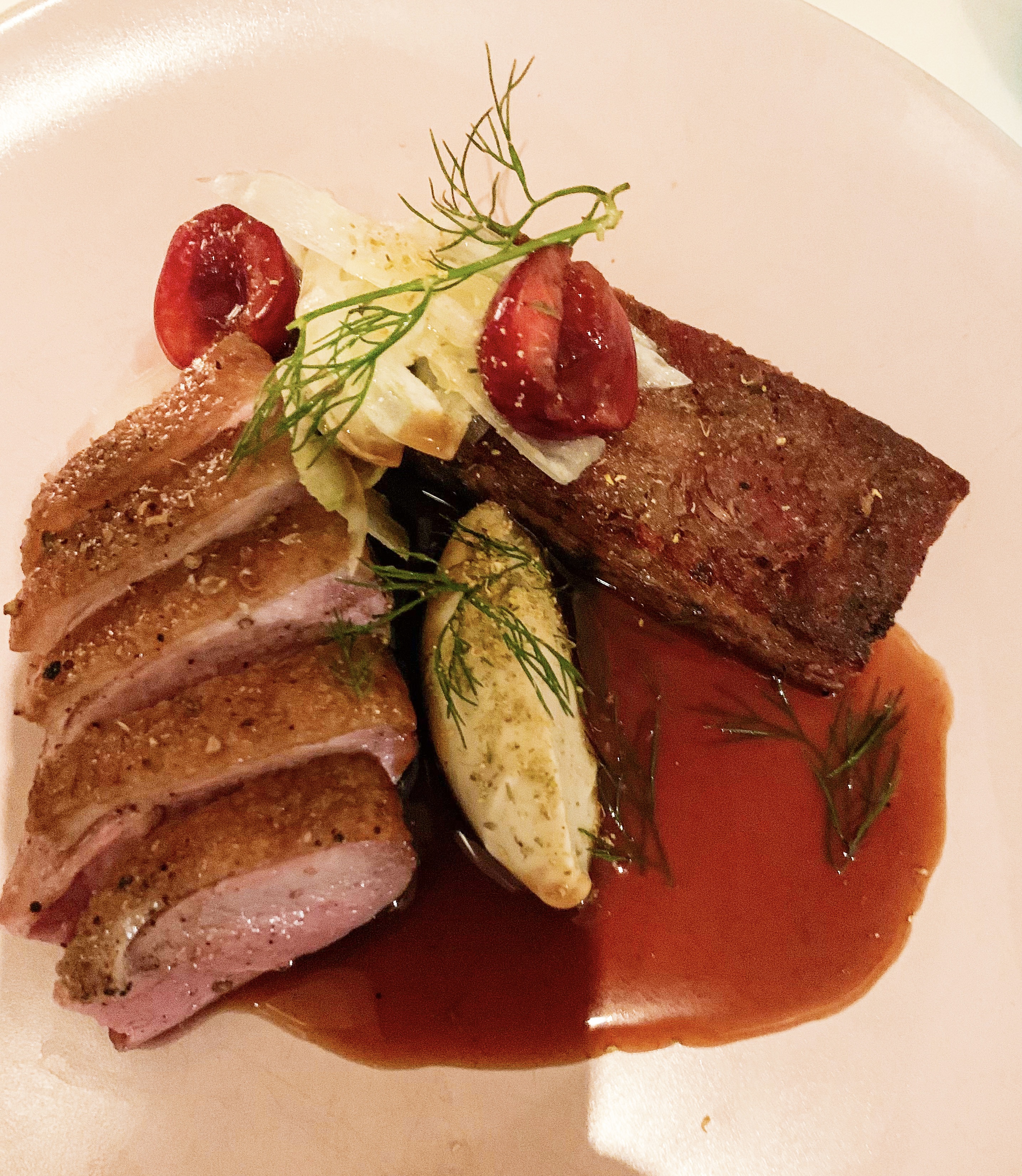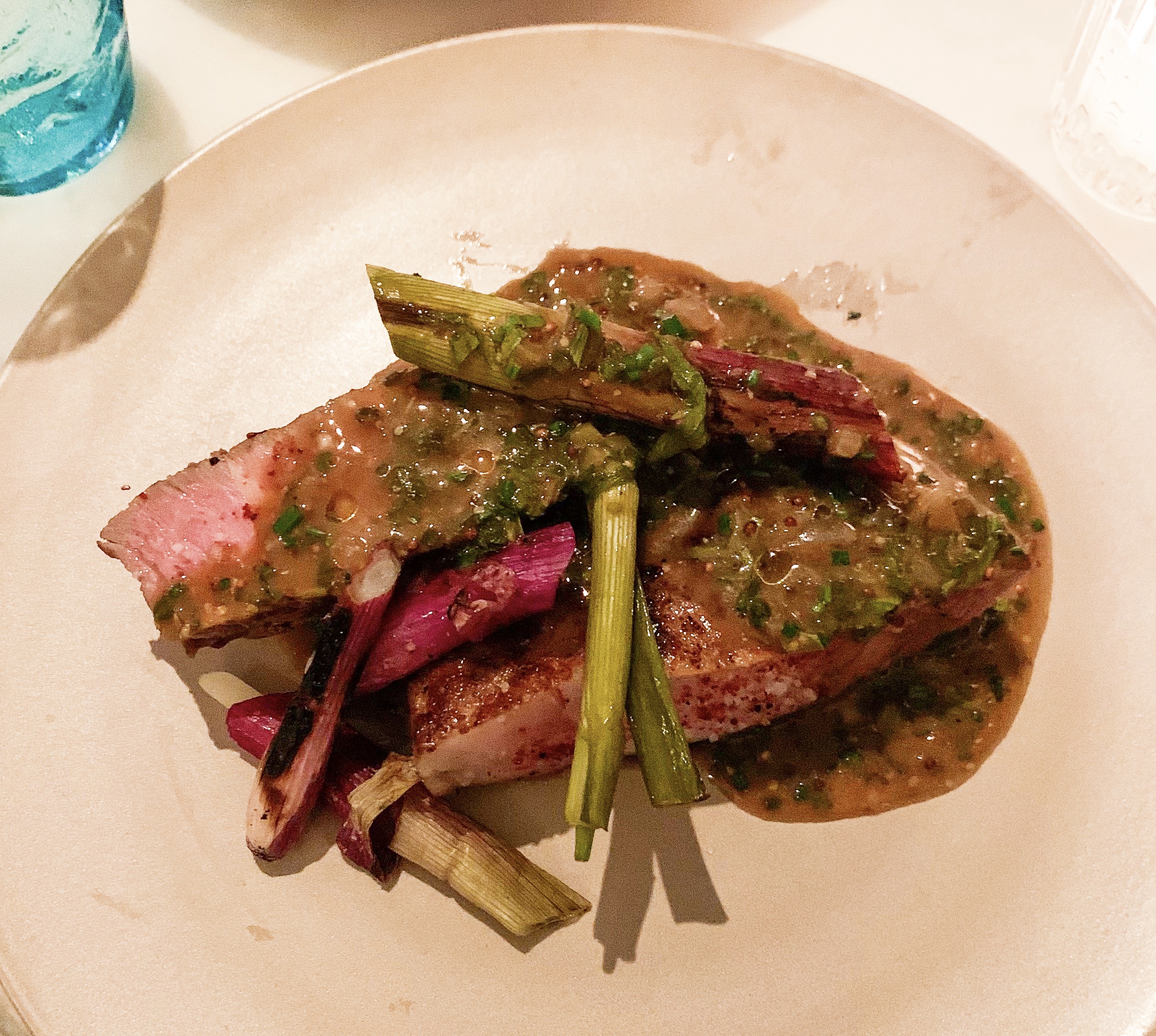 We began with the ‘Steak Tartare, Fermented Chilli, Capers, Potato Chips’ – this was fantastic, seasoned to perfection, the best I’ve had in a long time, whilst ‘Broccolini, Burrata, Red Miso, Preserved Lemon’, was pieces of Burrata mixed with the broccolini and dressed with a hollandaise sauce, which was light and citrusy – it was deliciously fresh. Our main courses were no less thrilling, there was ‘Duck, Cauliflower, Fennel, Cherry’; the subtle sweetness of the cherry perfectly matched the breast of duck which was served with a rich, flavoursome confit. ‘Berkshire Pork, Spring Onions, Sauce Charcutiére’, was a tender pork chop which was well matched by the slightly tart sauce, I reminded myself that I must make this gherkin and mustard sauce at home! Often I find the size of the portions in America ridiculously big, and so I struggle to finish a meal but fortunately, at Lutéce the servings were generous but not overly – we were comfortably full and could still enjoy dessert…a delicious ‘Chocolate Ganache’, its rich sweetness was cut by a dash of salt, and equally good was ‘Cheese Tart, Rhubarb & Lemon Balm’.